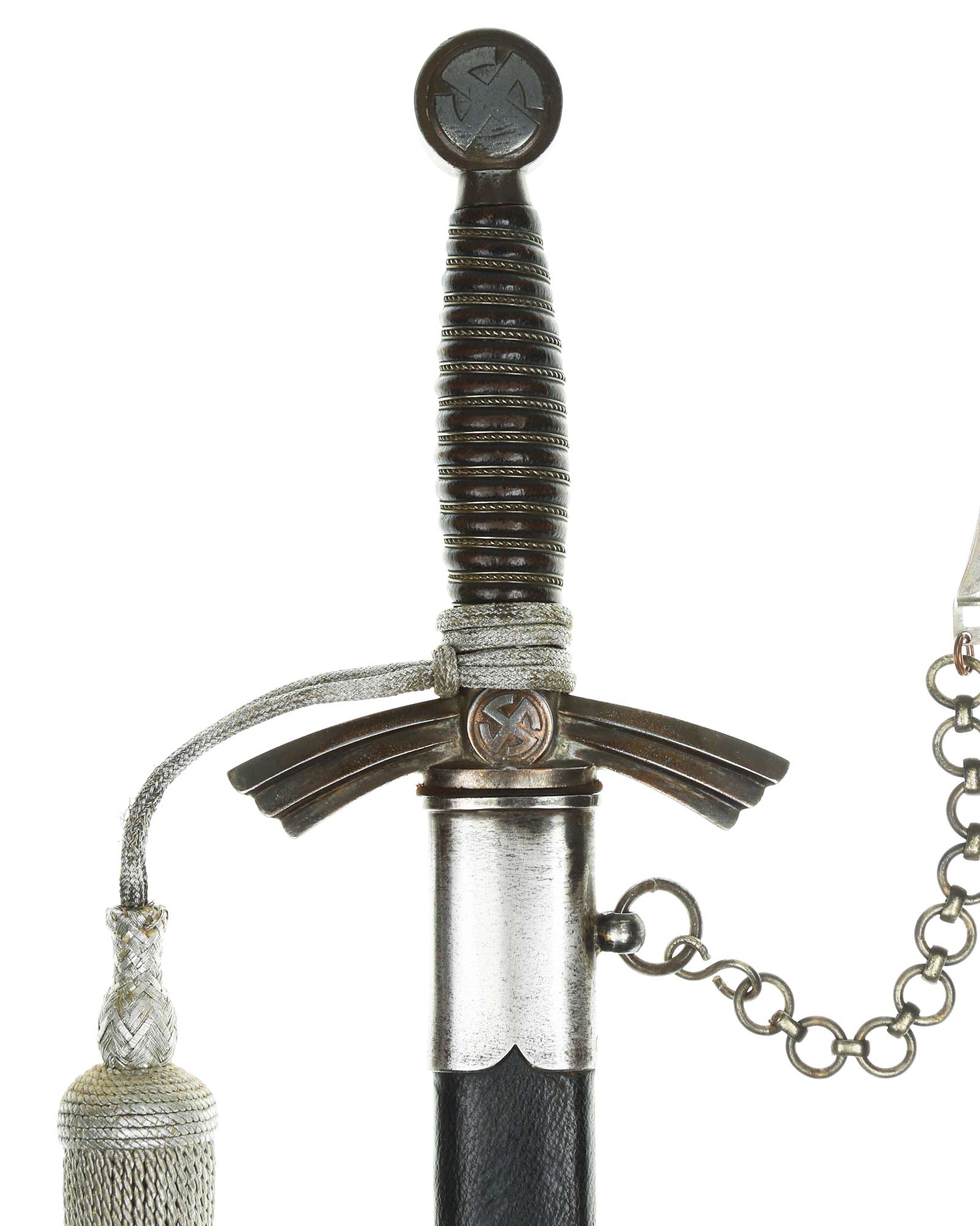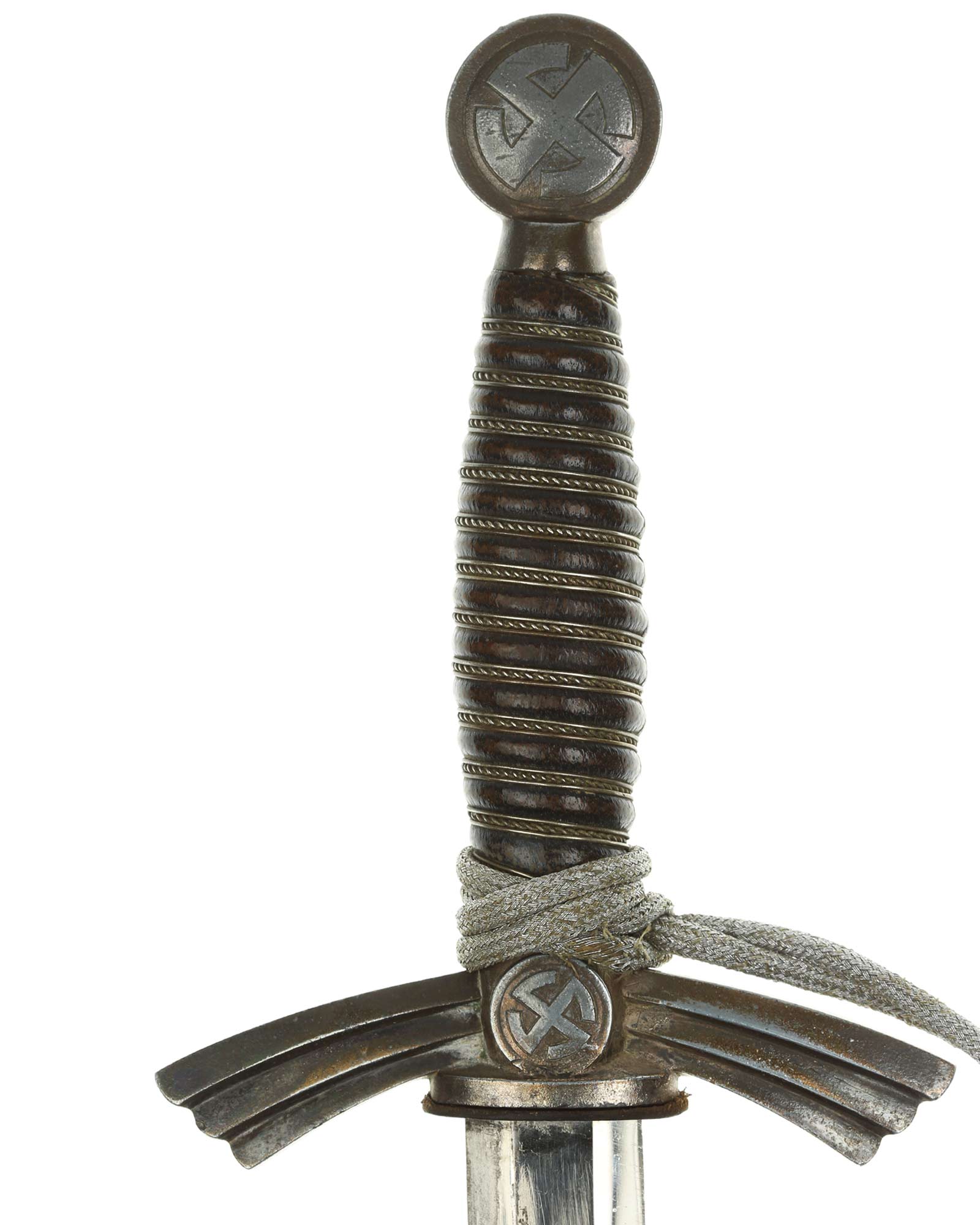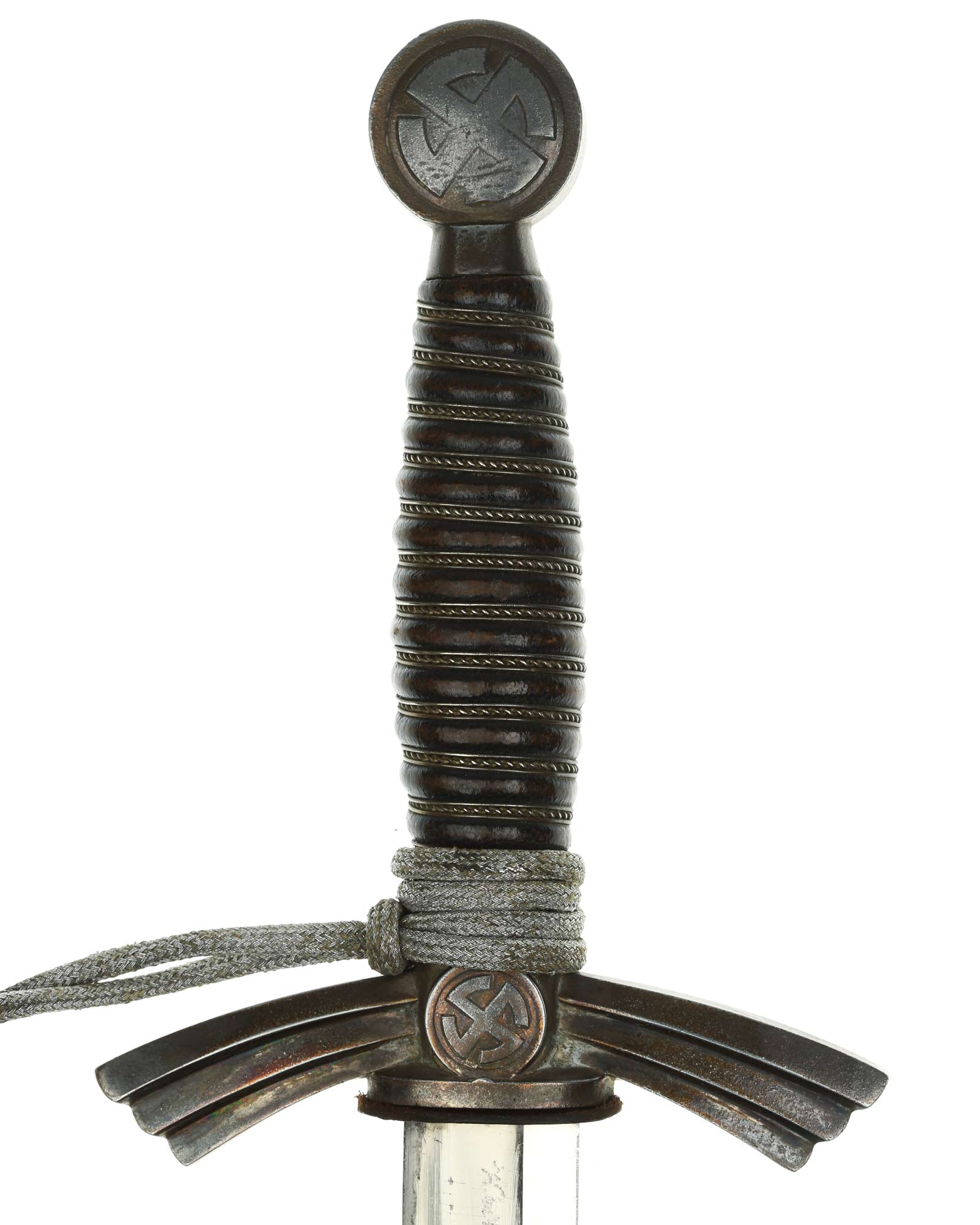 Рукоять: Рукоять деревянная, бочкообразная, покрытая темно-синей кожей, по желобкам обмотана проволокой. Нижняя гайка цилиндрическая, верхняя гайка коническая и составляет одно целое с круглой плоской головкой, навинчивающейся на хвостовик клинка. На обеих сторонах головки имеются вписанные в круг свастики. Крестовина литая, выполнена в виде трех наложенных друг на друга дужек, с загнутыми вниз концами. На перекрестье с обеих сторон на круглых медальонах имеется уменьшенное изображение свастики, как на головке. Под перекрестьем расположена массивная овальная шайба, отлитая вместе с крестовиной.