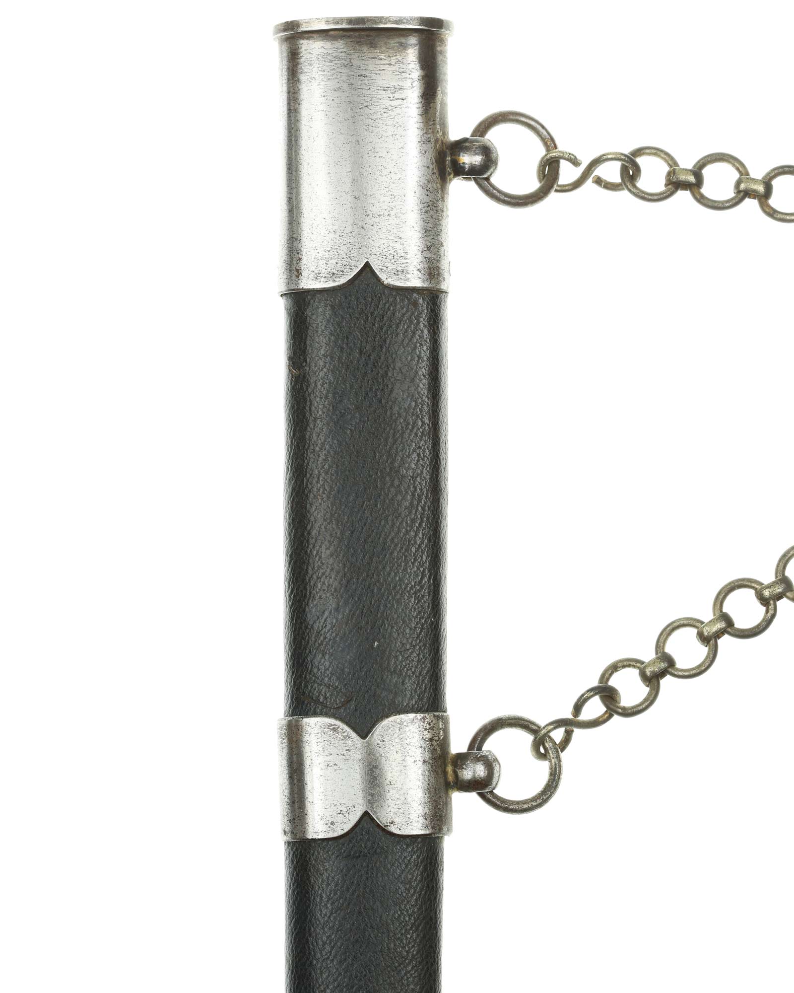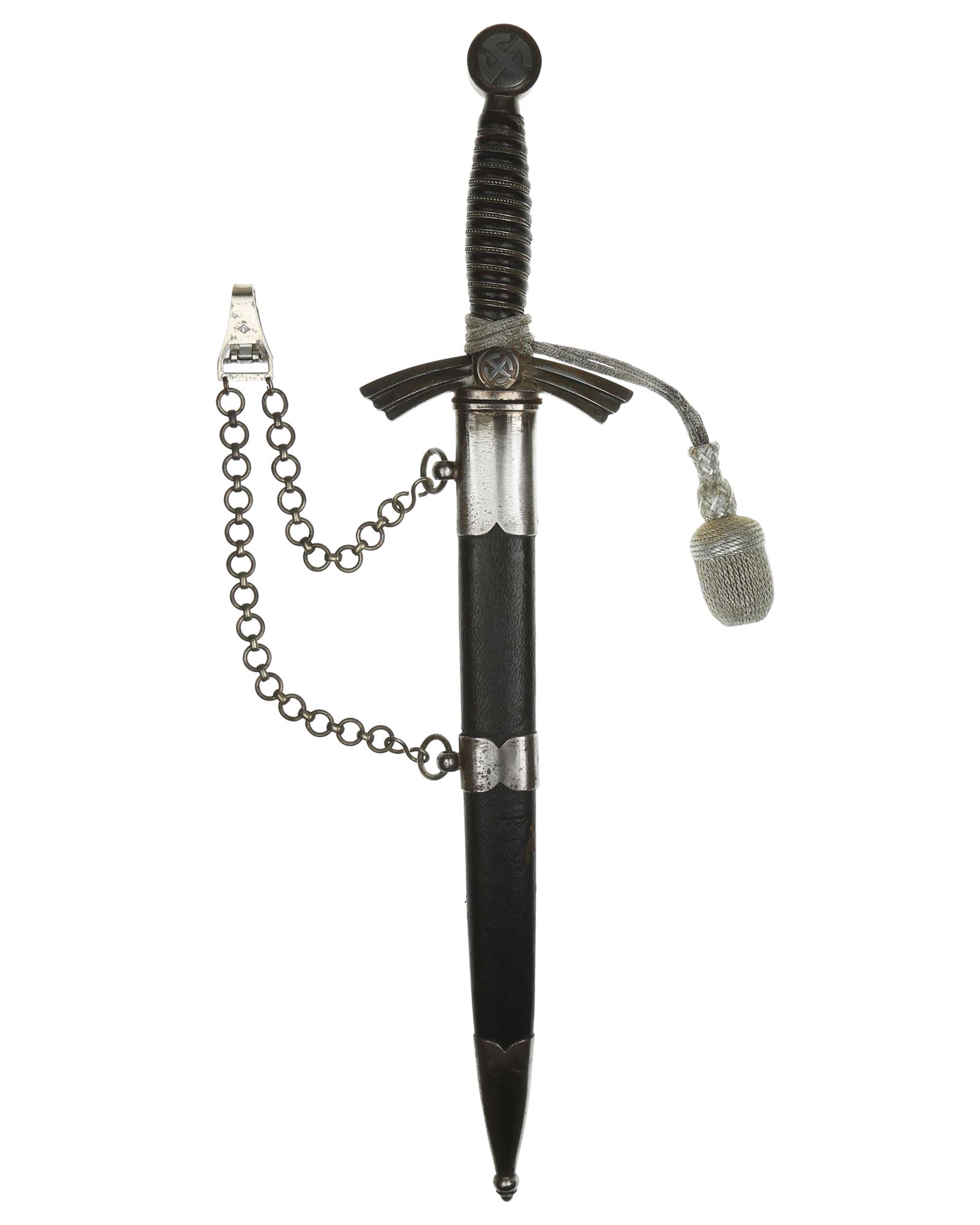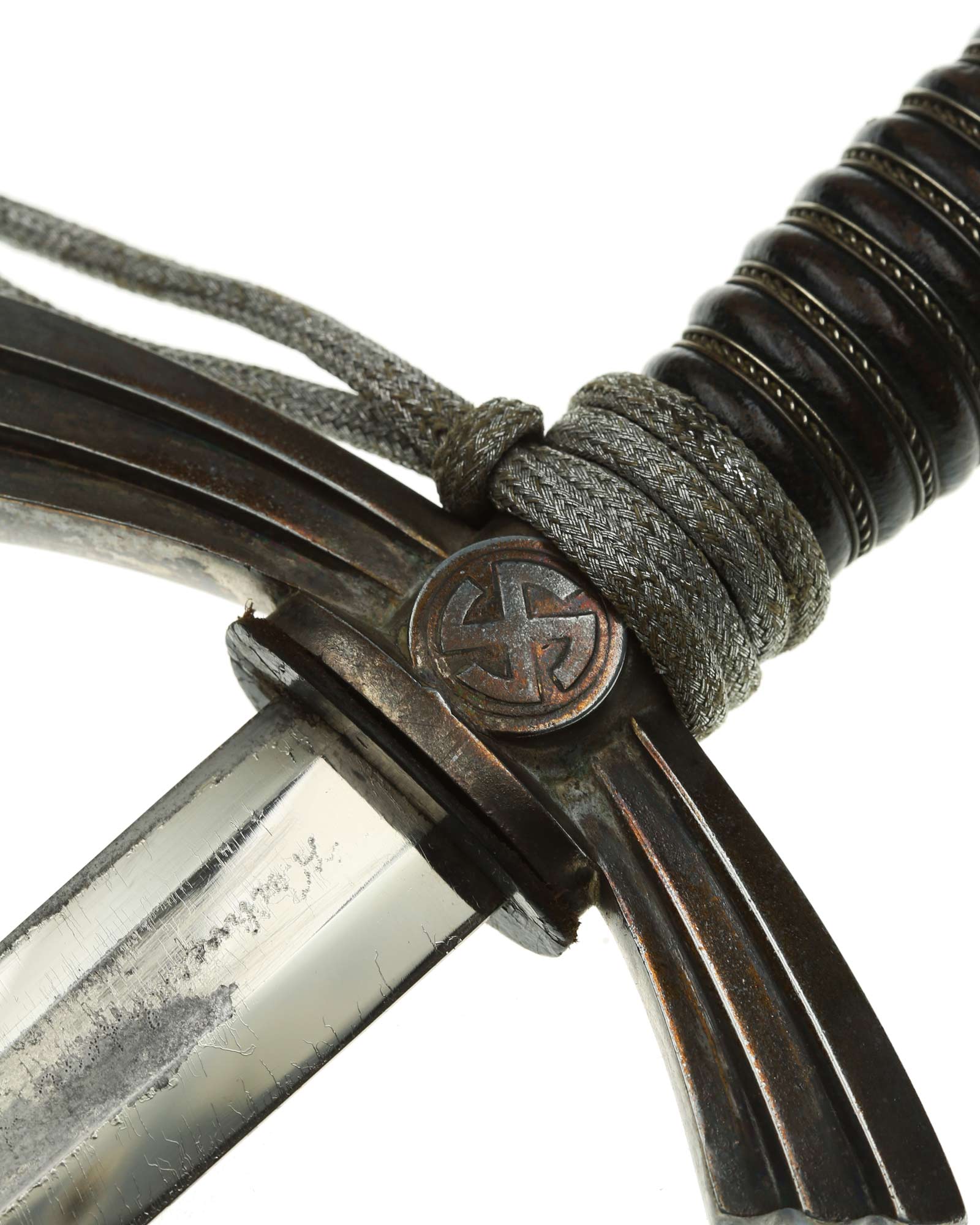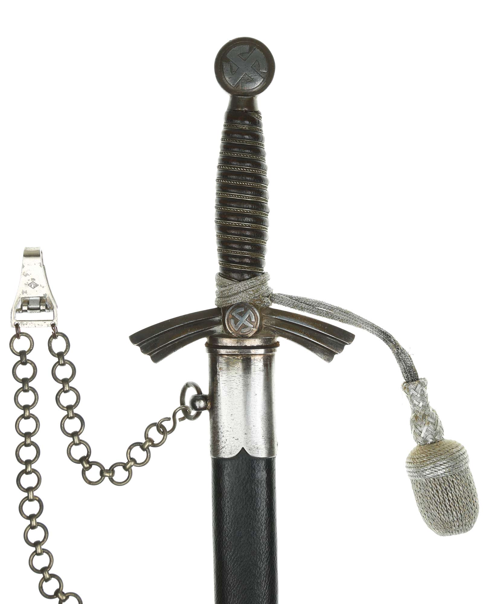 Рукоять: Рукоять деревянная, бочкообразная, покрытая темно-синей кожей, по желобкам обмотана проволокой. Нижняя гайка цилиндрическая, верхняя гайка коническая и составляет одно целое с круглой плоской головкой, навинчивающейся на хвостовик клинка. На обеих сторонах головки имеются вписанные в круг свастики. Крестовина литая, выполнена в виде трех наложенных друг на друга дужек, с загнутыми вниз концами. На перекрестье с обеих сторон на круглых медальонах имеется уменьшенное изображение свастики, как на головке. Под перекрестьем расположена массивная овальная шайба, отлитая вместе с крестовиной.