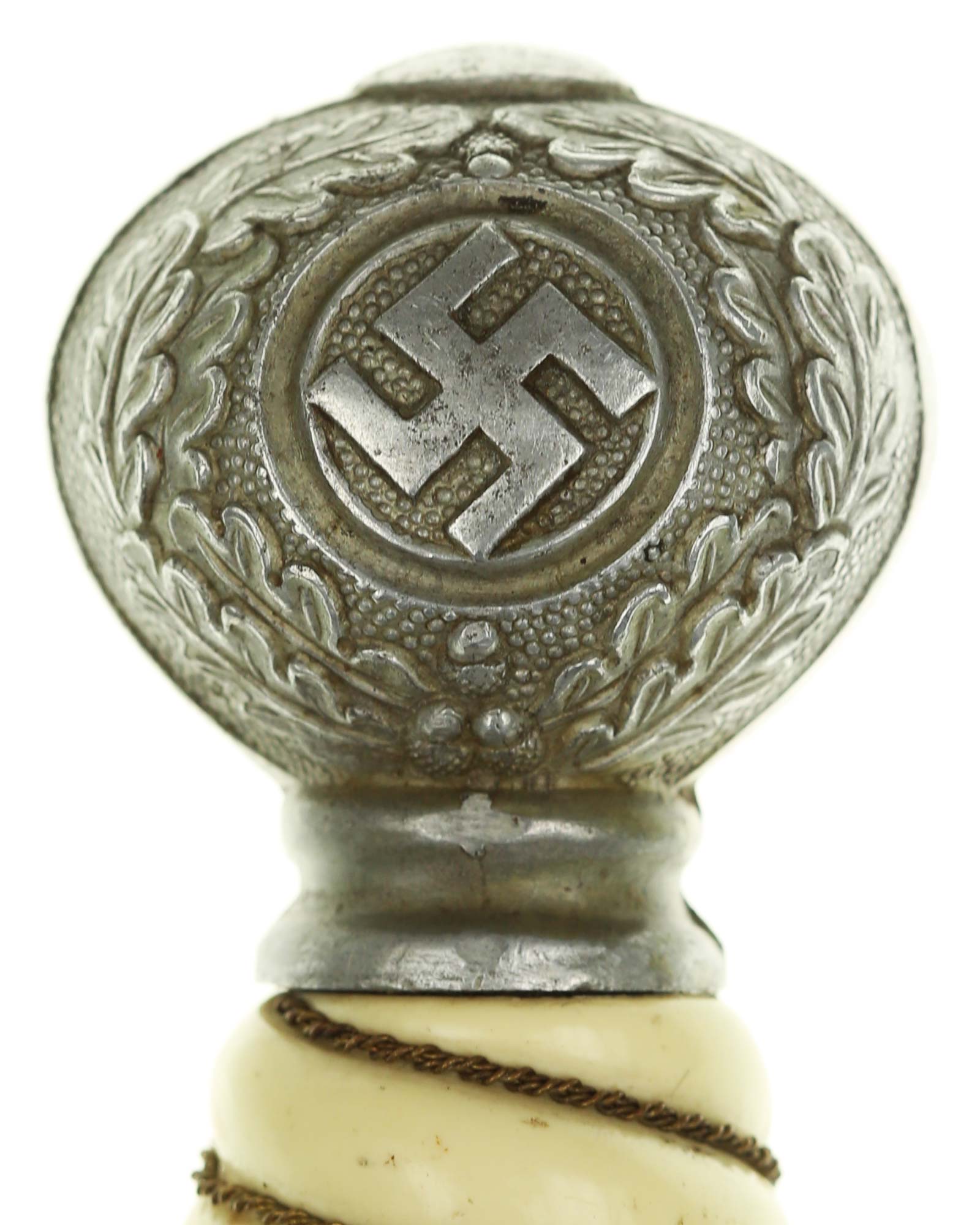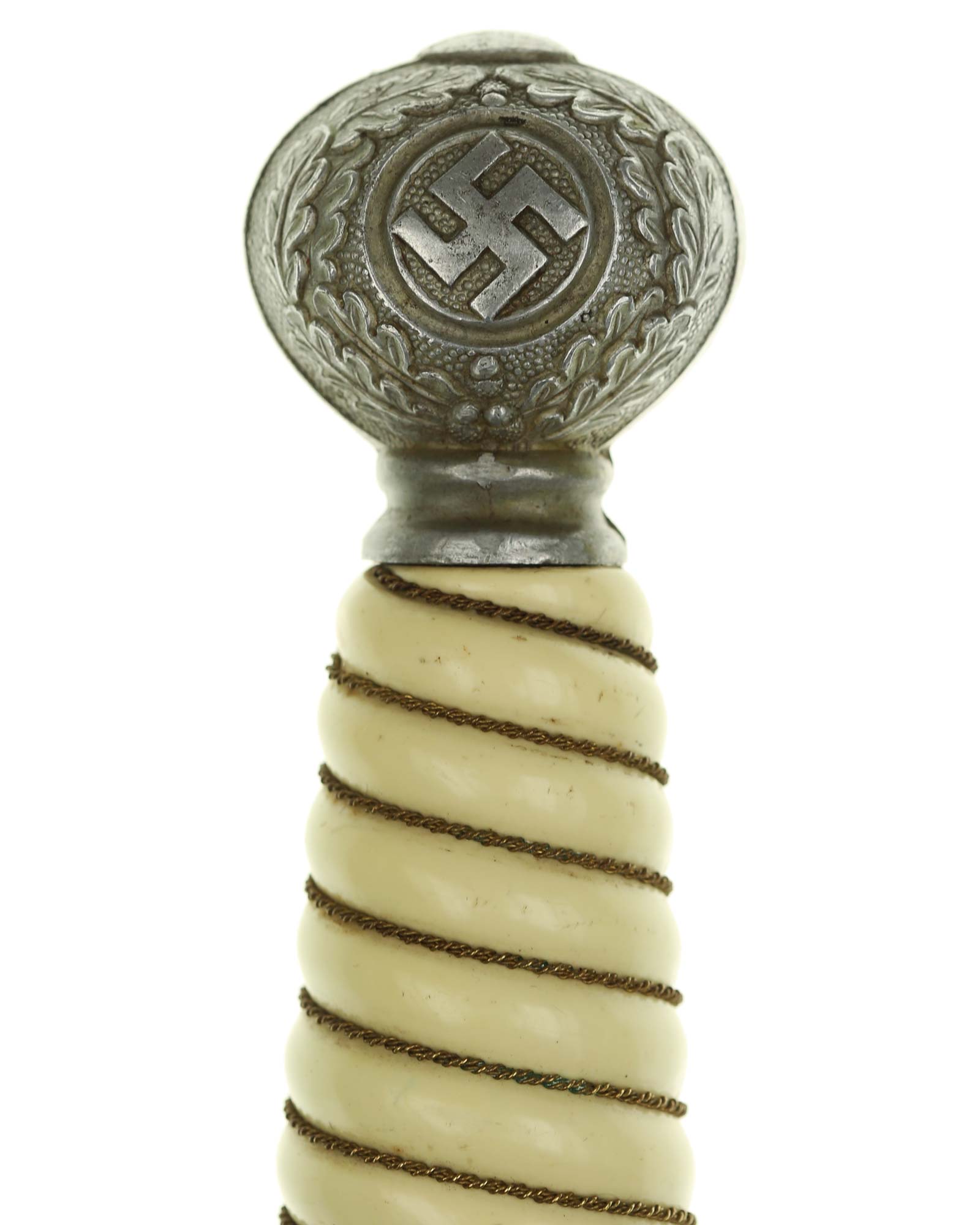 Рукоять: Рукоять круглая, деревянная, покрытая сверху краской белого цвета. По спиральным желобкам рукоять обмотана проволокой. Внизу имеется цилиндрическая втулка, украшенная орнаментом из дубовых листьев. Головка рукояти шарообразная, отлита вместе с верхней гайкой. Украшена с двух сторон рельефным изображением свастики и орнаментом из дубовых листьев. Головка навинчивается на хвостовик клинка и имеет сверху плоскую круглую пуговку. Крестовина литая, с лицевой стороны в виде летящего орла, несущего в когтях свастику. С обратной стороны крестовина имеет точечный фон.