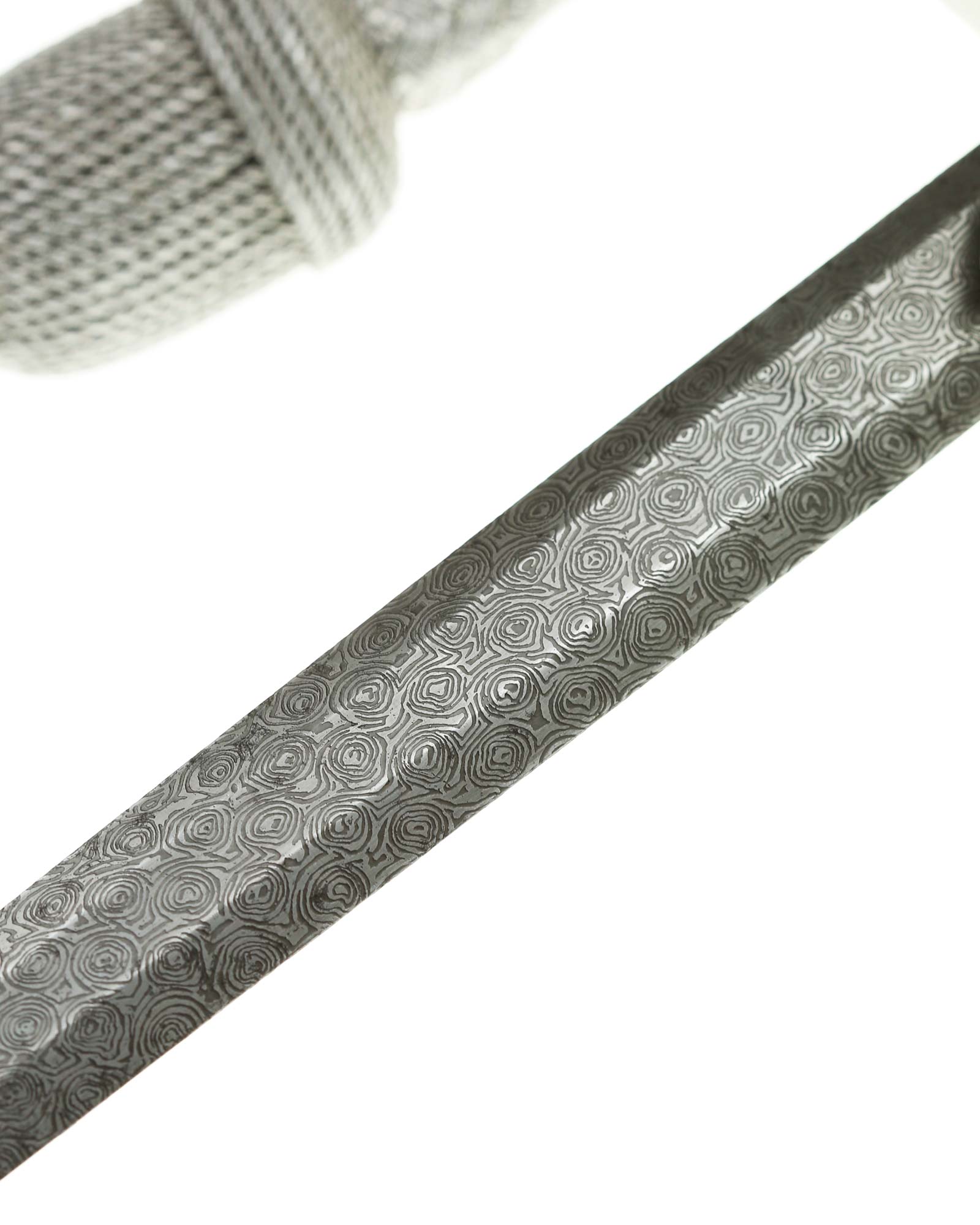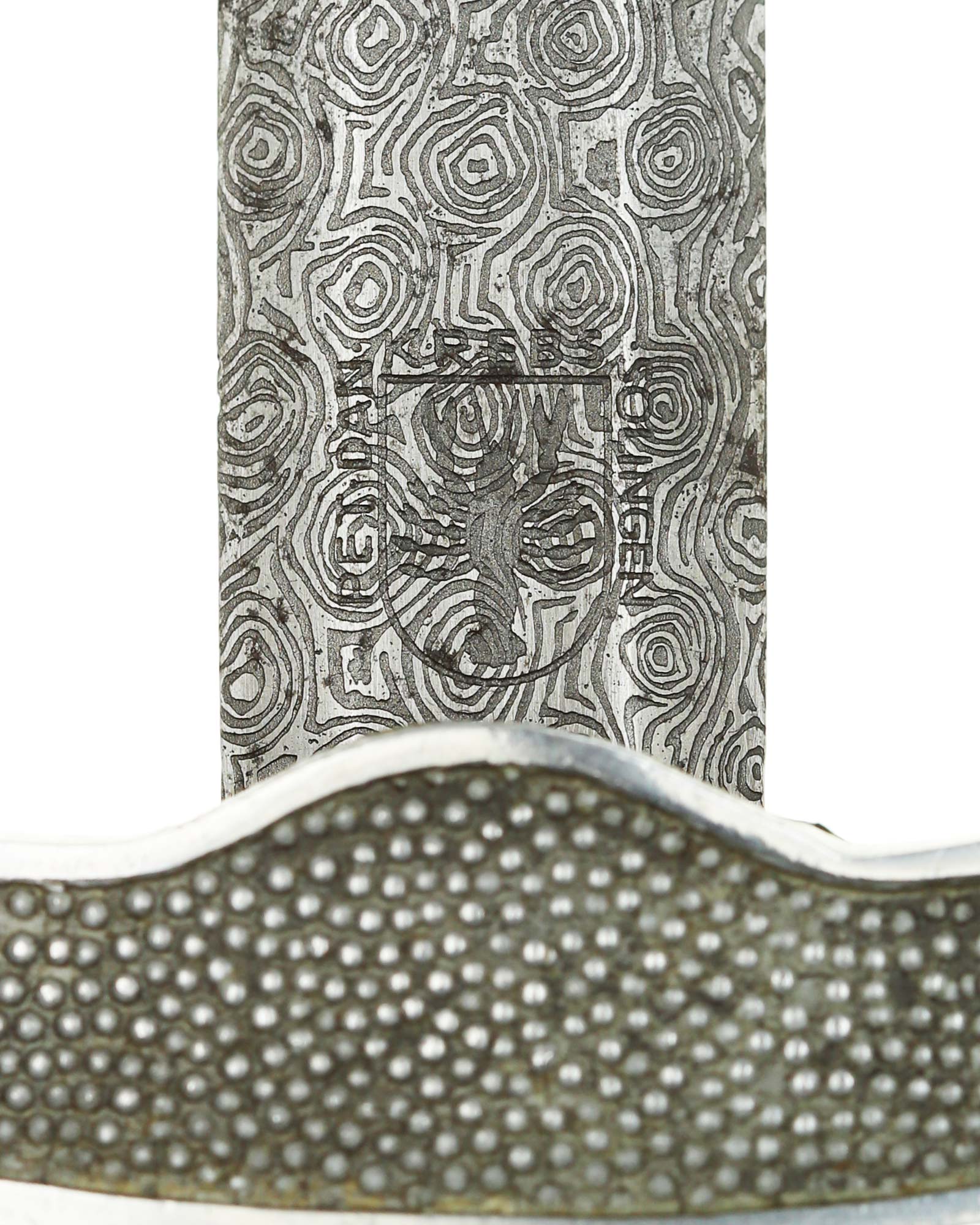 Клинок: Клинок в дамаске, прямой, двулезвийный, в сечении – шестигранный; боевой конец – ромбического сечения. На пяте клинка нанесено клеймо немецкой фирмы производителя «Кребс Петер Даниэль, Золинген» (Peter Daniel Krebs, Solingen).