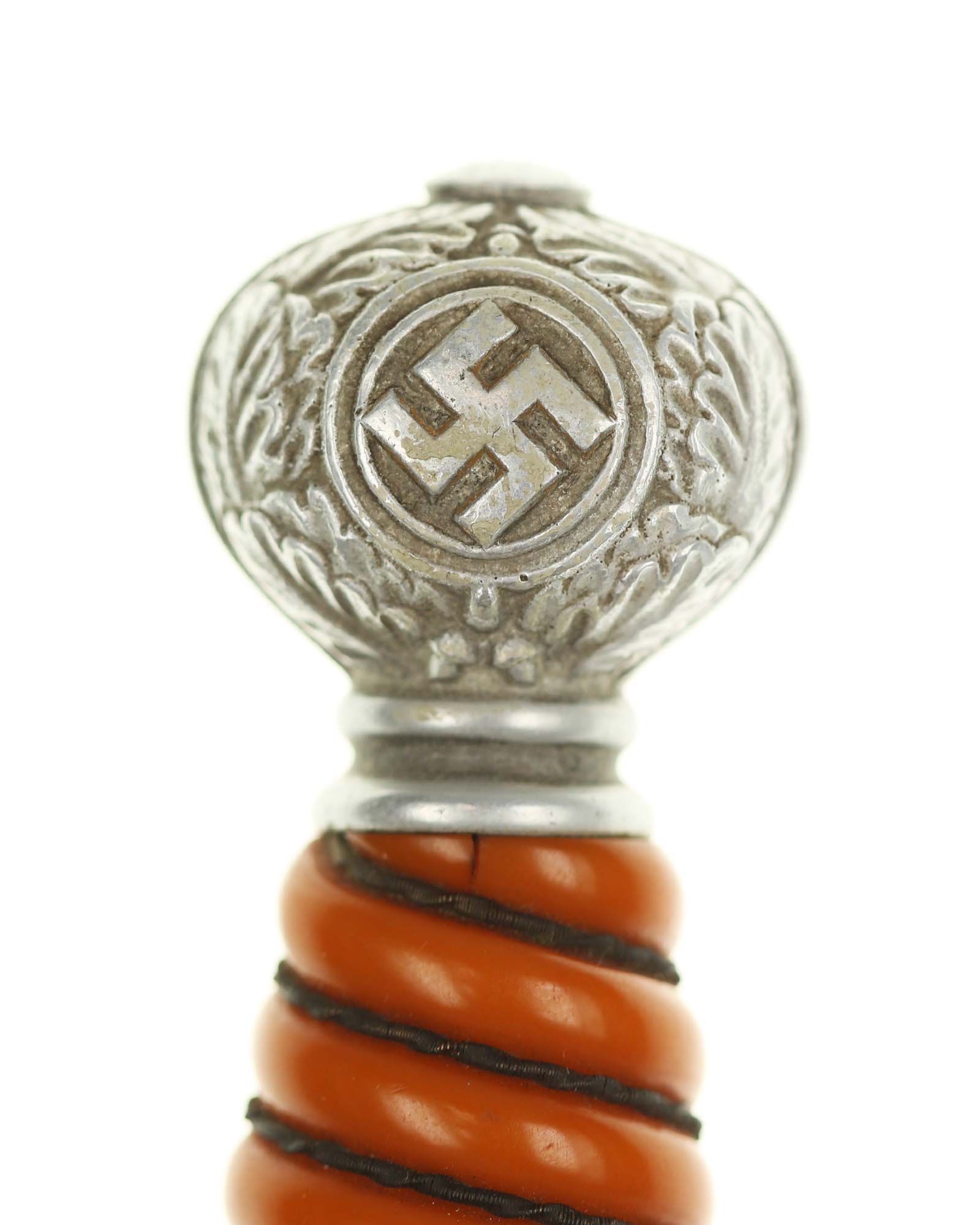 Рукоять: Рукоять бочкообразная, выполнена из пластика (тролон), по спиральным желобкам рукоять обмотана витой серебристой проволокой. Внизу имеется цилиндрическая втулка, украшенная орнаментом из дубовых листьев. Головка рукояти шарообразная, отлита вместе с верхней гайкой. Украшена с двух сторон рельефным изображением свастики и орнаментом из дубовых листьев. Головка навинчивается на хвостовик и имеет сверху плоскую круглую пуговку. Крестовина литая, с лицевой стороны в виде летящего орла, несущего в когтях свастику. С обратной стороны крестовина имеет точечный фон.