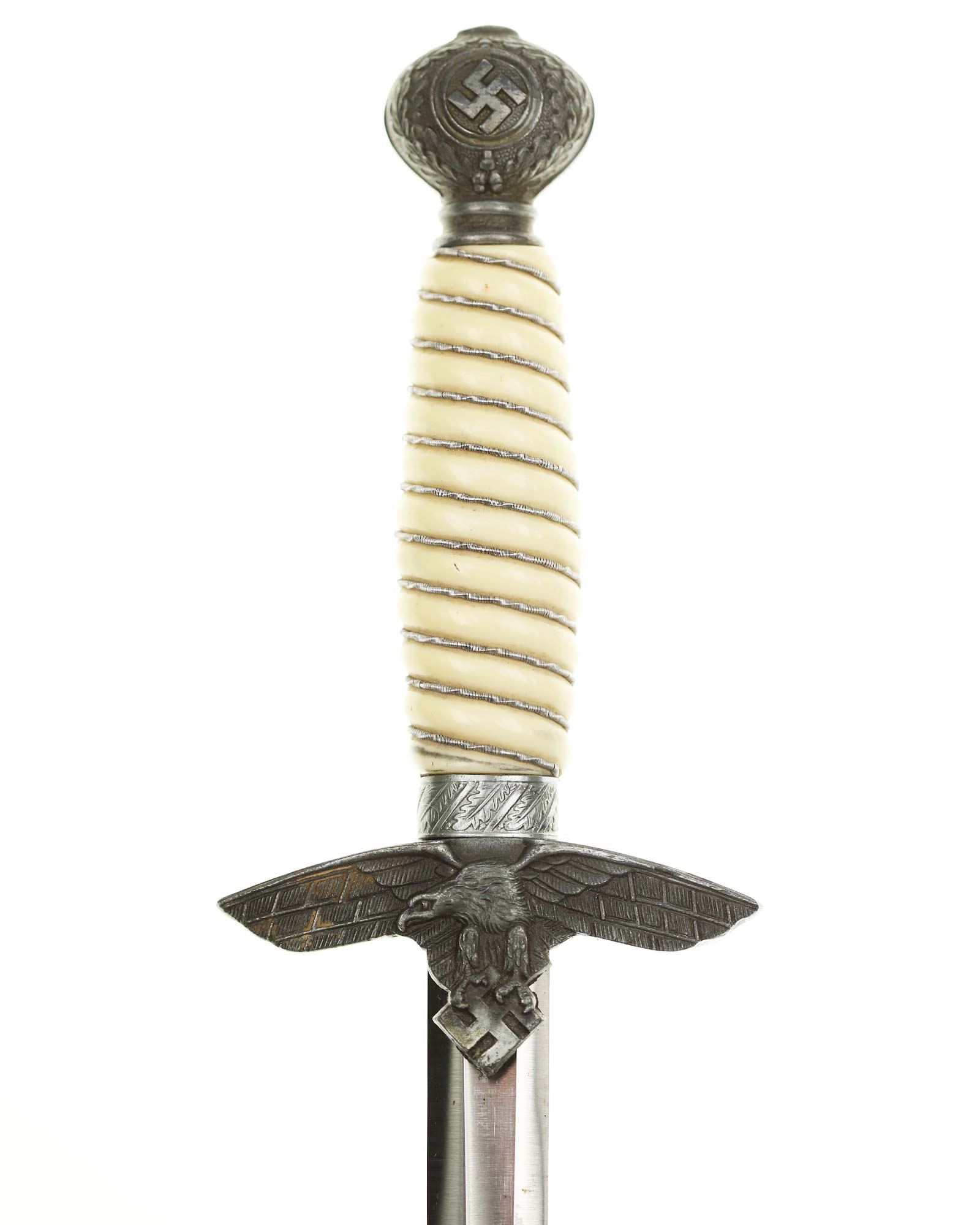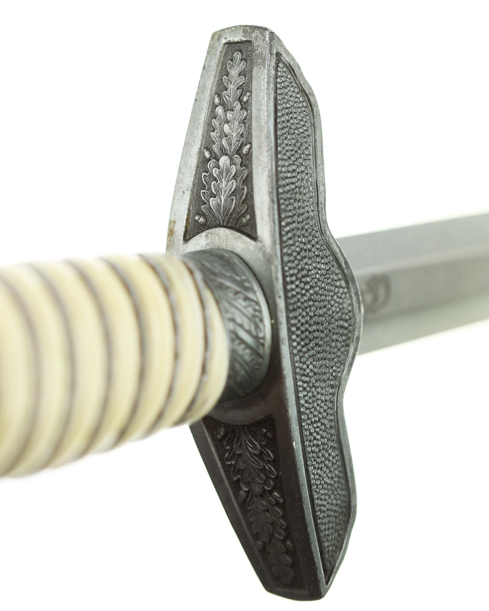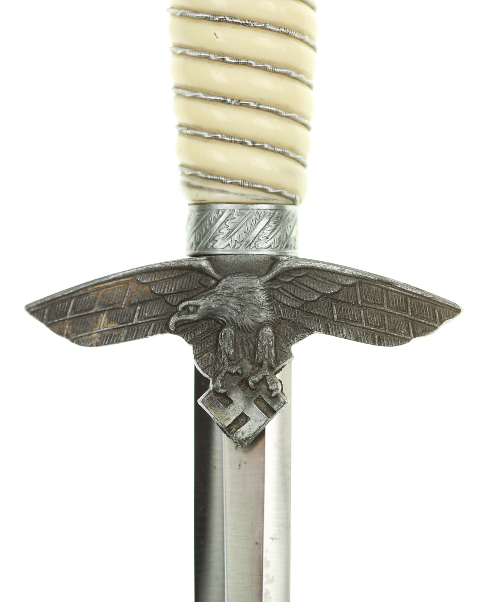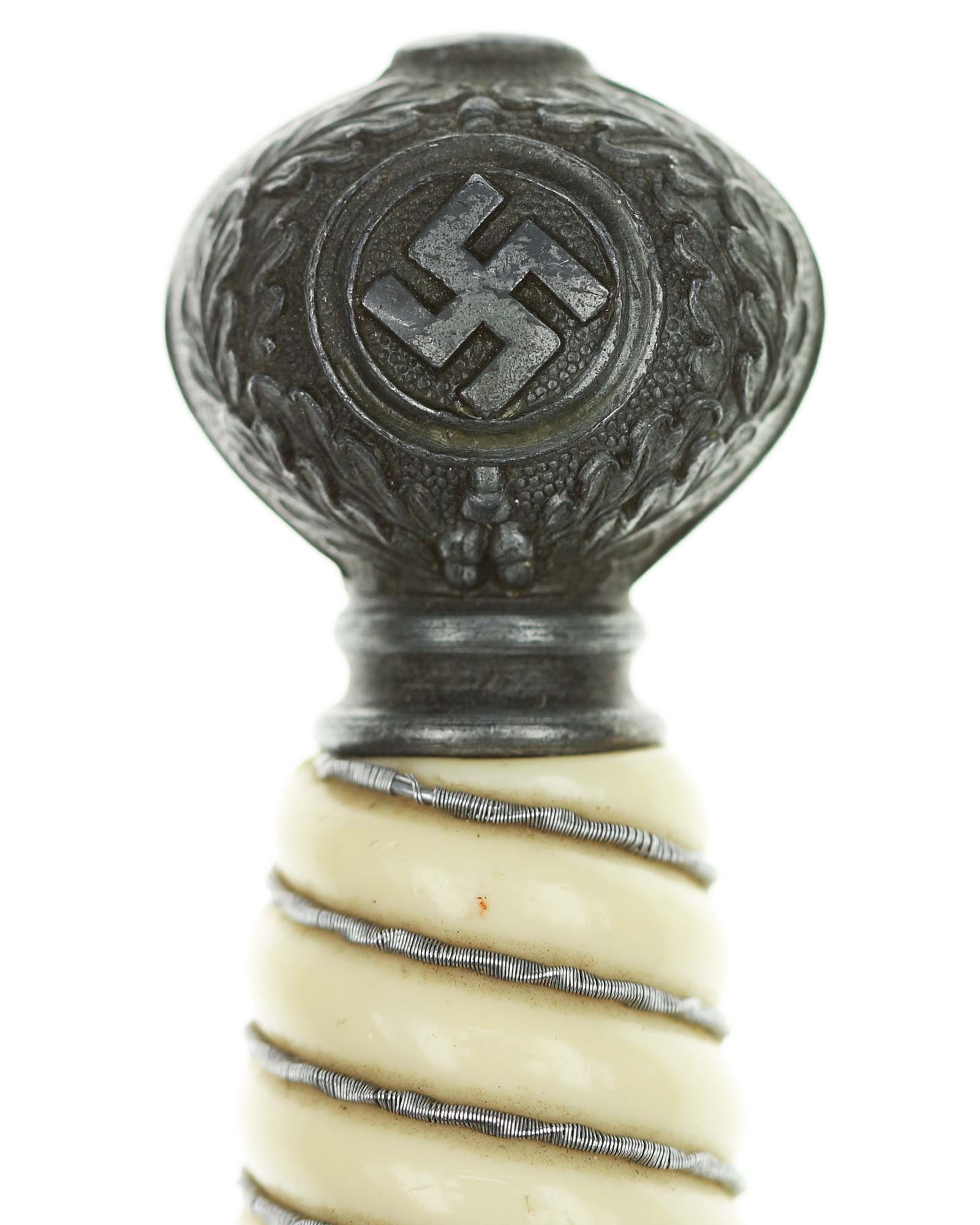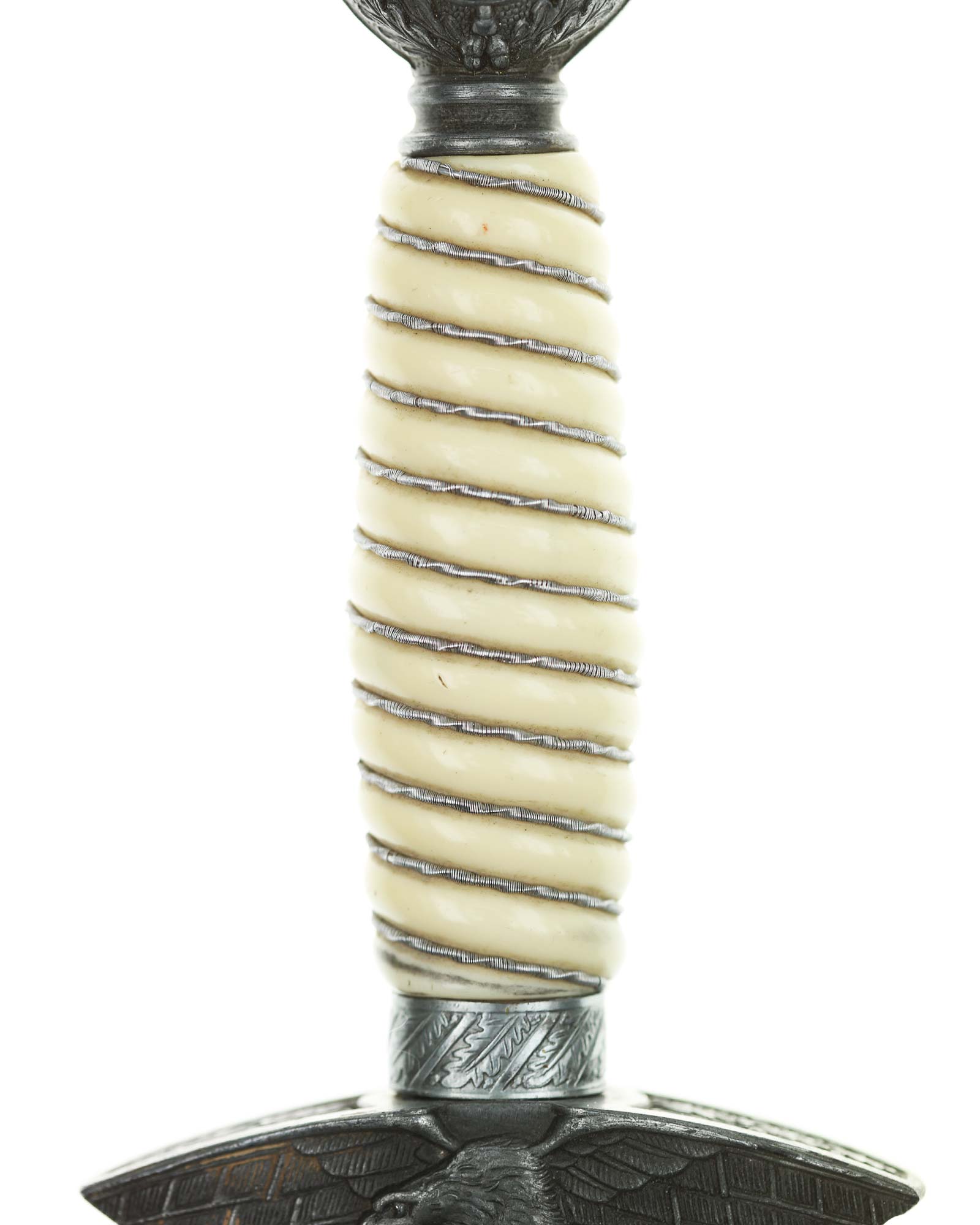 Рукоять: Рукоять бочкообразная, имитирующими слоновую кость, по спиральным желобкам рукоять обмотана витой серебристой проволокой. Внизу имеется цилиндрическая втулка, украшенная орнаментом из дубовых листьев. Головка рукояти шарообразная, отлита вместе с верхней гайкой. Украшена с двух сторон рельефным изображением свастики и орнаментом из дубовых листьев. Головка навинчивается на хвостовик и имеет сверху плоскую круглую пуговку. Крестовина литая, с лицевой стороны в виде летящего орла, несущего в когтях свастику. С обратной стороны крестовина имеет точечный фон.