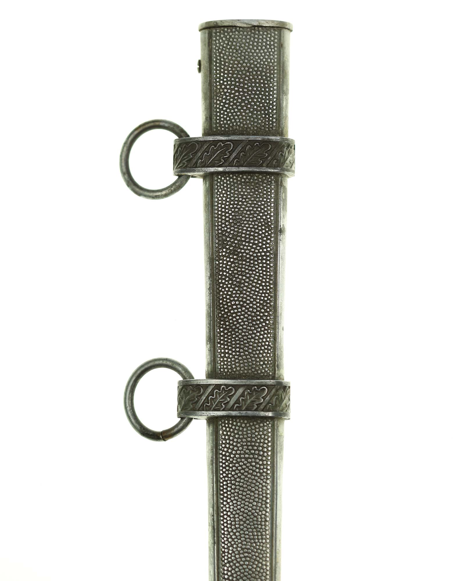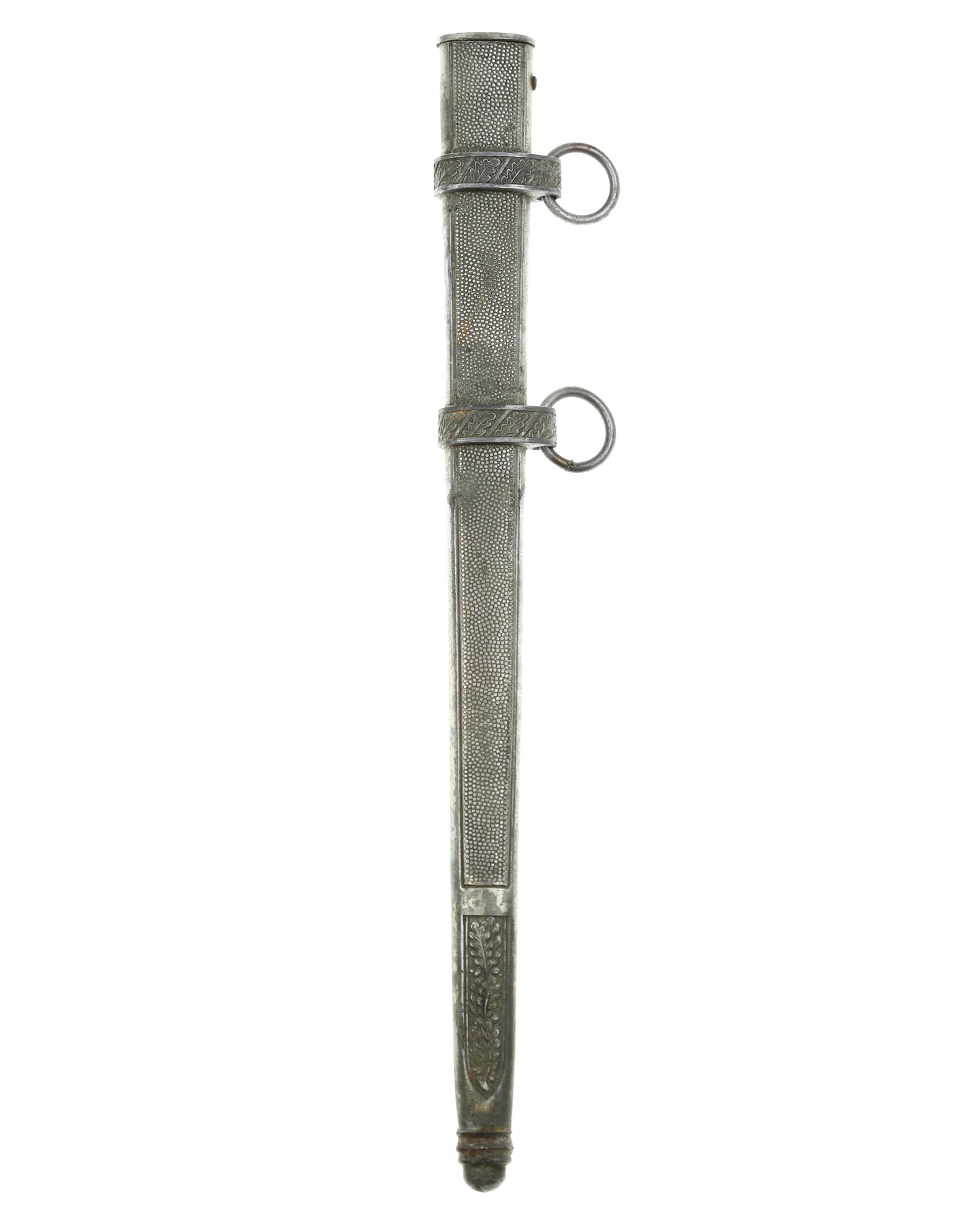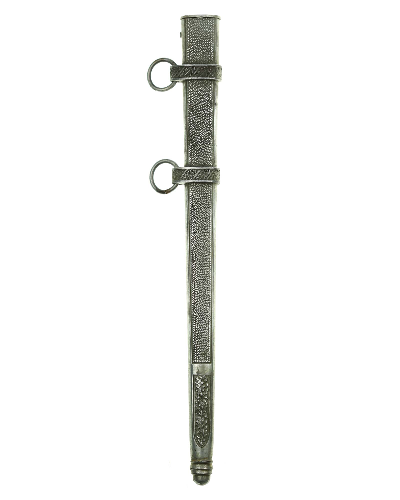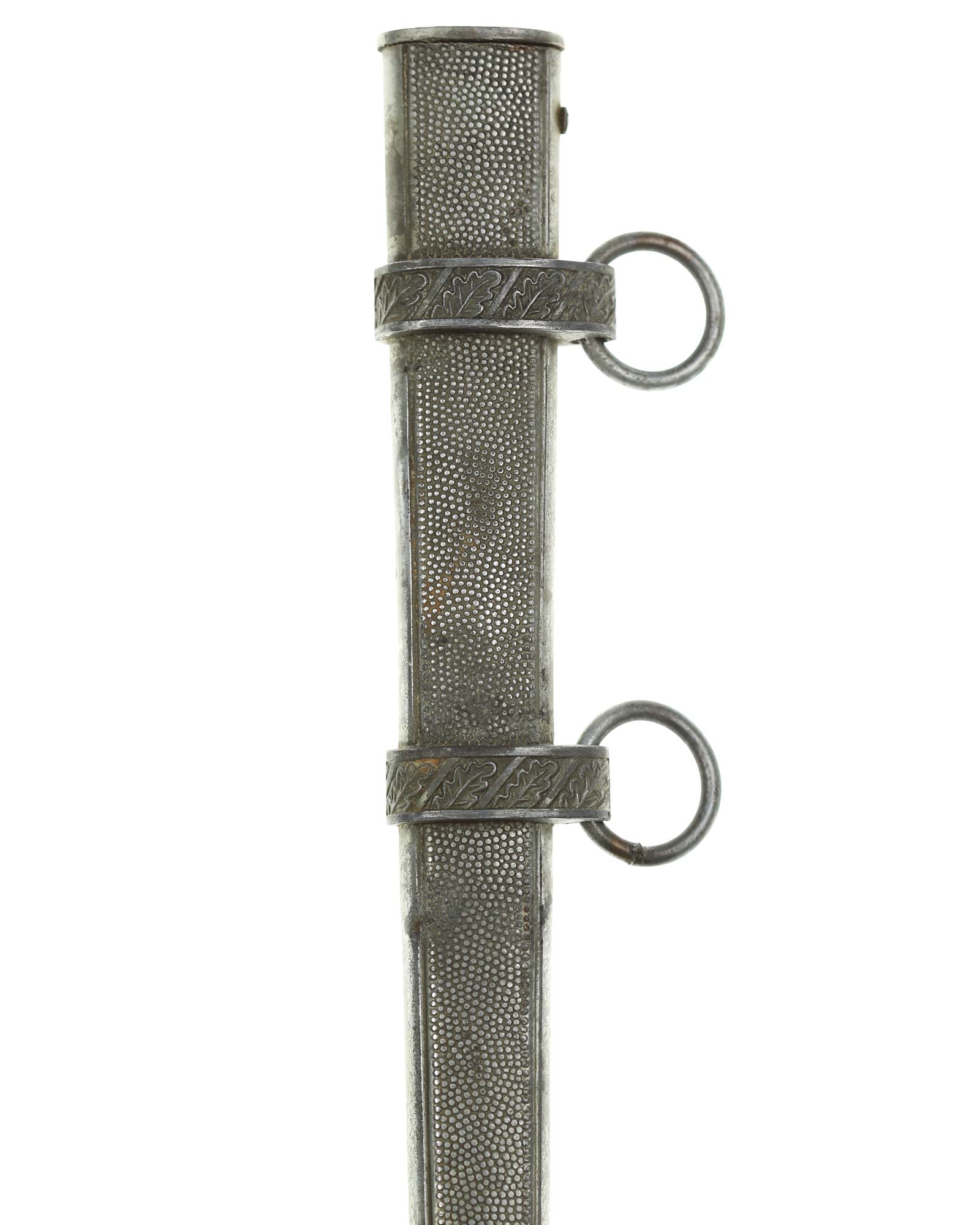 Ножны: Ножны металлические, цельные, поверхность покрыта мелкими точками. Конец ножен округлый, с тремя рельефными поясками, украшен орнаментом из дубовых листьев. Ножны имеют два обоймицы с кольцами для портупеи.
