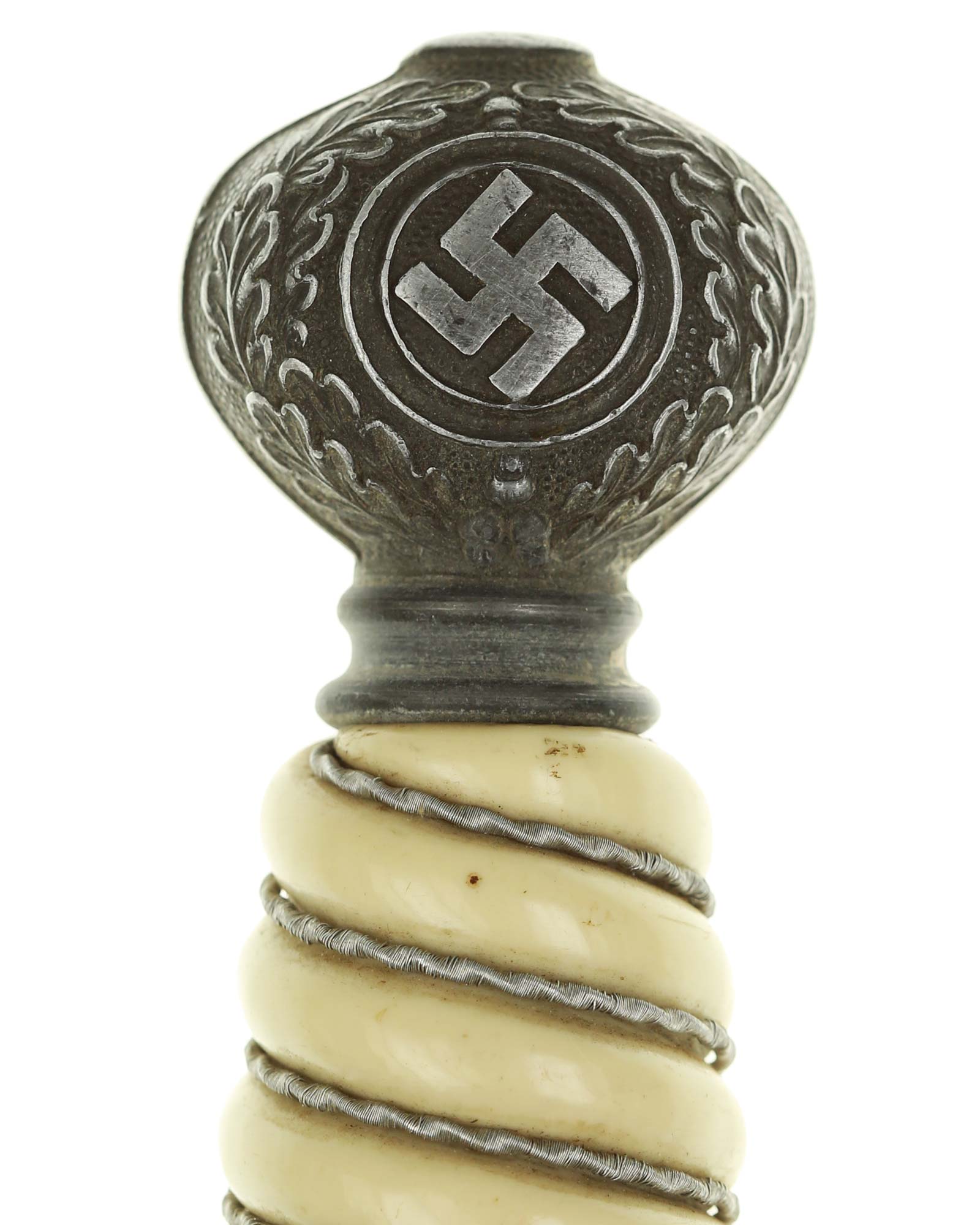 Рукоять: Рукоять бочкообразная, имитирующими слоновую кость, по спиральным желобкам рукоять обмотана витой серебристой проволокой. Внизу имеется цилиндрическая втулка, украшенная орнаментом из дубовых листьев. Головка рукояти шарообразная, отлита вместе с верхней гайкой. Украшена с двух сторон рельефным изображением свастики и орнаментом из дубовых листьев. Головка навинчивается на хвостовик и имеет сверху плоскую круглую пуговку. Крестовина литая, с лицевой стороны в виде летящего орла, несущего в когтях свастику. С обратной стороны крестовина имеет точечный фон.