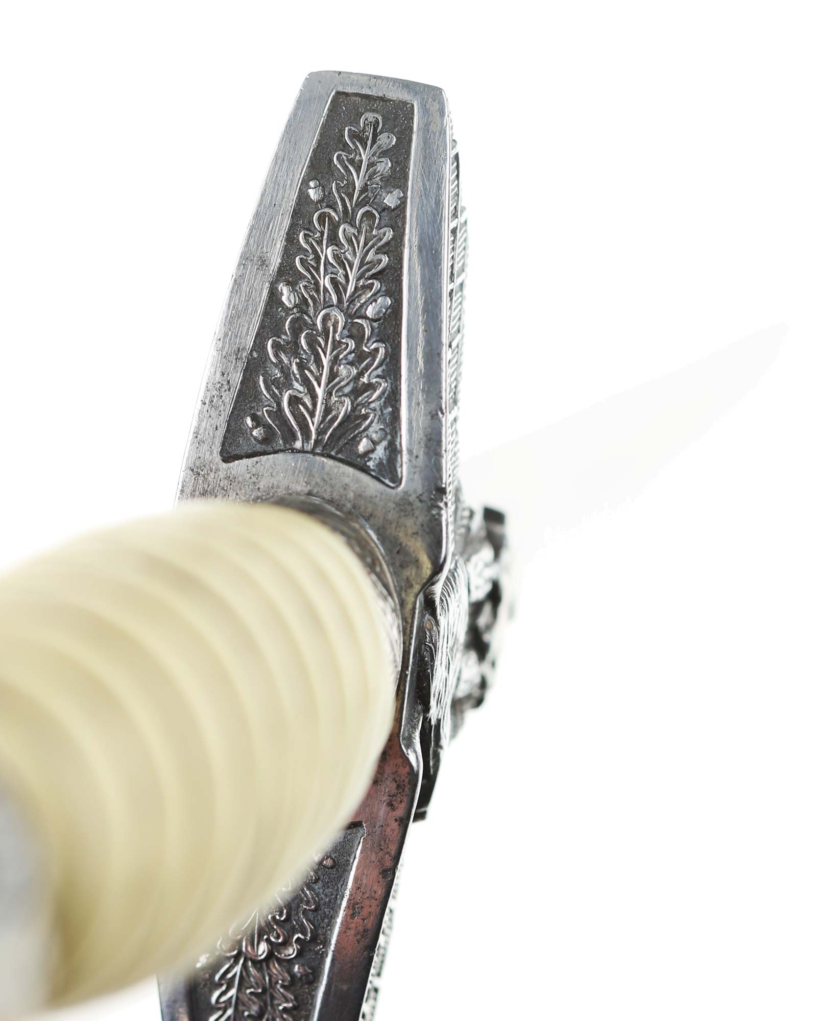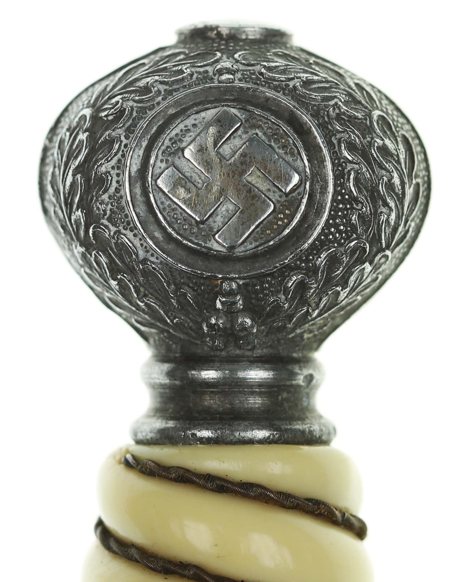 Рукоять: Рукоять бочкообразная, имитирующими слоновую кость, по спиральным желобкам рукоять обмотана витой серебристой проволокой. Внизу имеется цилиндрическая втулка, украшенная орнаментом из дубовых листьев. Головка рукояти шарообразная, отлита вместе с верхней гайкой. Украшена с двух сторон рельефным изображением свастики и орнаментом из дубовых листьев. Головка навинчивается на хвостовик и имеет сверху плоскую круглую пуговку. Крестовина литая, с лицевой стороны в виде летящего орла, несущего в когтях свастику. С обратной стороны крестовина имеет точечный фон.