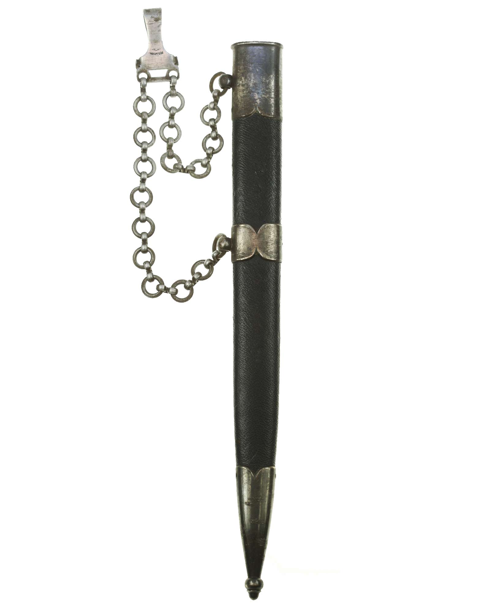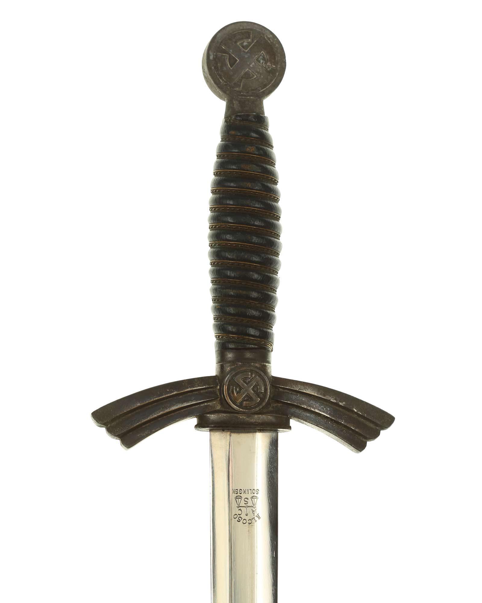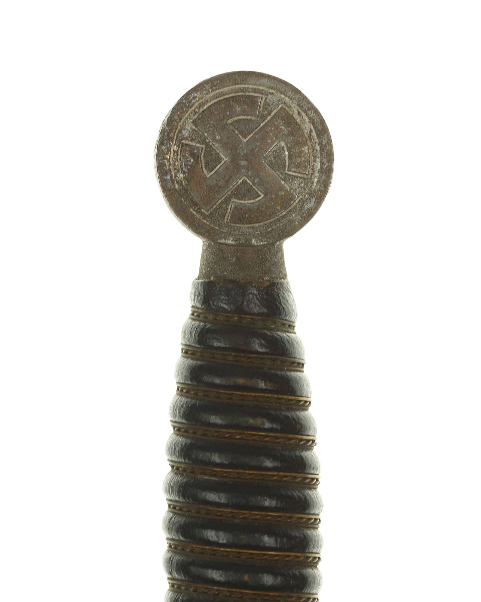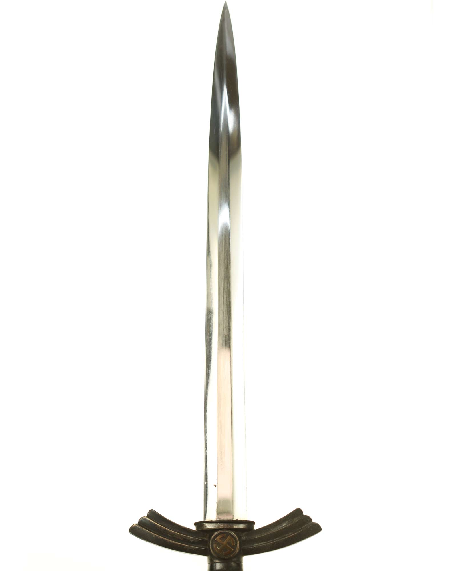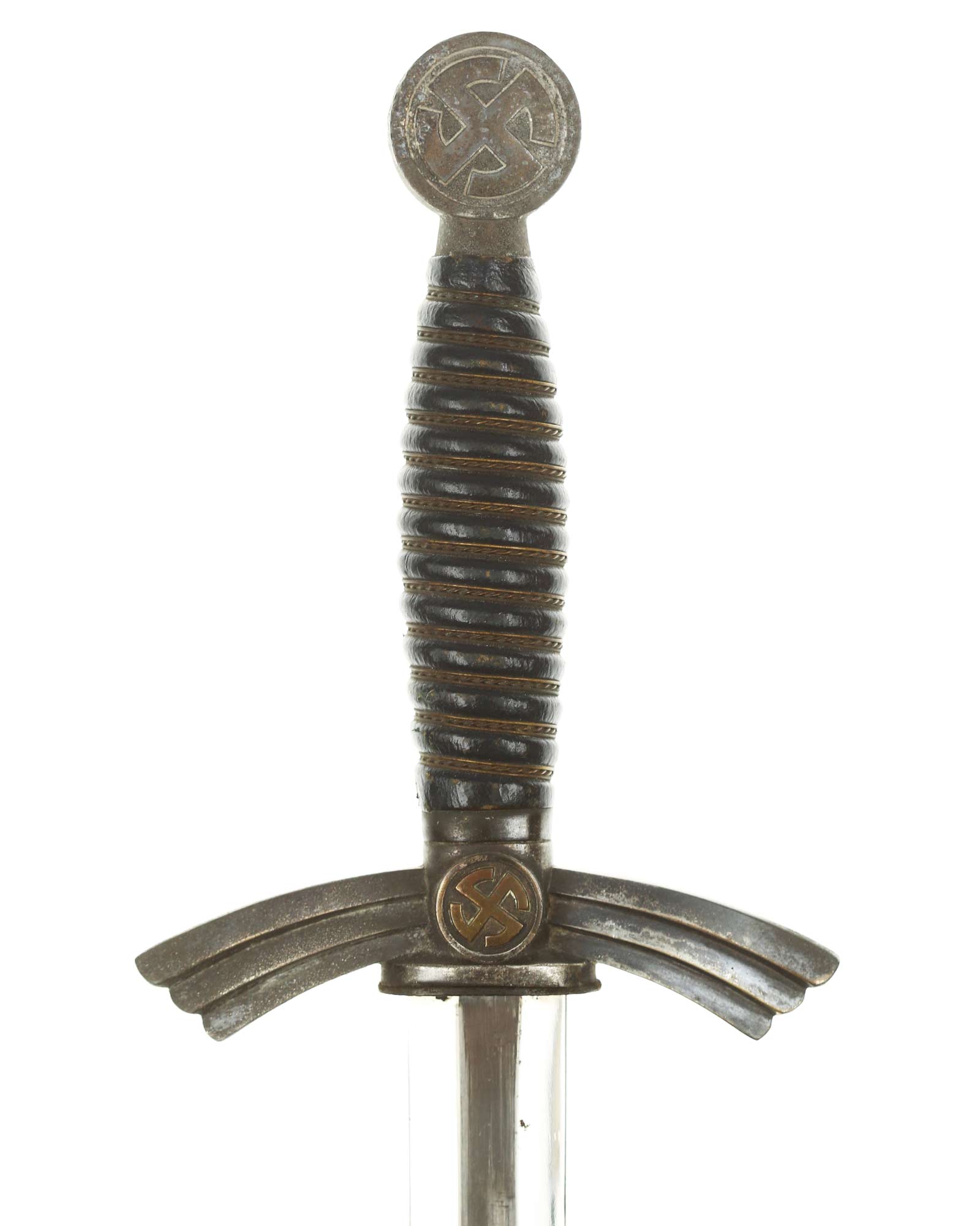 Рукоять: Рукоять деревянная, бочкообразная, покрытая темно-синей кожей, по желобкам обмотана проволокой. Нижняя гайка цилиндрическая, верхняя гайка коническая и составляет одно целое с круглой плоской головкой, навинчивающейся на хвостовик клинка. На обеих сторонах головки имеются вписанные в круг свастики. Крестовина литая, выполнена в виде трех наложенных друг на друга дужек, с загнутыми вниз концами. На перекрестье с обеих сторон на круглых медальонах имеется уменьшенное изображение свастики, как на головке. Под перекрестьем расположена массивная овальная шайба, отлитая вместе с крестовиной.