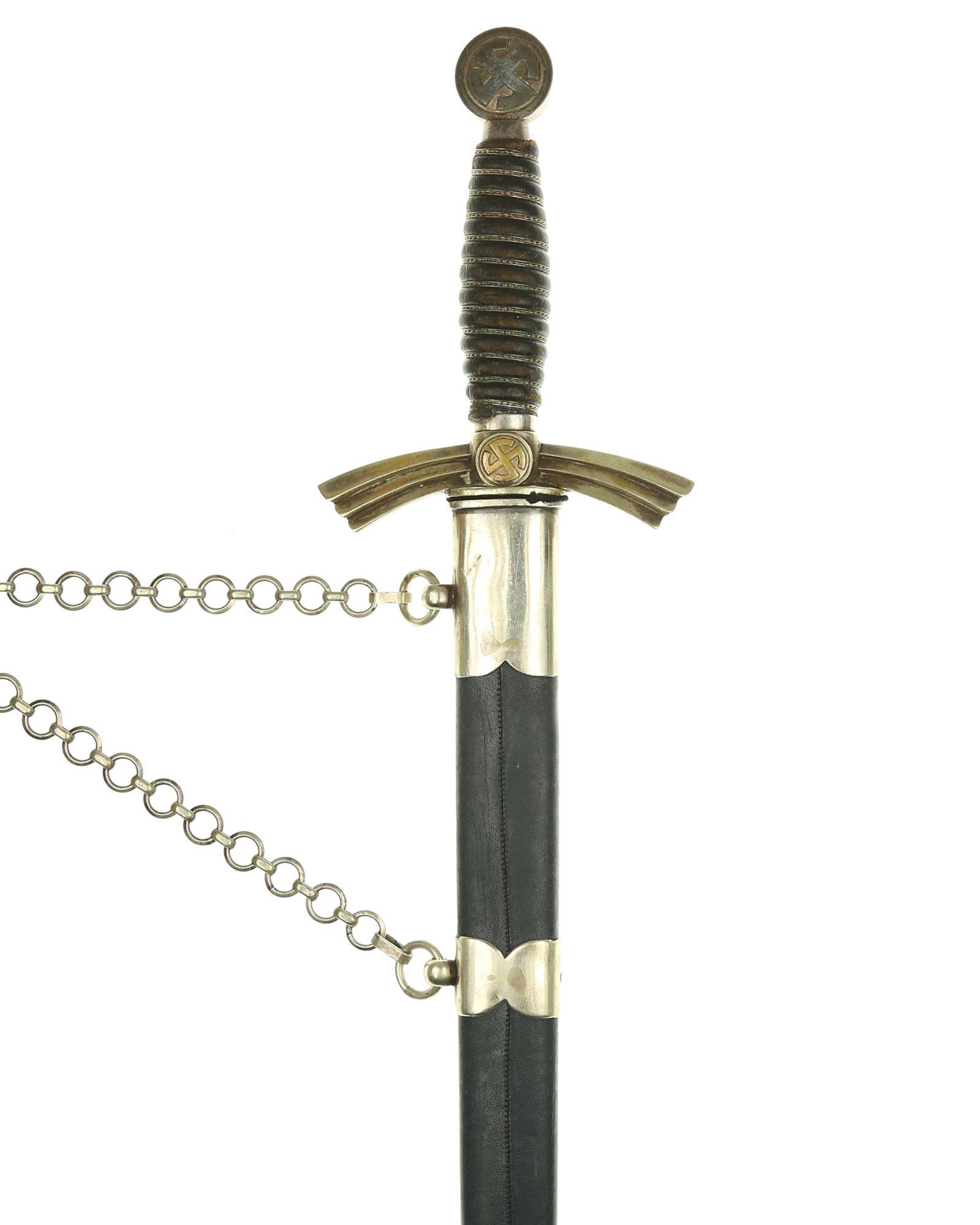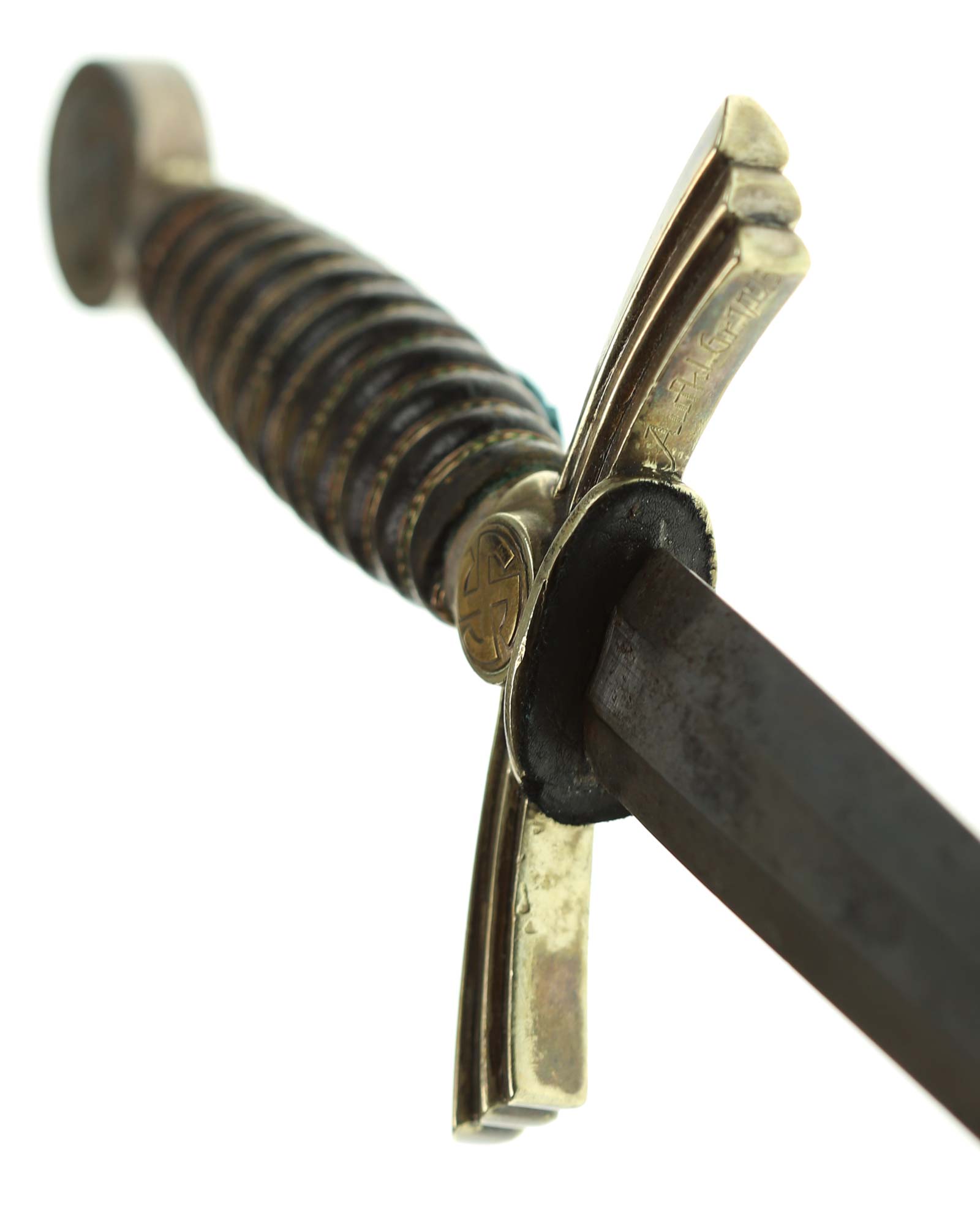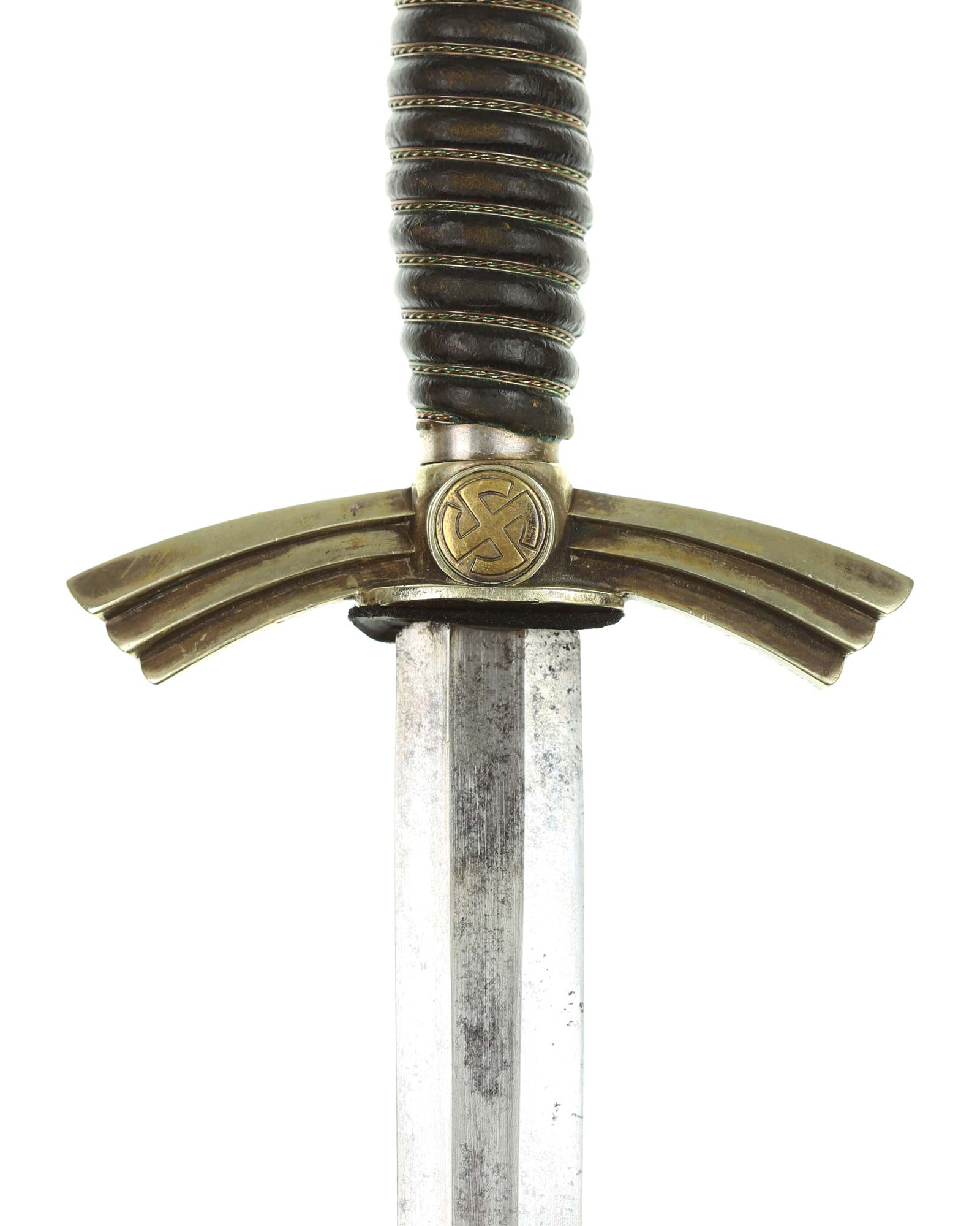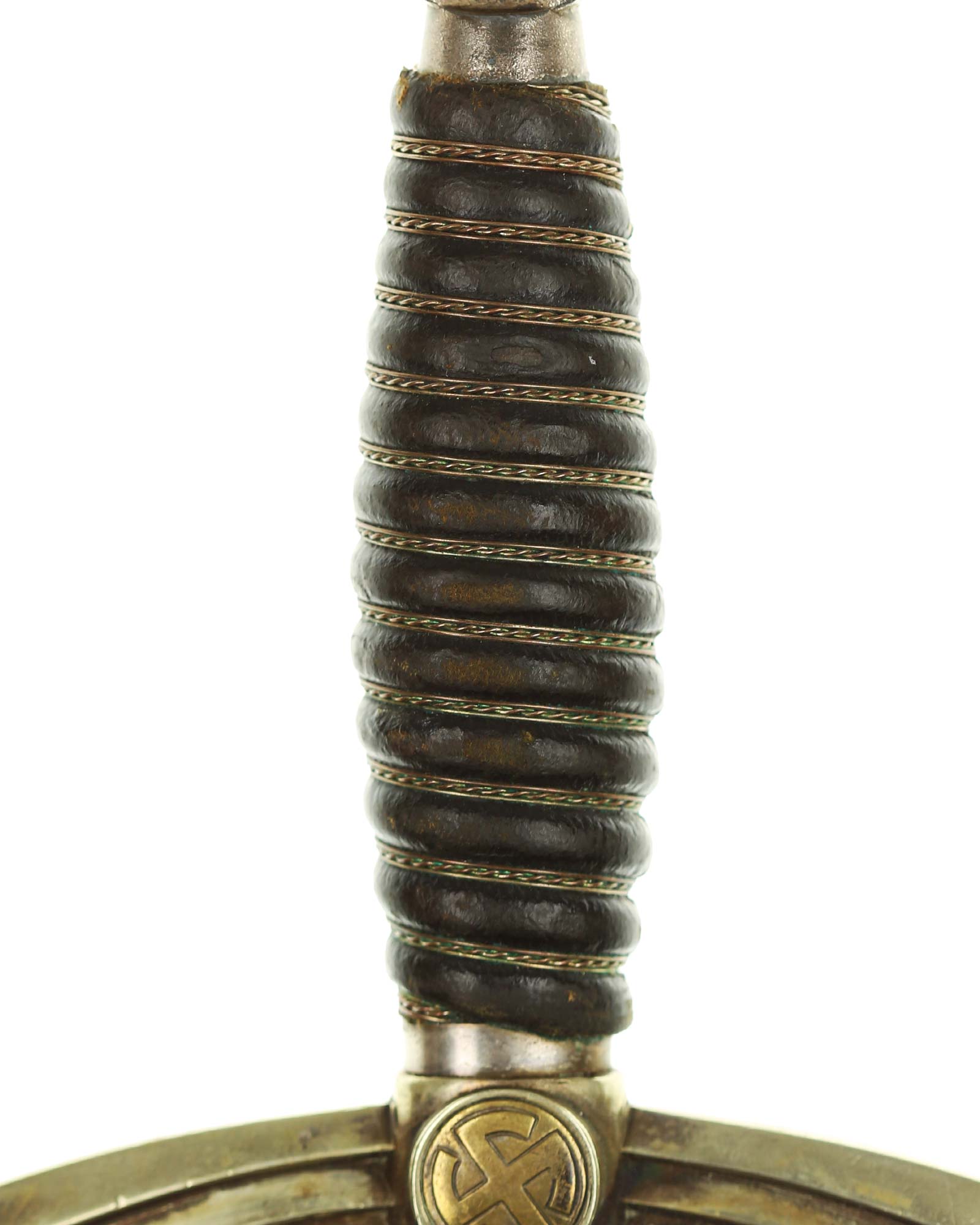 Рукоять: Рукоять деревянная, бочкообразная, покрытая темно-синей кожей, по желобкам обмотана проволокой. Нижняя гайка цилиндрическая, верхняя гайка коническая и составляет одно целое с круглой плоской головкой, навинчивающейся на хвостовик клинка. На обеих сторонах головки имеются вписанные в круг свастики. Крестовина литая, выполнена в виде трех наложенных друг на друга дужек, с загнутыми вниз концами. На перекрестье с обеих сторон на круглых медальонах имеется уменьшенное изображение свастики, как на головке. Под перекрестьем расположена массивная овальная шайба, отлитая вместе с крестовиной.