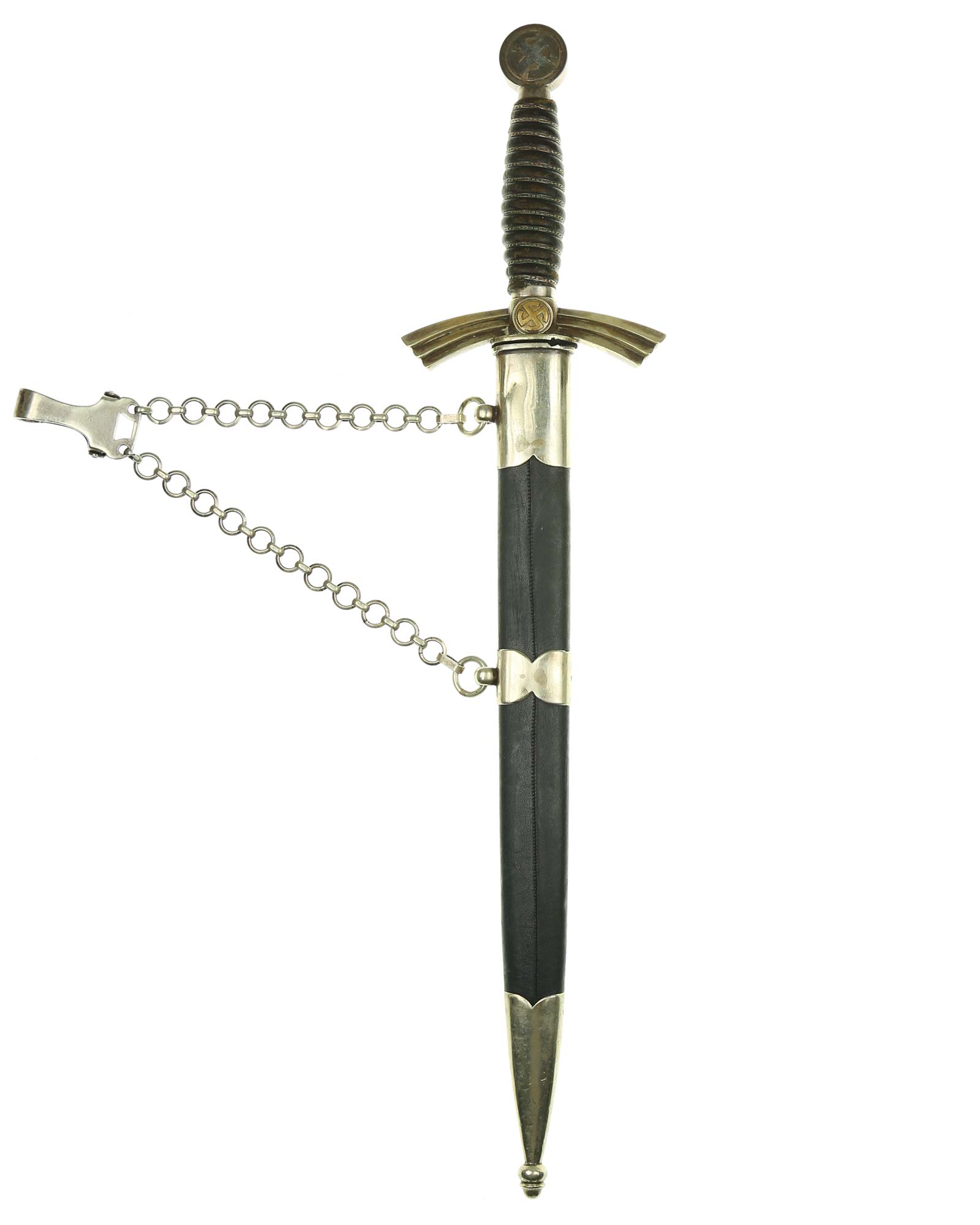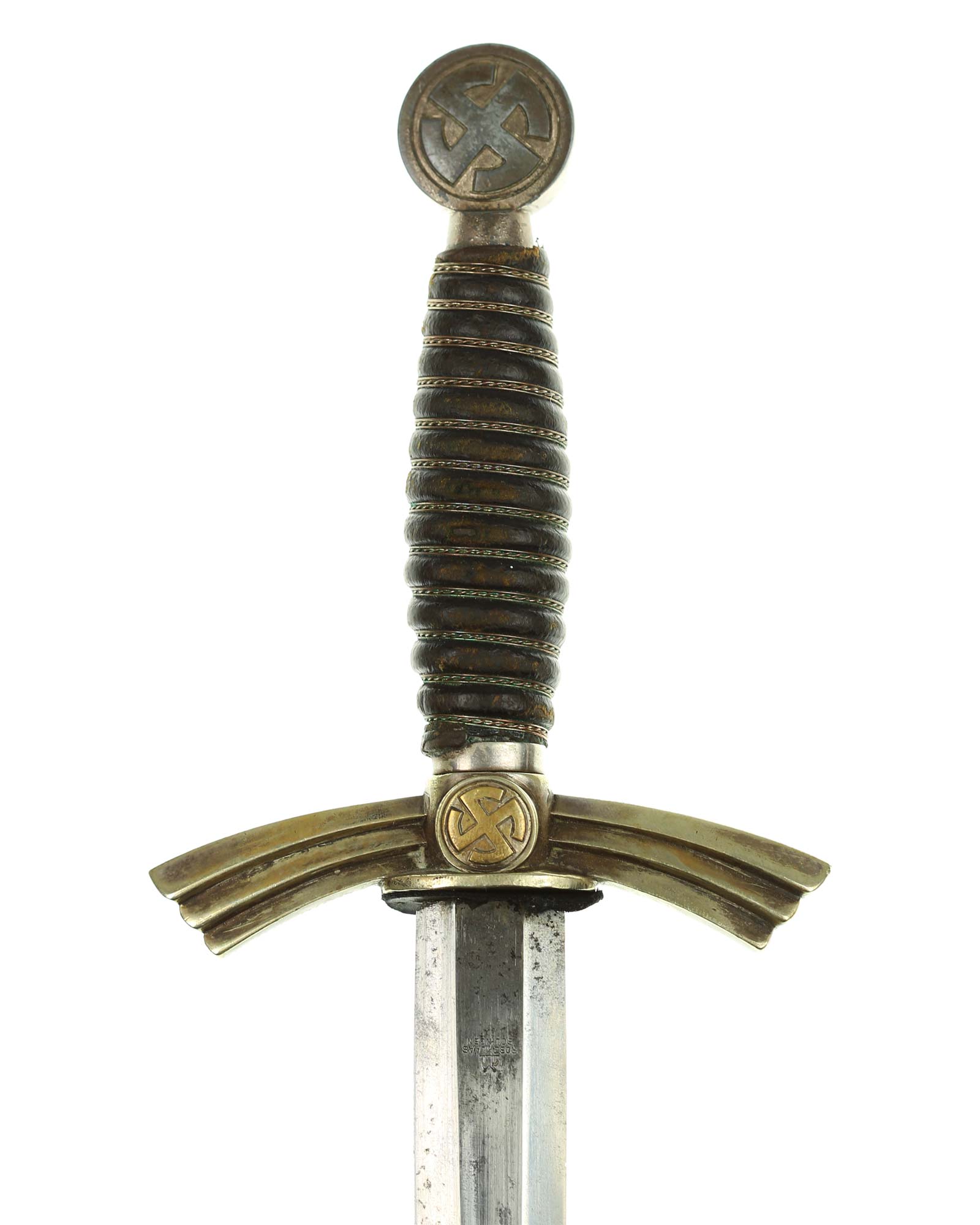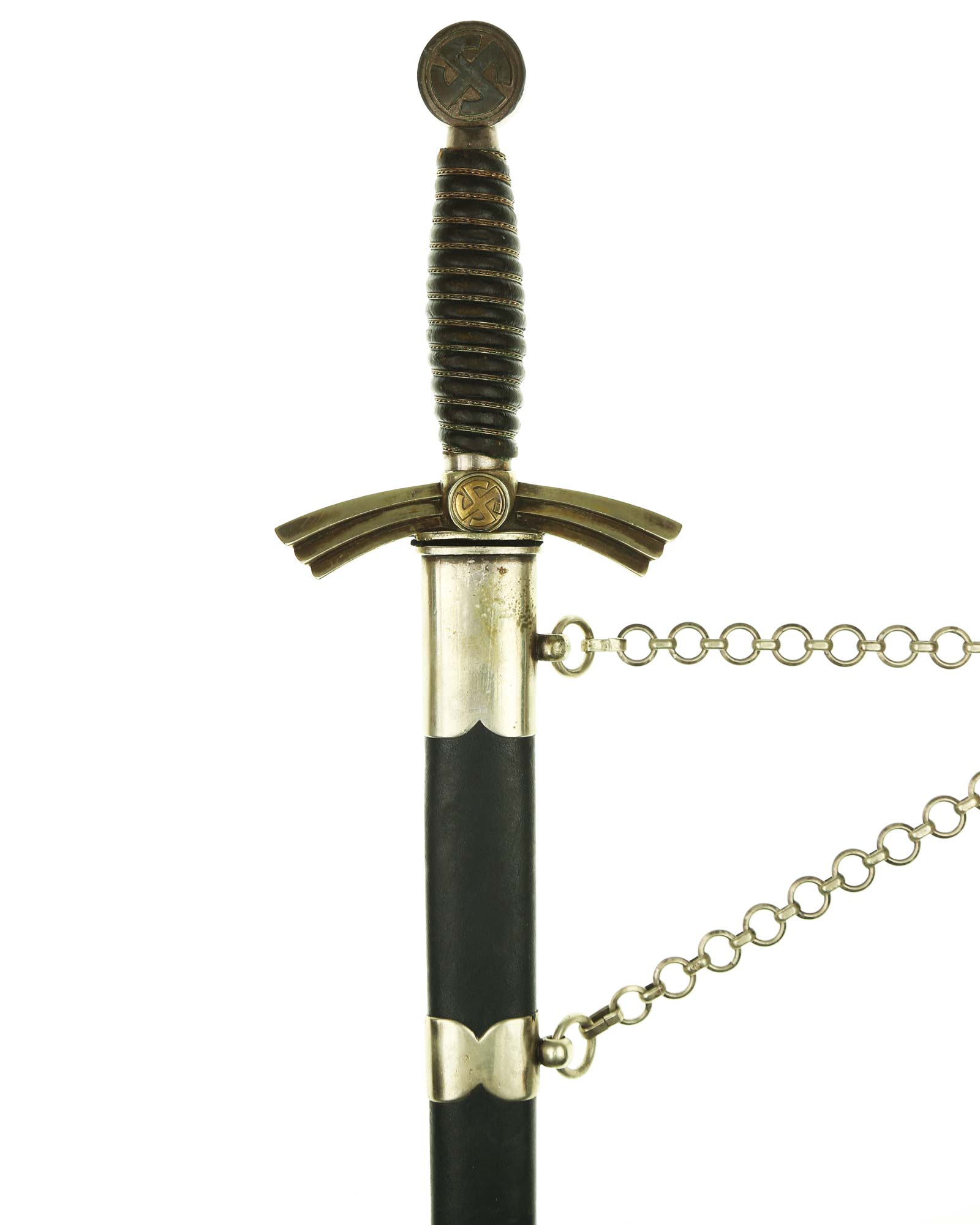 Рукоять: Рукоять деревянная, бочкообразная, покрытая темно-синей кожей, по желобкам обмотана проволокой. Нижняя гайка цилиндрическая, верхняя гайка коническая и составляет одно целое с круглой плоской головкой, навинчивающейся на хвостовик клинка. На обеих сторонах головки имеются вписанные в круг свастики. Крестовина литая, выполнена в виде трех наложенных друг на друга дужек, с загнутыми вниз концами. На перекрестье с обеих сторон на круглых медальонах имеется уменьшенное изображение свастики, как на головке. Под перекрестьем расположена массивная овальная шайба, отлитая вместе с крестовиной.