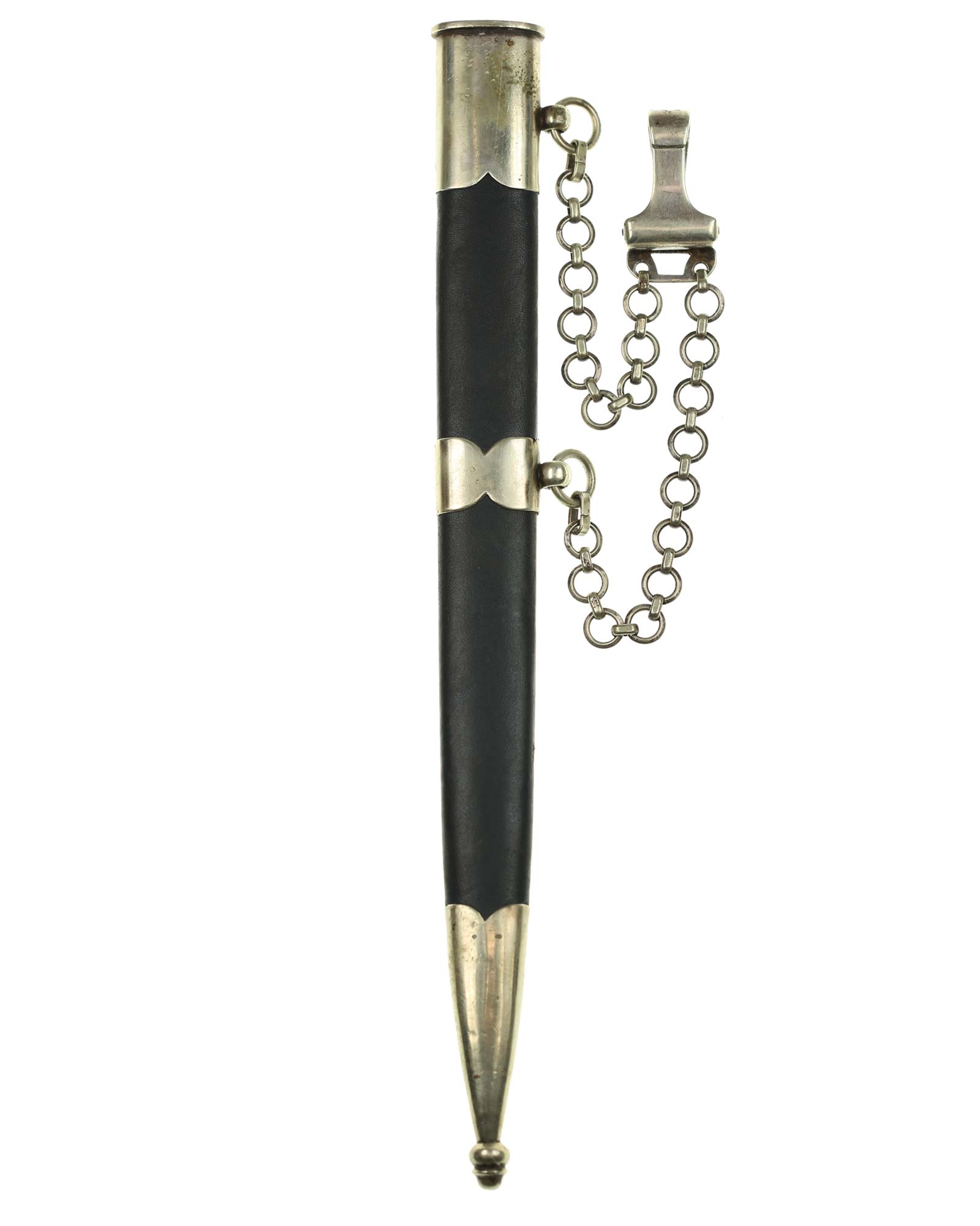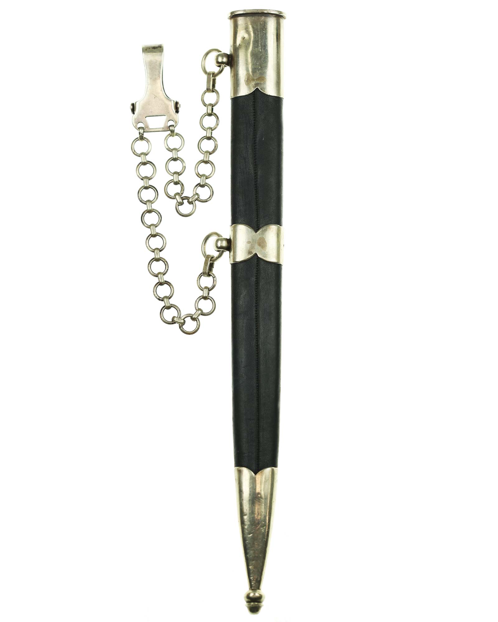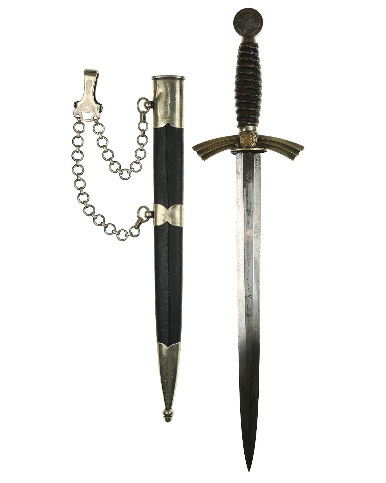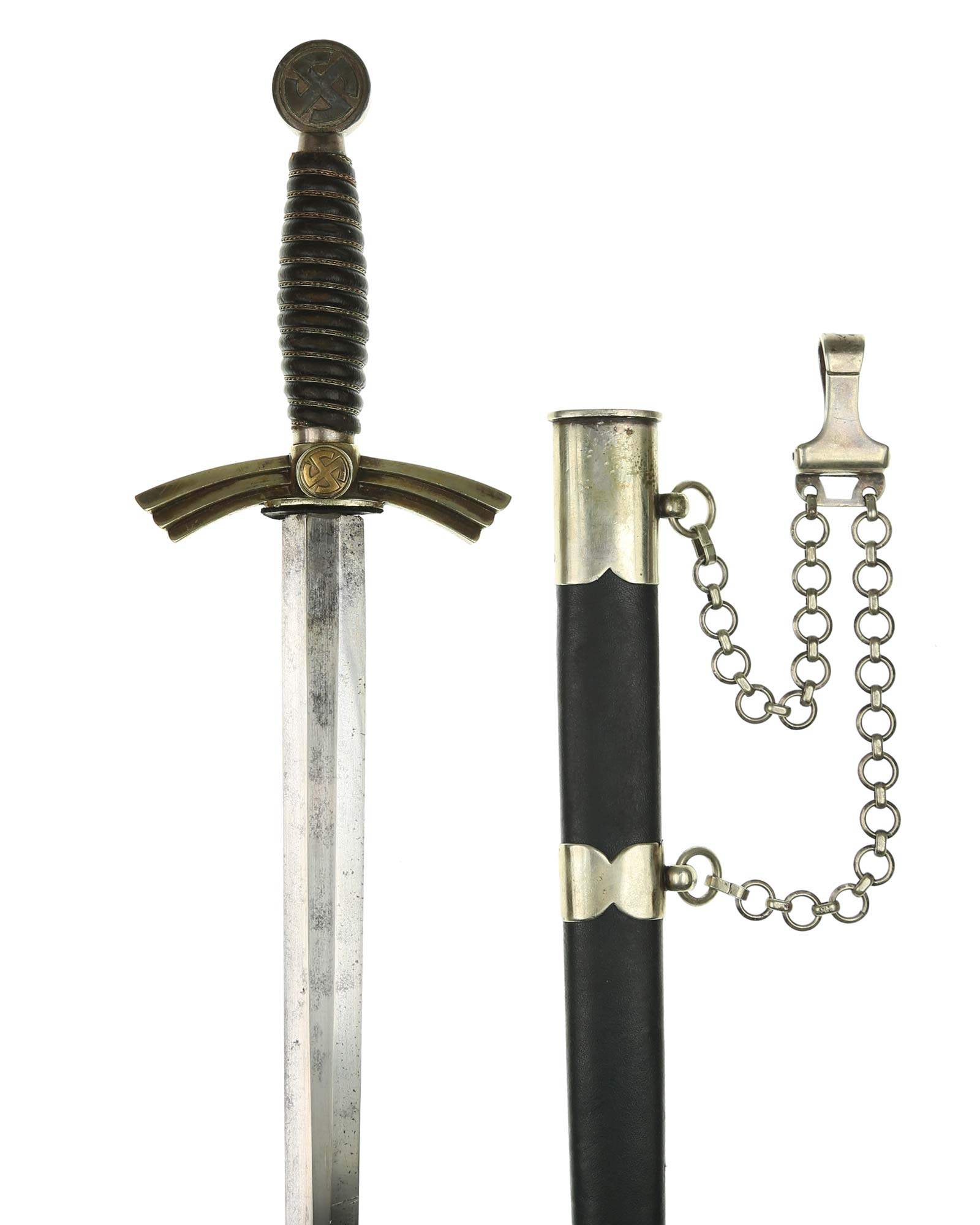 Рукоять: Рукоять деревянная, бочкообразная, покрытая темно-синей кожей, по желобкам обмотана проволокой. Нижняя гайка цилиндрическая, верхняя гайка коническая и составляет одно целое с круглой плоской головкой, навинчивающейся на хвостовик клинка. На обеих сторонах головки имеются вписанные в круг свастики. Крестовина литая, выполнена в виде трех наложенных друг на друга дужек, с загнутыми вниз концами. На перекрестье с обеих сторон на круглых медальонах имеется уменьшенное изображение свастики, как на головке. Под перекрестьем расположена массивная овальная шайба, отлитая вместе с крестовиной.