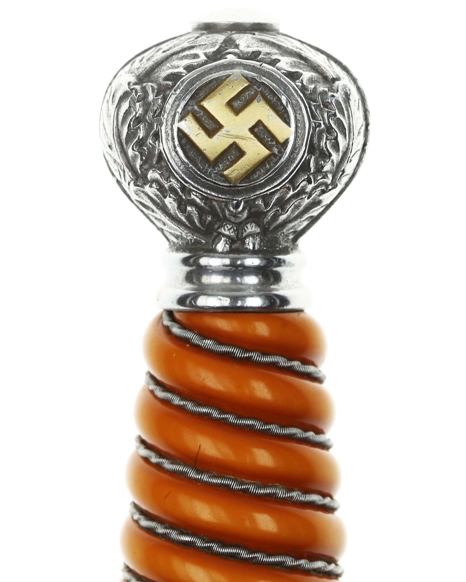 Рукоять: Рукоять бочкообразная, выполнена из пластика (тролон), по спиральным желобкам рукоять обмотана витой серебристой проволокой. Внизу имеется цилиндрическая втулка, украшенная орнаментом из дубовых листьев. Головка рукояти шарообразная, отлита вместе с верхней гайкой. Украшена с двух сторон рельефным изображением свастики и орнаментом из дубовых листьев. Головка навинчивается на хвостовик и имеет сверху плоскую круглую пуговку. Крестовина литая, с лицевой стороны в виде летящего орла, несущего в когтях свастику. С обратной стороны крестовина имеет точечный фон.