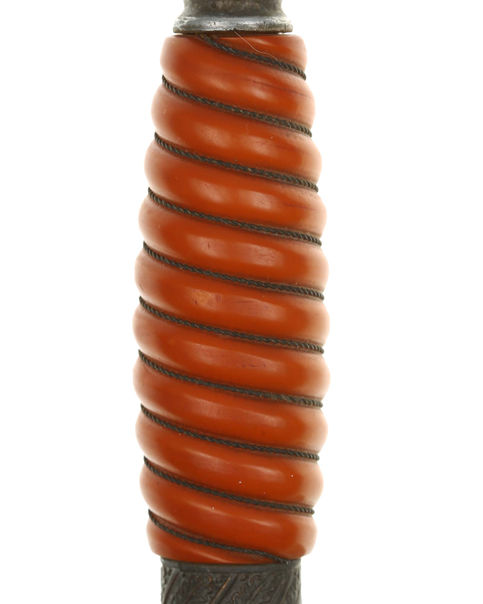 Рукоять: Рукоять бочкообразная, имитирующими слоновую кость, по спиральным желобкам рукоять обмотана витой серебристой проволокой. Внизу имеется цилиндрическая втулка, украшенная орнаментом из дубовых листьев. Головка рукояти шарообразная, отлита вместе с верхней гайкой. Украшена с двух сторон рельефным изображением свастики и орнаментом из дубовых листьев. Головка навинчивается на хвостовик и имеет сверху плоскую круглую пуговку. Крестовина литая, с лицевой стороны в виде летящего орла, несущего в когтях свастику. С обратной стороны крестовина имеет точечный фон.