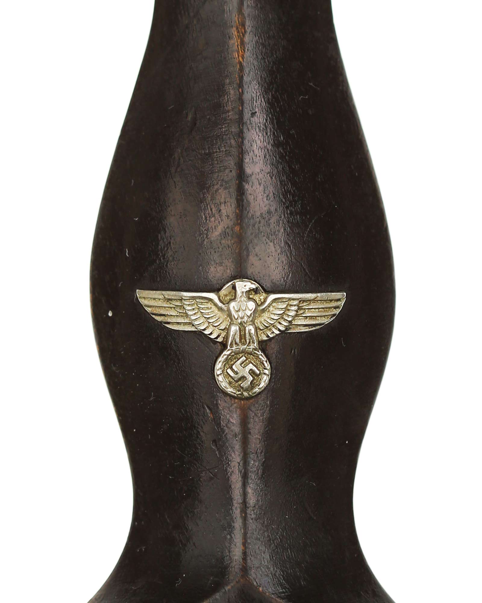 Рукоять: Рукоять из мореного в коричневый цвет дерева. Рукоять в верхней части имеет вставку в виде эмалевого глазка, в средней части – вставка в виде орла. Металлические элементы гарды изготовлены из мельхиора. Хвостовик клинка укреплен на верхней крестовине при помощи винта.