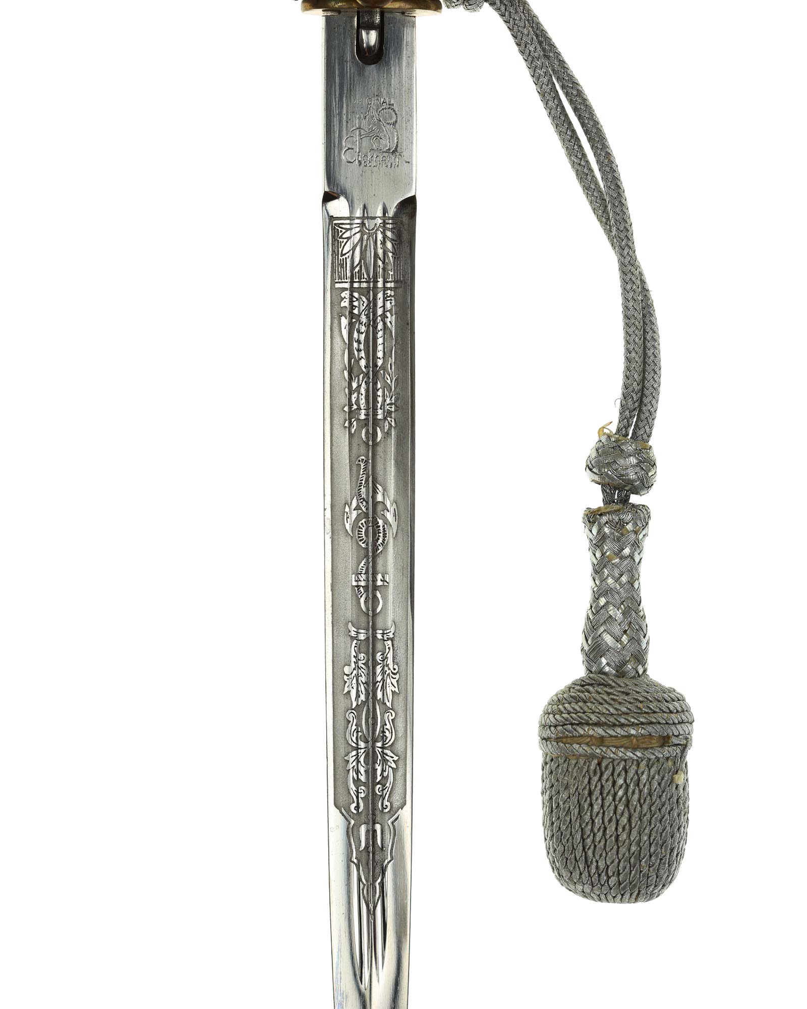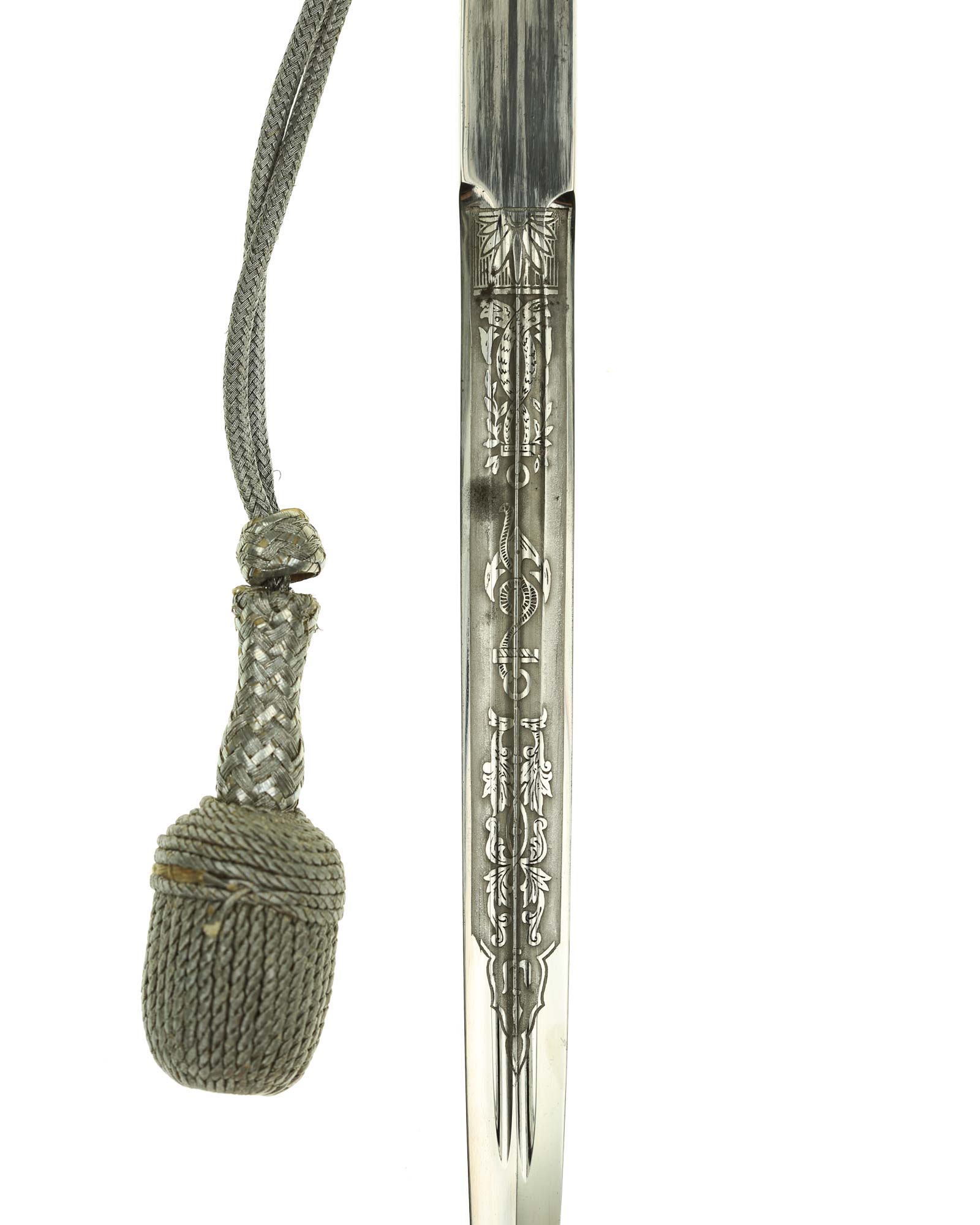 Клинок: Клинок стальной, прямой, двулезвийный, ромбического сечения, никелированный, с двумя долами. На клинке с двух сторон украшен травлением с изображением растительного орнамента и морской арматуры (якорь, обвитый канатом). На пяте клинка хорошо различимо клеймо фирмы-производителя - «Eickhorn Solingen» — клеймо немецкой фирмы Карл Айкхорн Золинген.