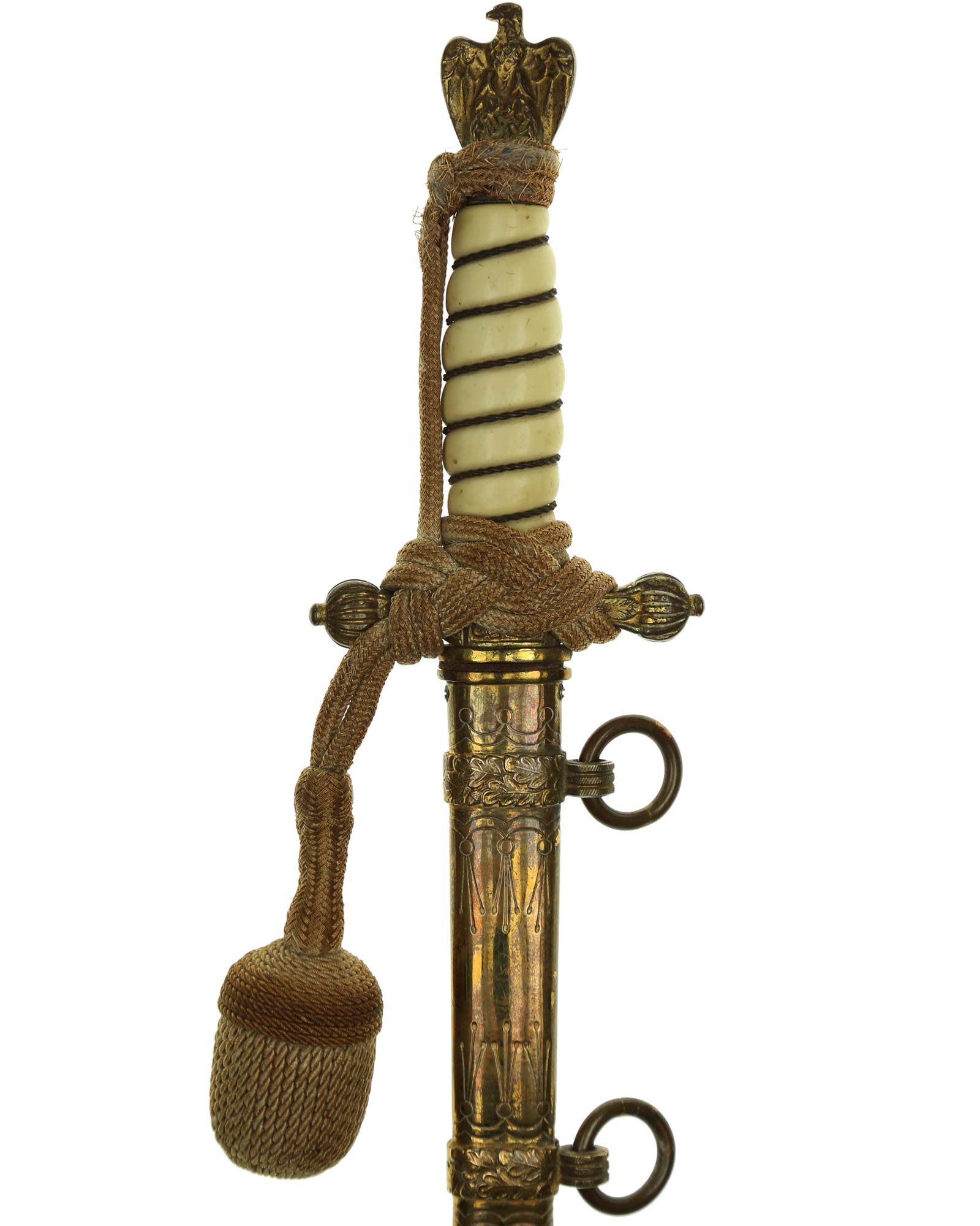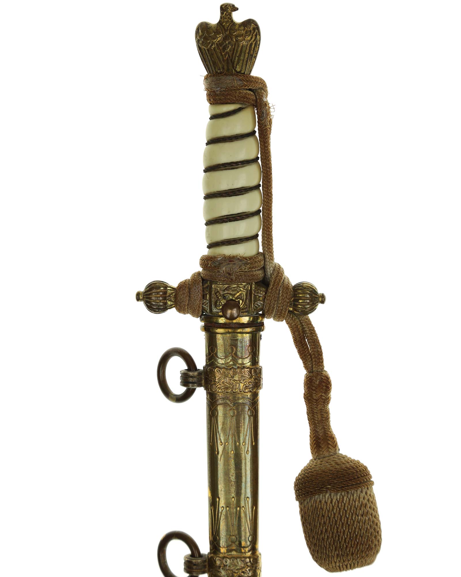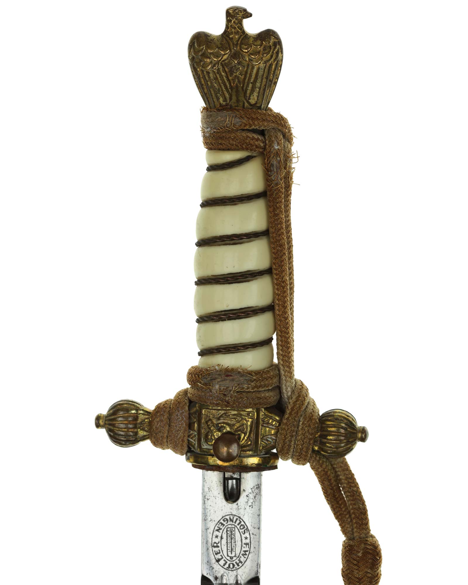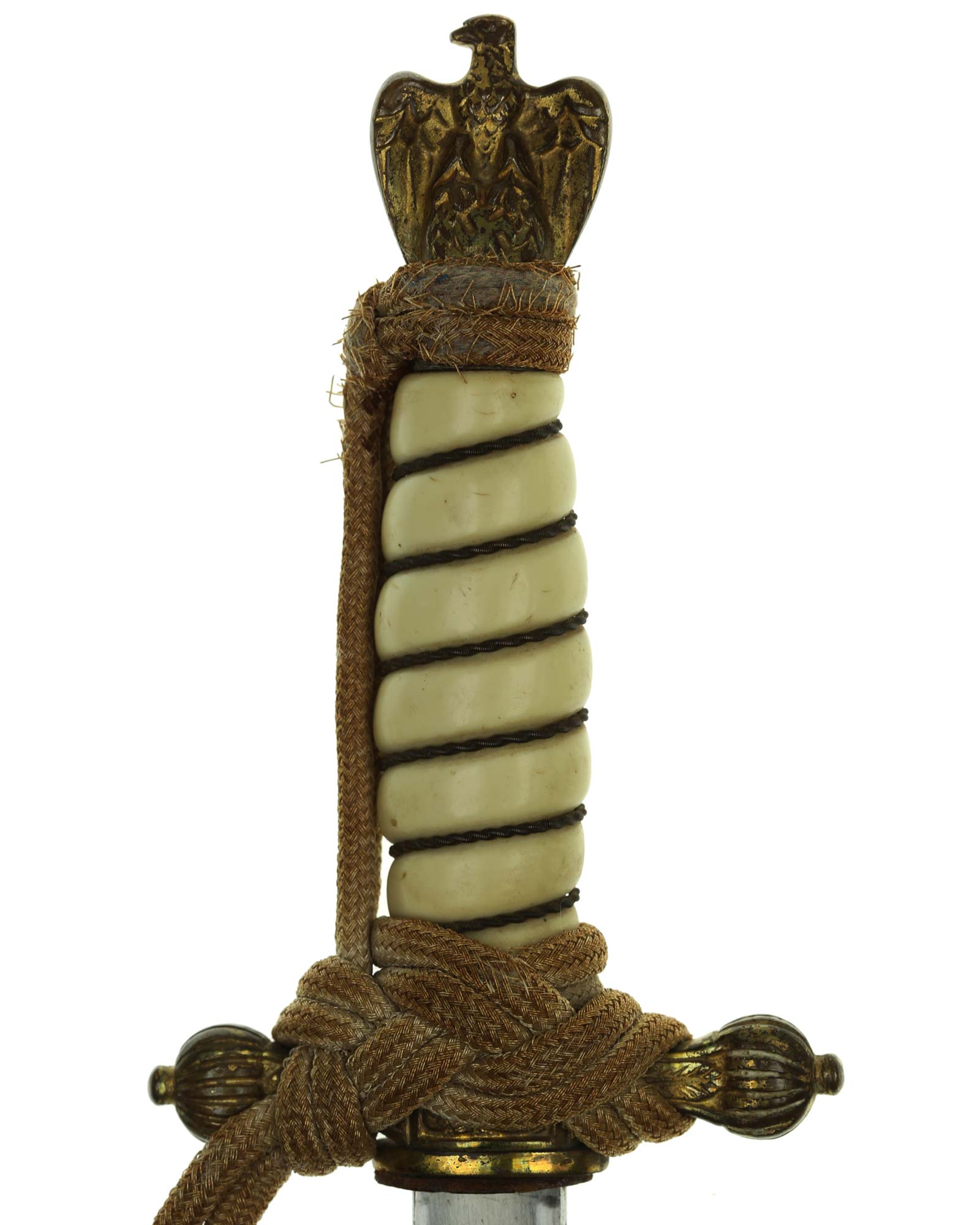Рукоять: Рукоять овального сечения, бочкообразная, из пластика. По спиральному желобку рукоять обвита стальной проволокой. Головка рукояти выполнена в виде орла, держащего в лапах венок с изображением свастики. В центре крестовины имеется кнопка пружинной защёлки фиксатора кортика в ножнах. Отлично сохранилось оригинальное позолоченное покрытие.