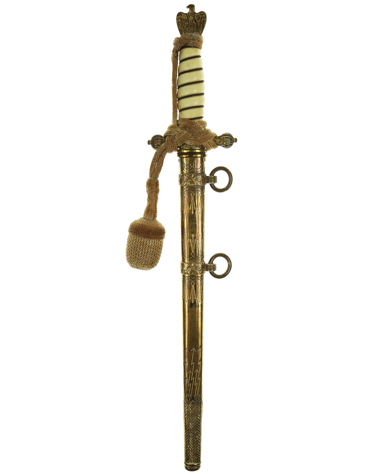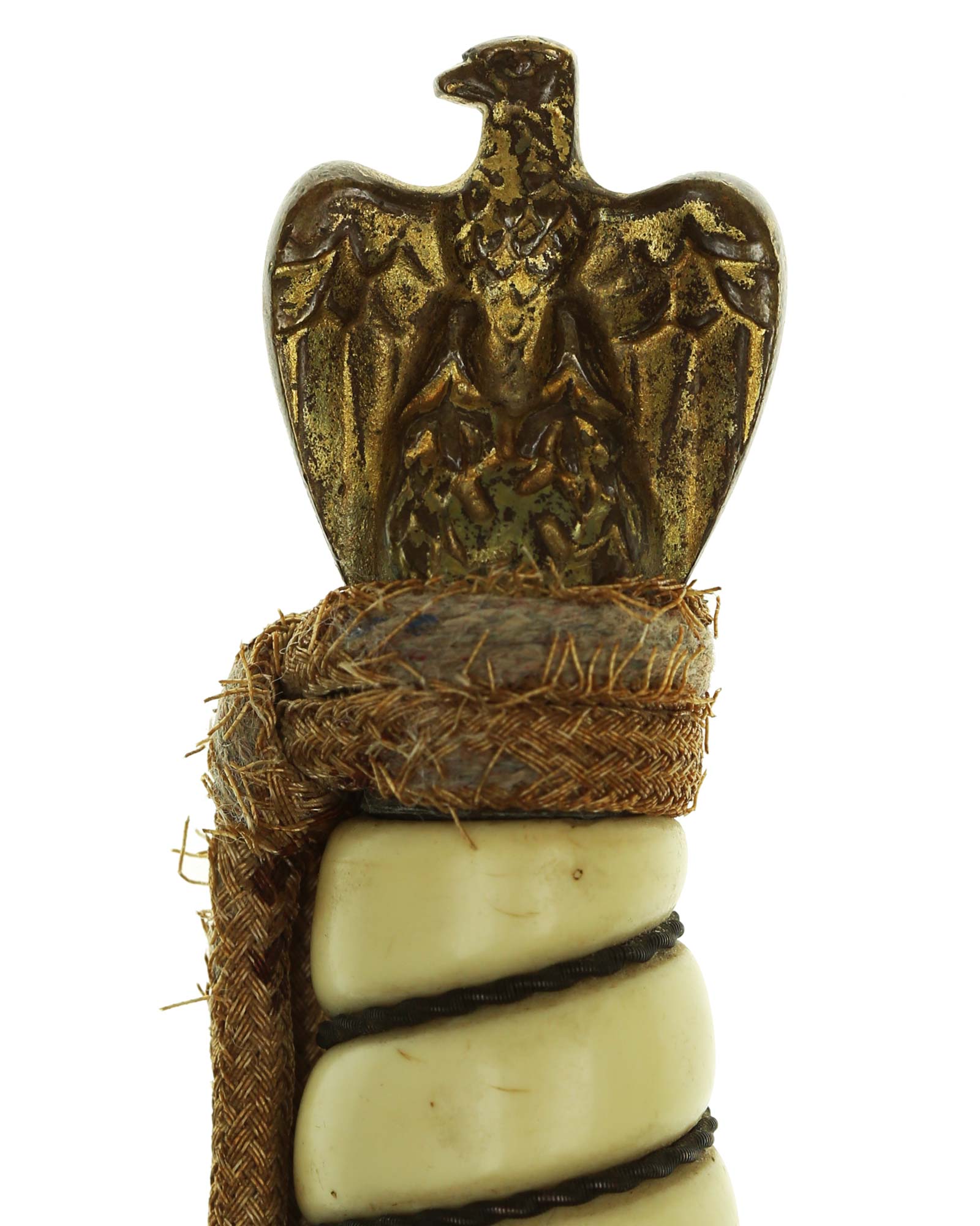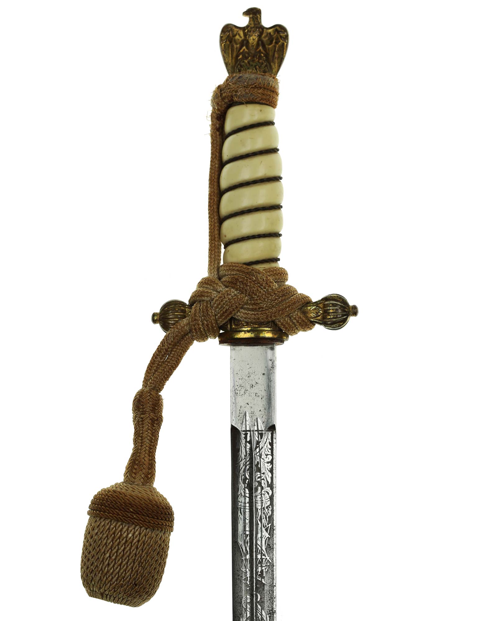 Рукоять: Рукоять овального сечения, бочкообразная, из пластика. По спиральному желобку рукоять обвита стальной проволокой. Головка рукояти выполнена в виде орла, держащего в лапах венок с изображением свастики. В центре крестовины имеется кнопка пружинной защёлки фиксатора кортика в ножнах. Отлично сохранилось оригинальное позолоченное покрытие.