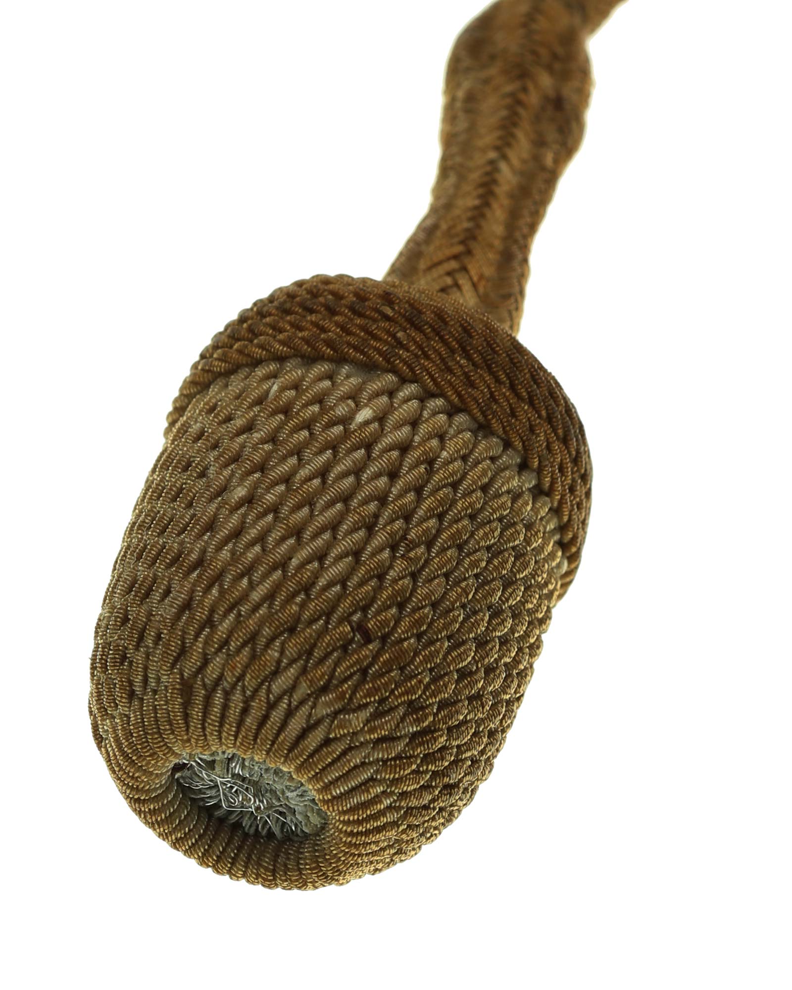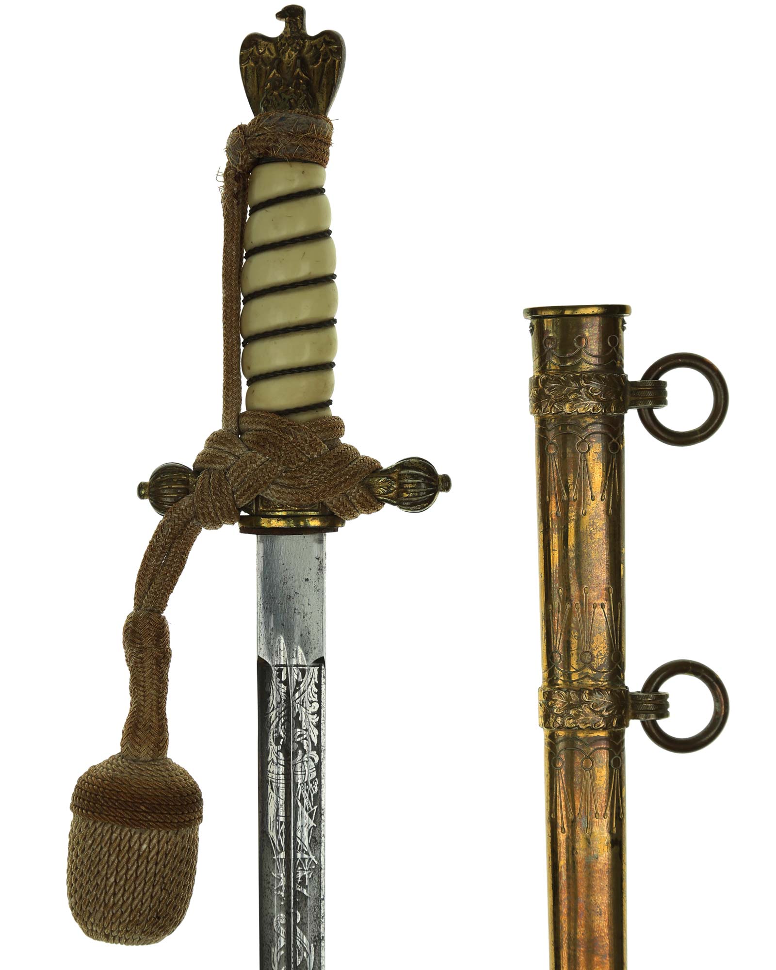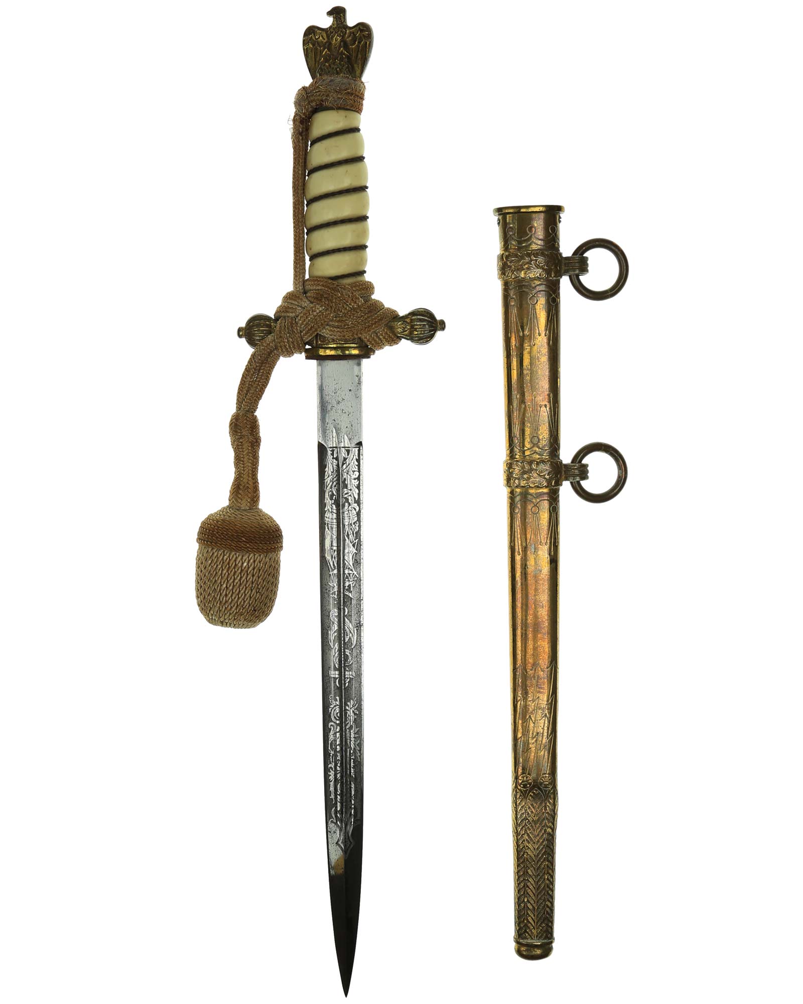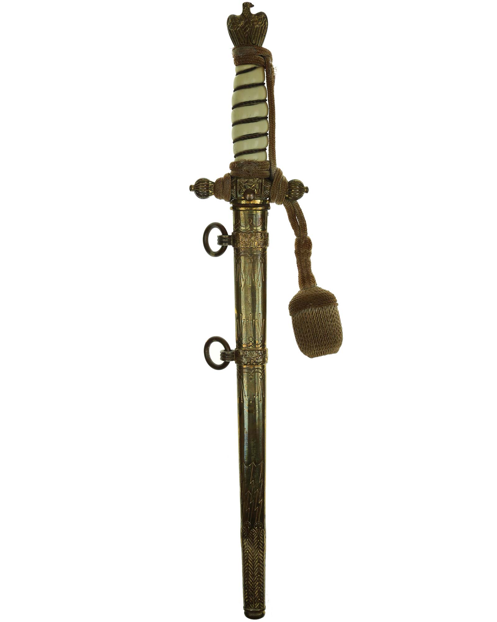 Рукоять: Рукоять овального сечения, бочкообразная, из пластика. По спиральному желобку рукоять обвита стальной проволокой. Головка рукояти выполнена в виде орла, держащего в лапах венок с изображением свастики. В центре крестовины имеется кнопка пружинной защёлки фиксатора кортика в ножнах. Отлично сохранилось оригинальное позолоченное покрытие.