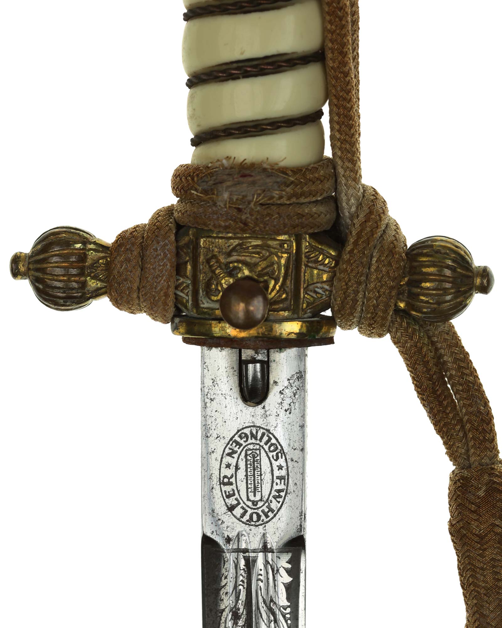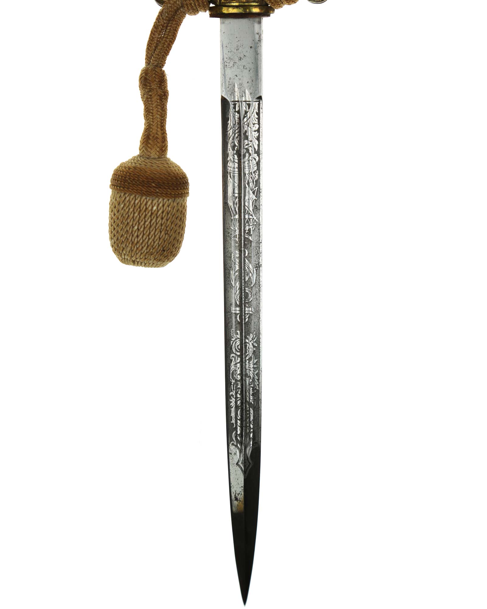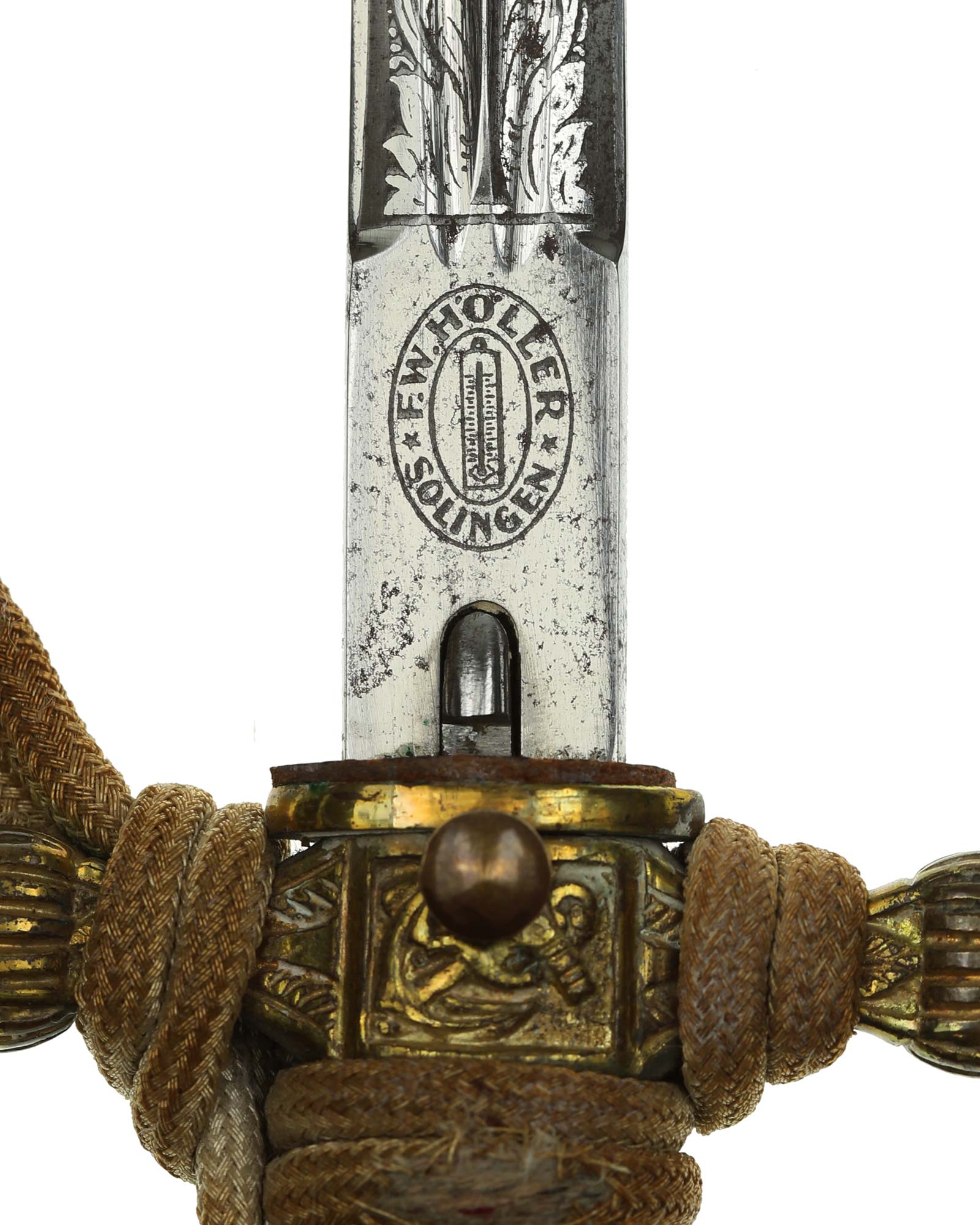 Клинок: Клинок стальной, прямой, двулезвийный, ромбического сечения, никелированный, с двумя долами. На клинке с двух сторон украшен травлением с изображением растительного орнамента и морской арматуры (якорь, обвитый канатом). На пяте клинка хорошо различимо клеймо фирмы-производителя - «F.W. Höller Solingen» — клеймо немецкой фирмы Ф. В. Хёллер Золинген.