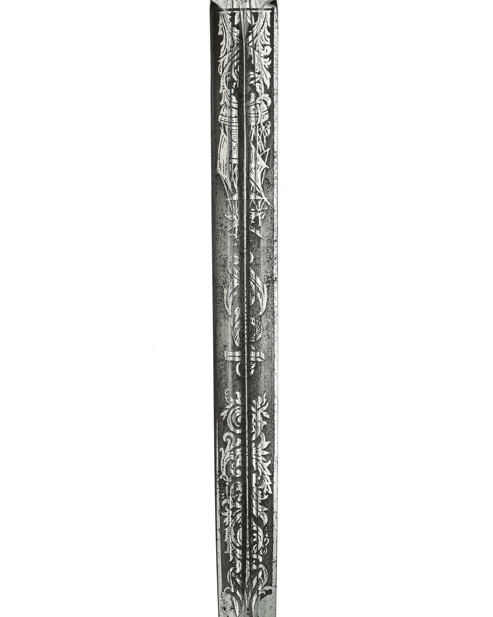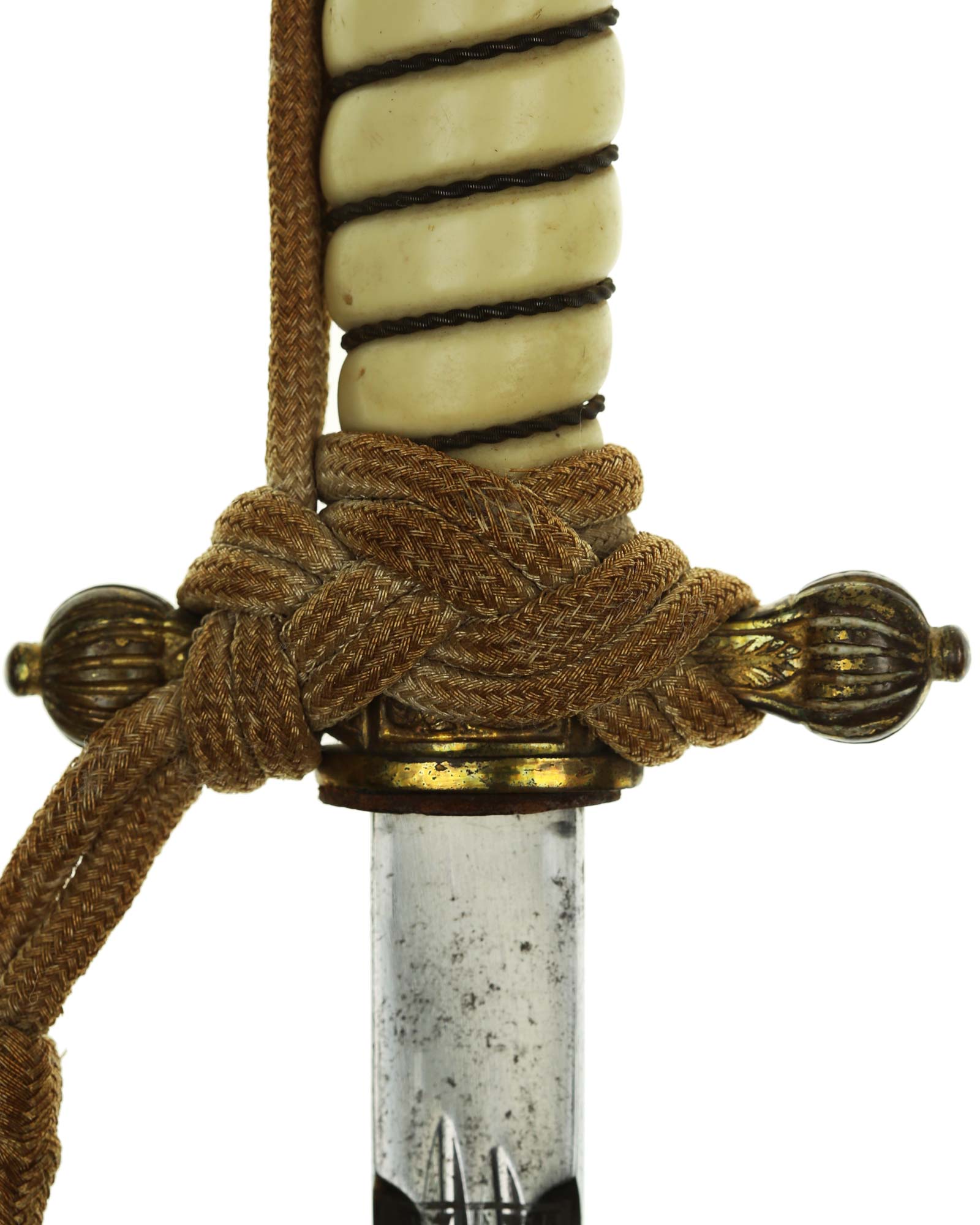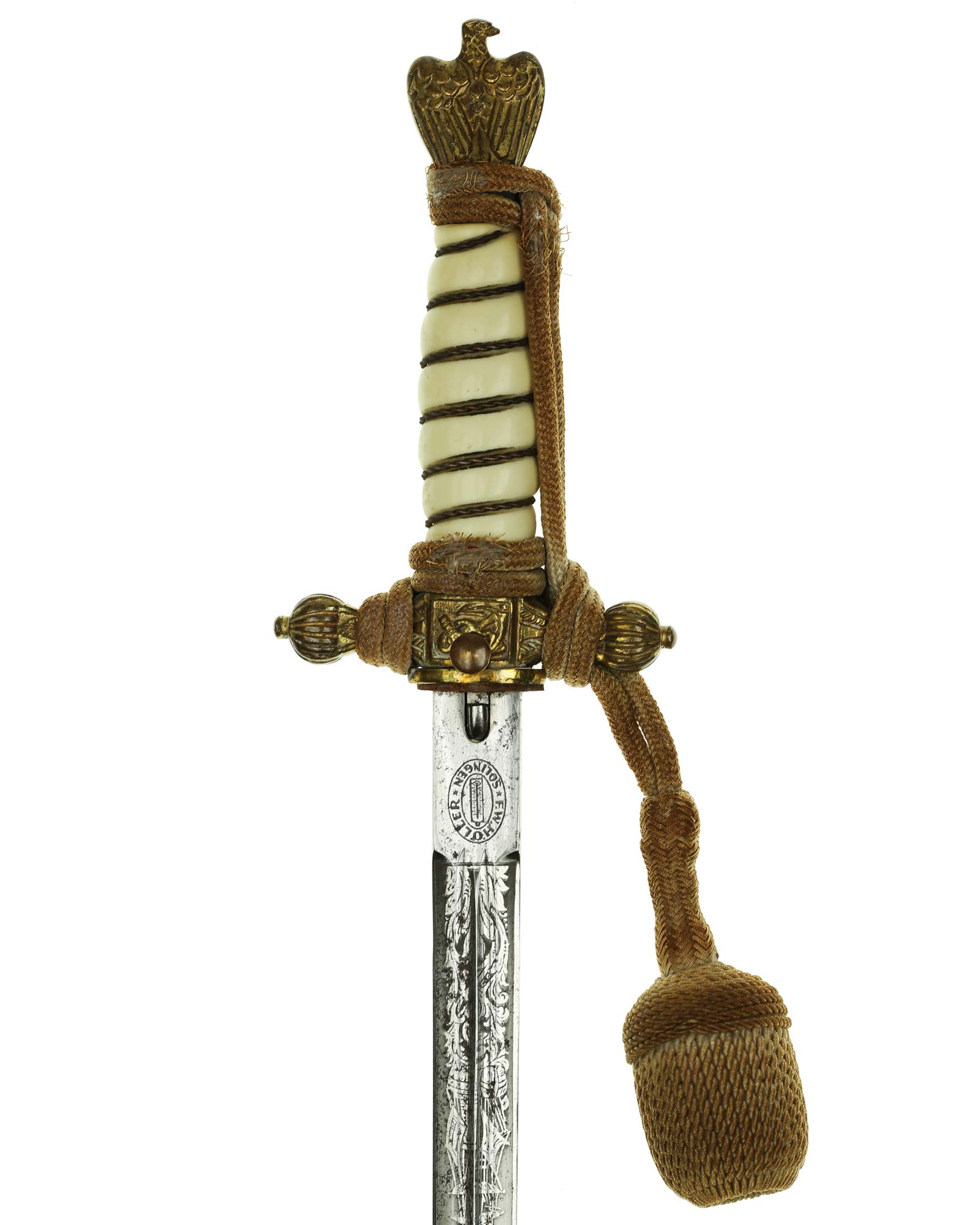 Клинок: Клинок стальной, прямой, двулезвийный, ромбического сечения, никелированный, с двумя долами. На клинке с двух сторон украшен травлением с изображением растительного орнамента и морской арматуры (якорь, обвитый канатом). На пяте клинка хорошо различимо клеймо фирмы-производителя - «F.W. Höller Solingen» — клеймо немецкой фирмы Ф. В. Хёллер Золинген.
