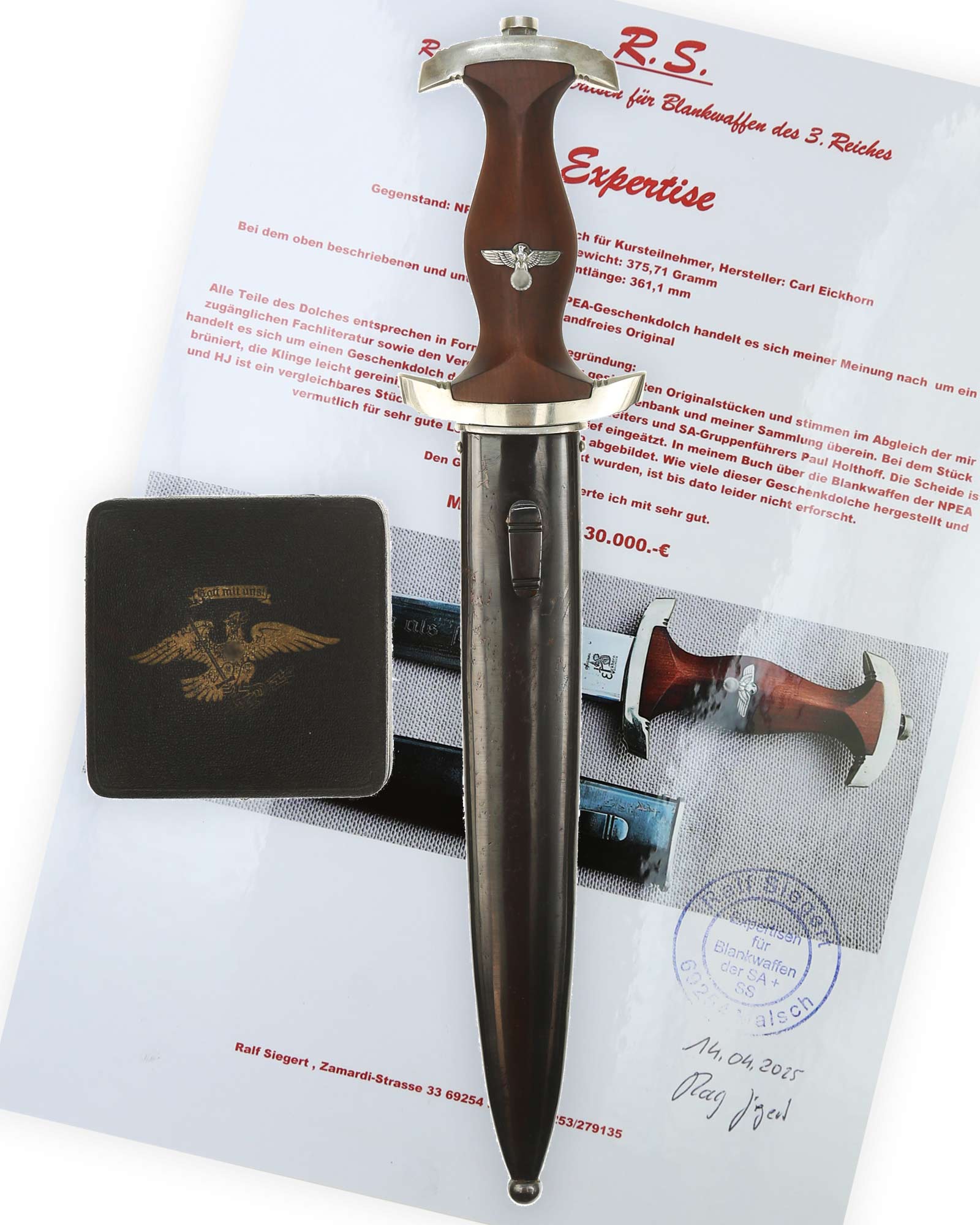 Ранний подарочный кинжал НПЕА [Национал-политические учебные заведения] обр. 1935 года. Чрезвычайно редкий вариант кинжала NPEA с полностью сохранившейся надписью от Пола Холтхоффа. Производитель фирма Carl Eickhorn Solingen (Карл Эйкхорн Золинген).