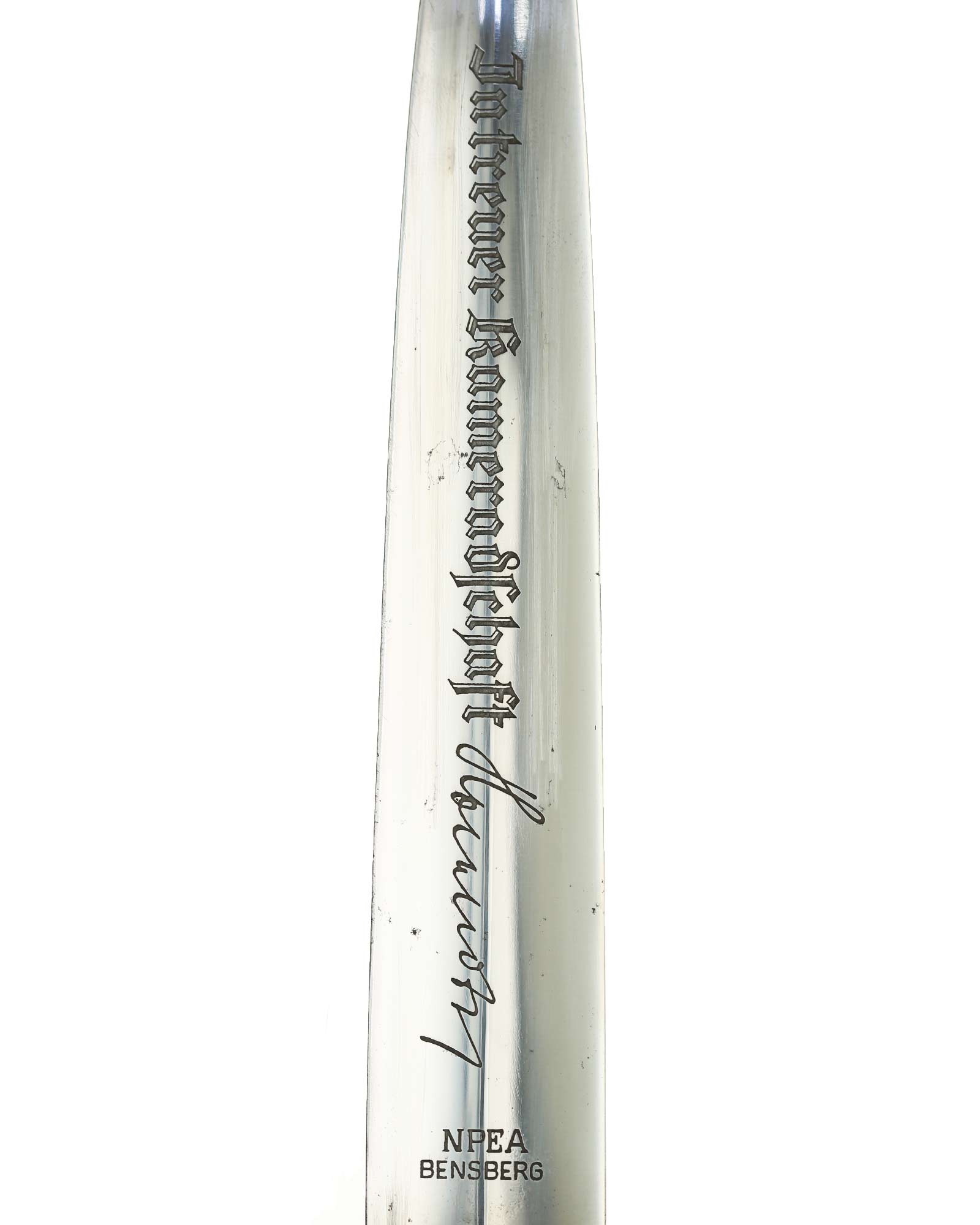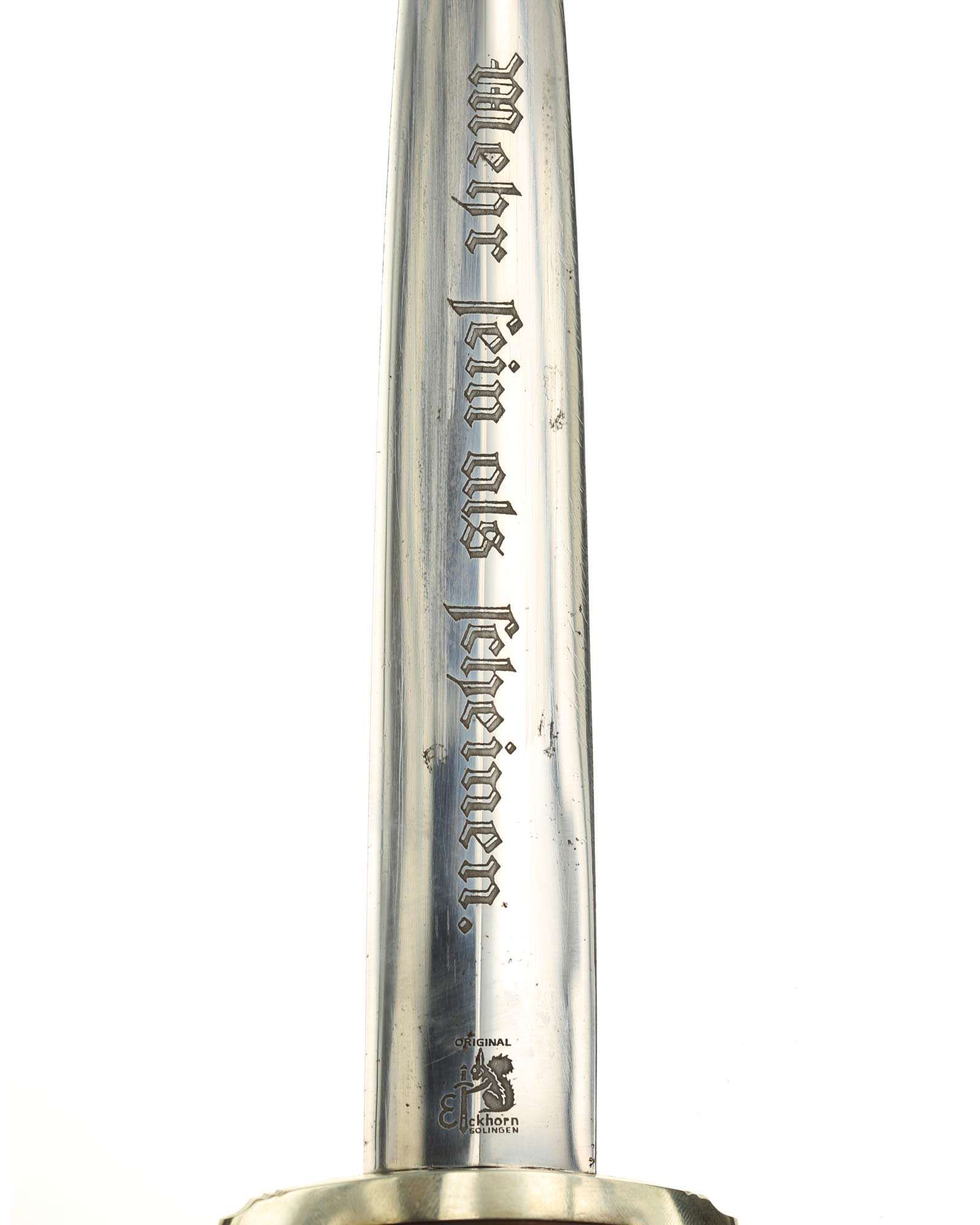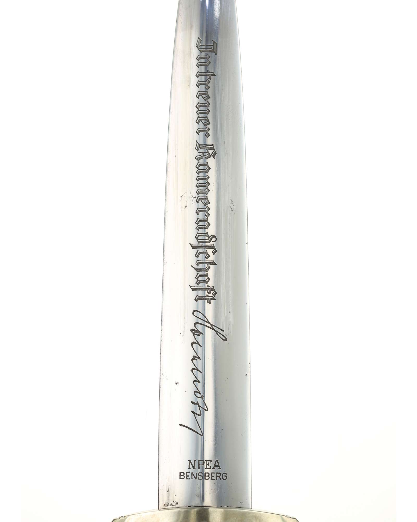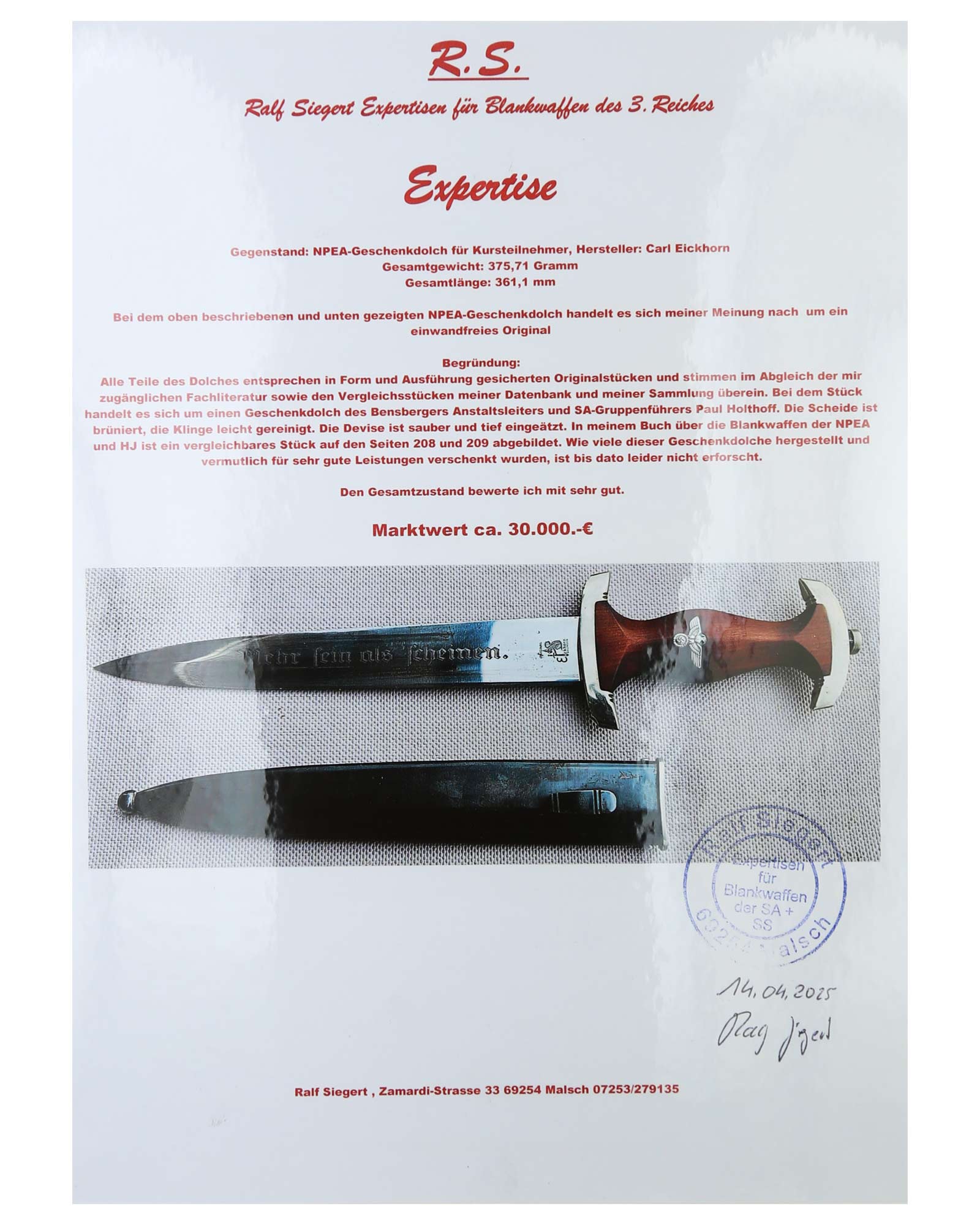 Клинок: Клинок стальной, классический кинжального типа, прямой, двулезвийный, с выраженным центральным ребром. Чрезвычайно редкий вариант кинжала NPEA с полностью сохранившейся наградной надписью от Холтхоффа на оборотной стороне клинка. Кинжал изготовлен в середине 1930-х годов известной фирмой Carl Eickhorn Solingen (Карл Эйкхорн Золинген), клеймо на клинке на лицевой стороне, и традиционно нанесен девиз NPEA Mehr Sein als Scheinen «Быть лучше, чем кажешься». На оборотной стороне помещена дарственная надпись "In treuer Kameradschaft Holthoff - NPEA Bensberg" (В верном товариществе Холтхофф - NPEA Bensberg).
