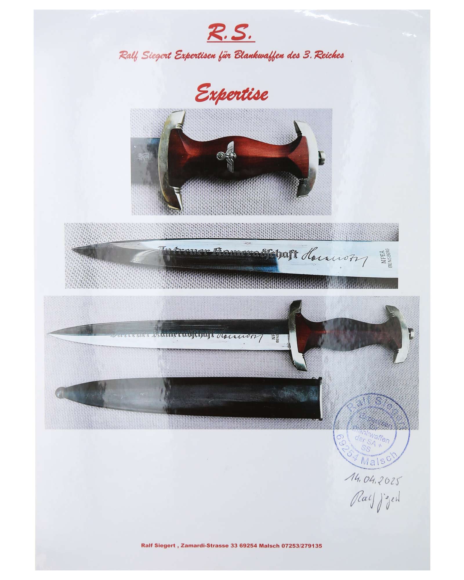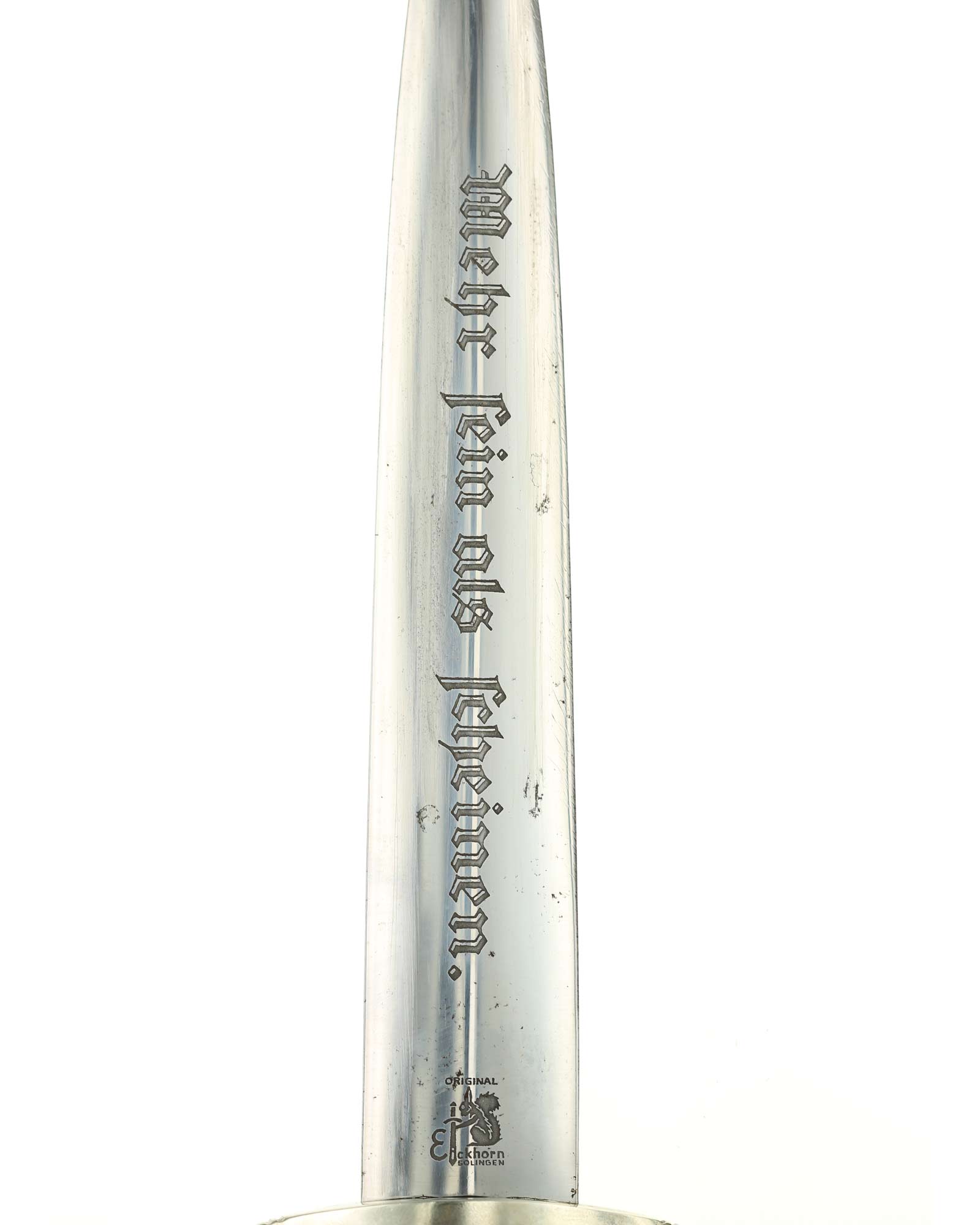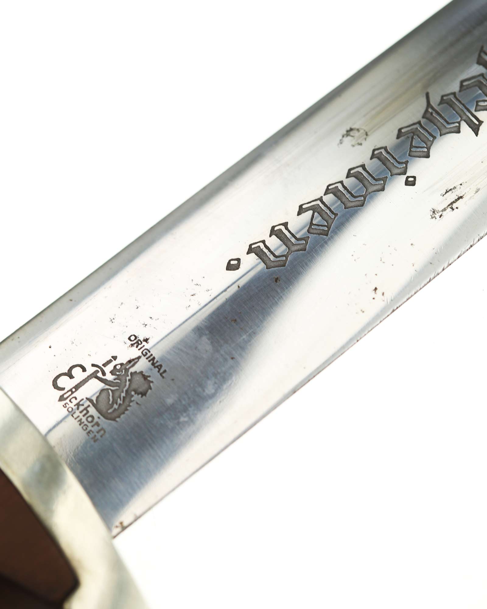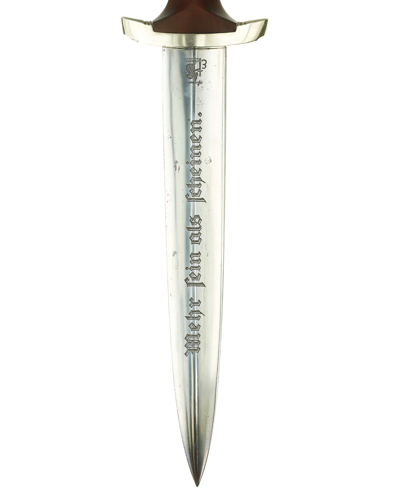 Клинок: Клинок стальной, классический кинжального типа, прямой, двулезвийный, с выраженным центральным ребром. Чрезвычайно редкий вариант кинжала NPEA с полностью сохранившейся наградной надписью от Холтхоффа на оборотной стороне клинка. Кинжал изготовлен в середине 1930-х годов известной фирмой Carl Eickhorn Solingen (Карл Эйкхорн Золинген), клеймо на клинке на лицевой стороне, и традиционно нанесен девиз NPEA Mehr Sein als Scheinen «Быть лучше, чем кажешься». На оборотной стороне помещена дарственная надпись "In treuer Kameradschaft Holthoff - NPEA Bensberg" (В верном товариществе Холтхофф - NPEA Bensberg).