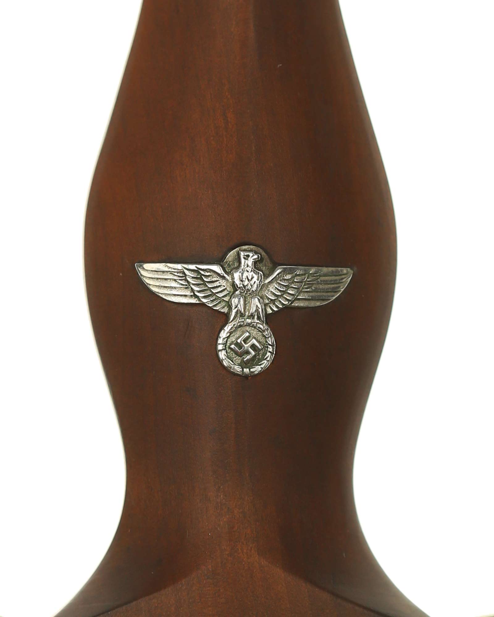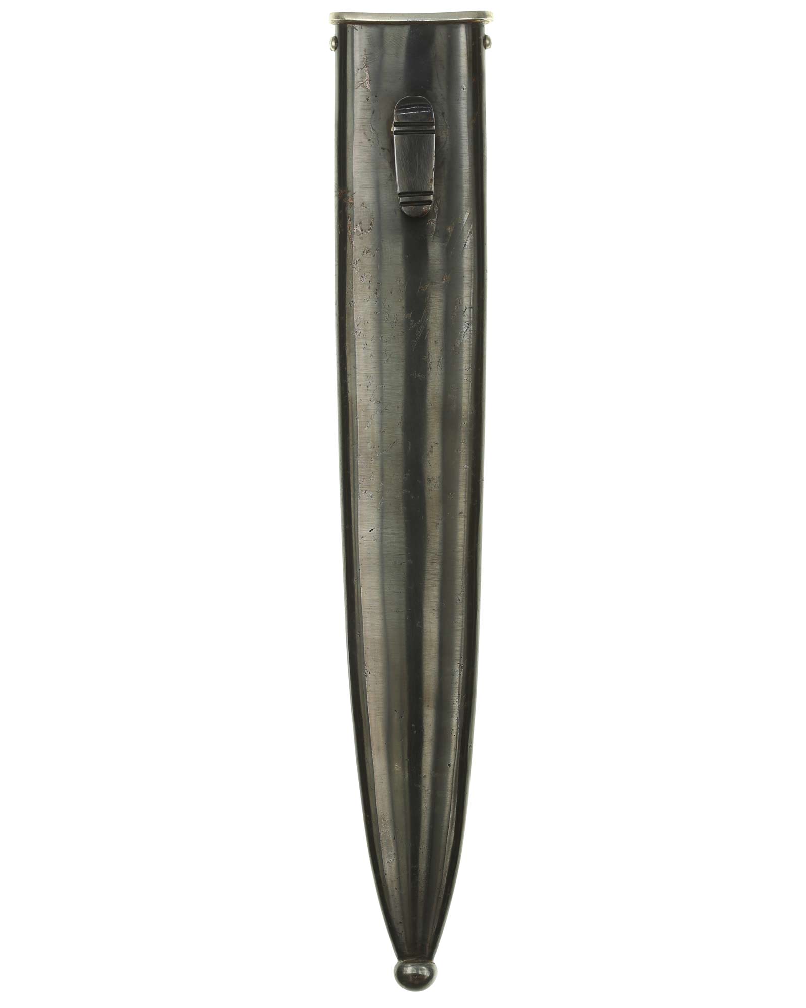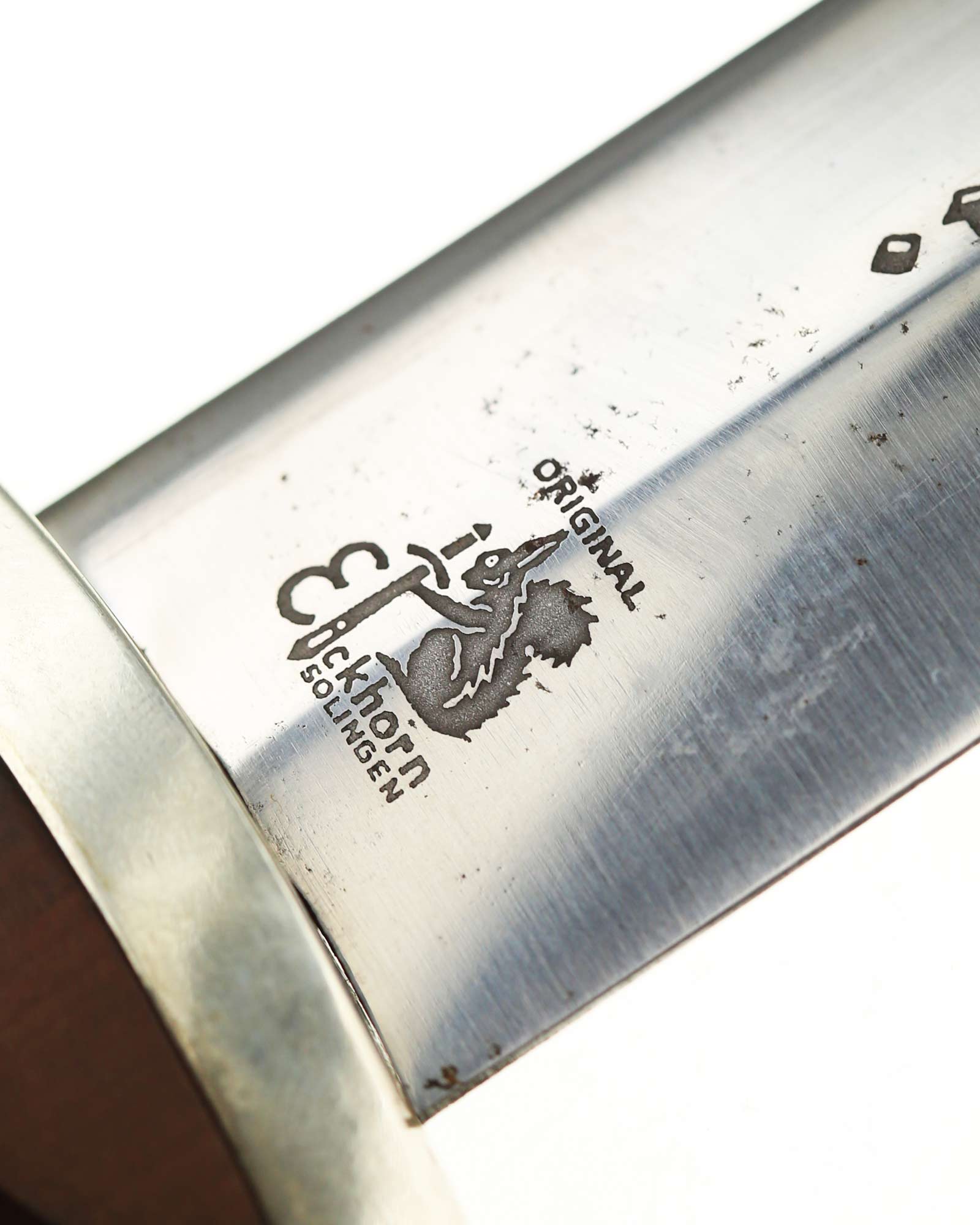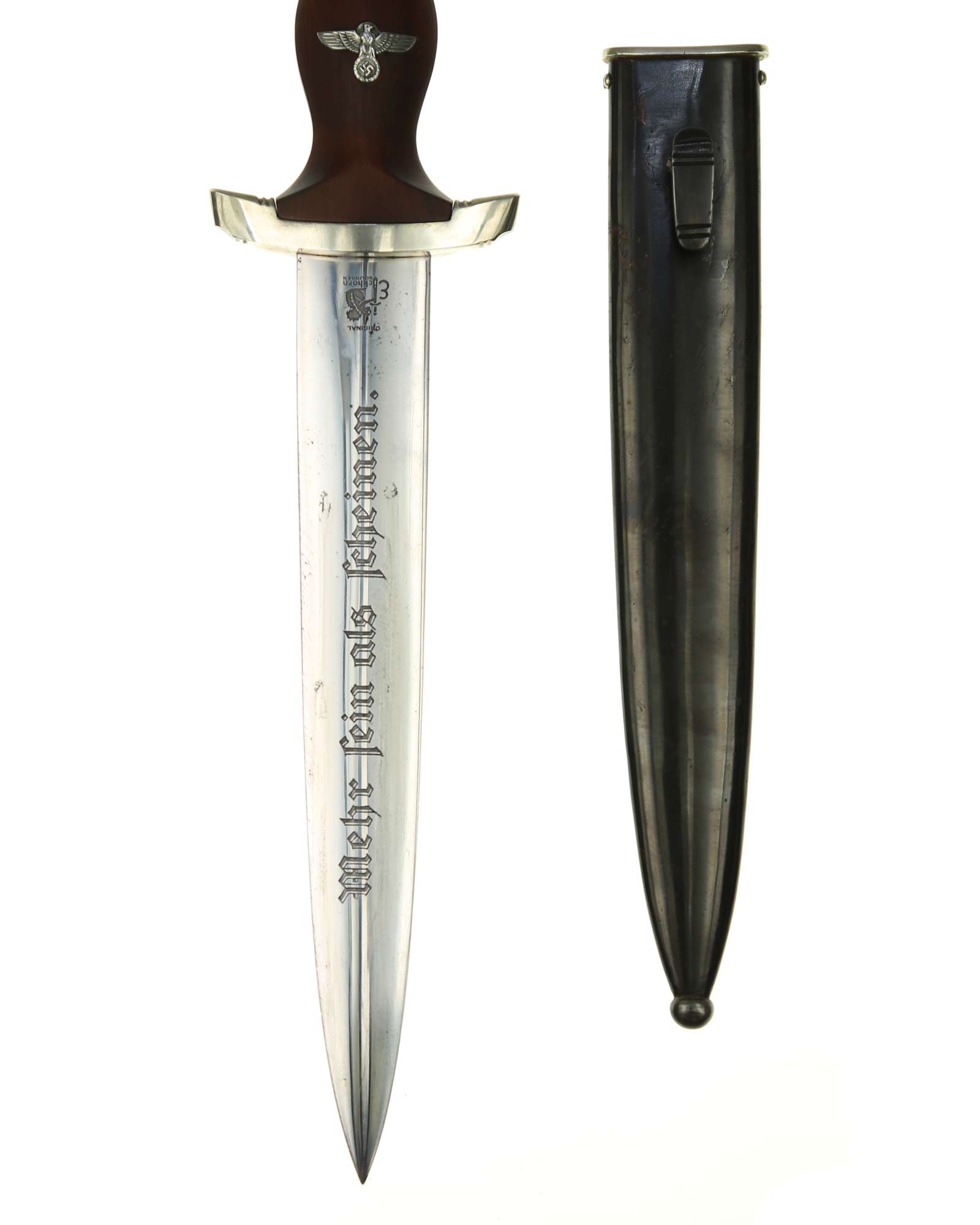 Клинок: Клинок стальной, классический кинжального типа, прямой, двулезвийный, с выраженным центральным ребром. Чрезвычайно редкий вариант кинжала NPEA с полностью сохранившейся наградной надписью от Холтхоффа на оборотной стороне клинка. Кинжал изготовлен в середине 1930-х годов известной фирмой Carl Eickhorn Solingen (Карл Эйкхорн Золинген), клеймо на клинке на лицевой стороне, и традиционно нанесен девиз NPEA Mehr Sein als Scheinen «Быть лучше, чем кажешься». На оборотной стороне помещена дарственная надпись "In treuer Kameradschaft Holthoff - NPEA Bensberg" (В верном товариществе Холтхофф - NPEA Bensberg).
