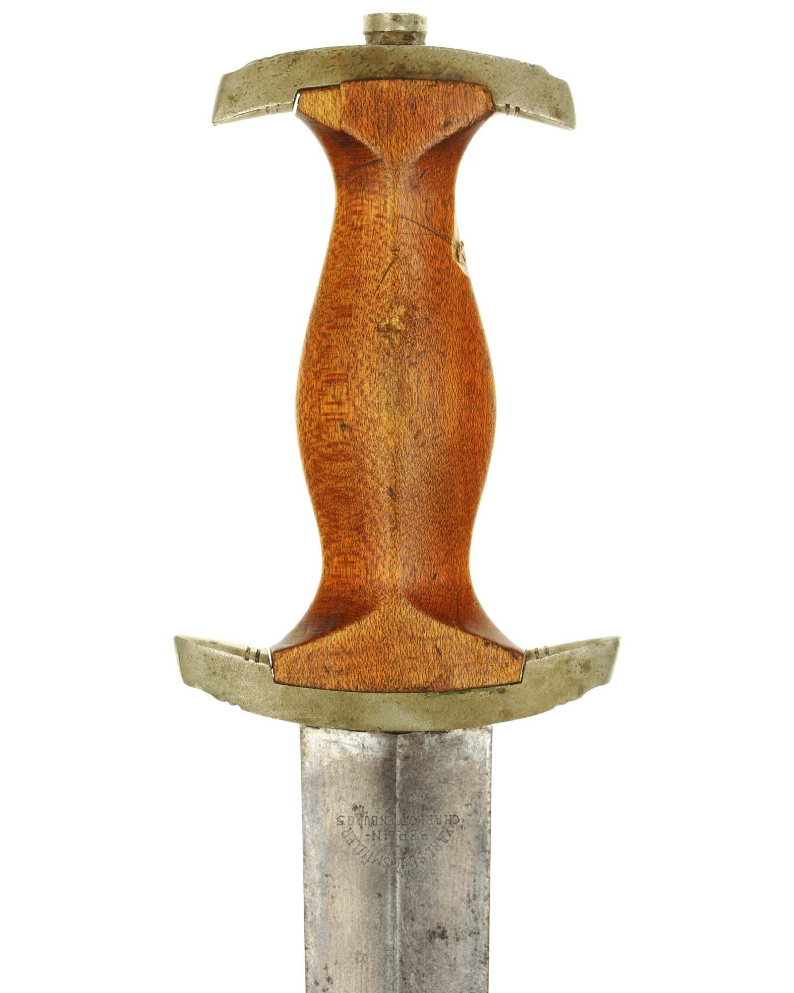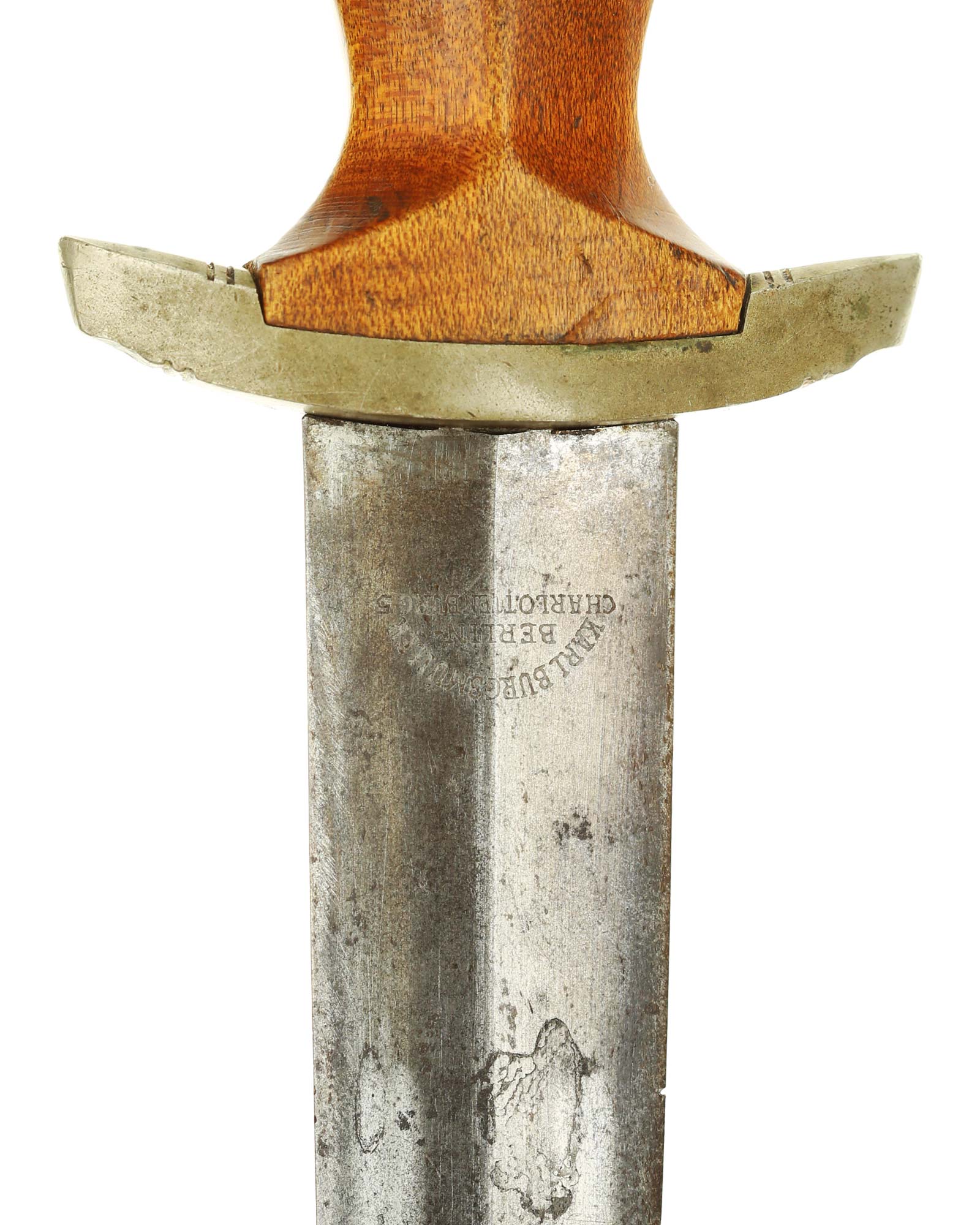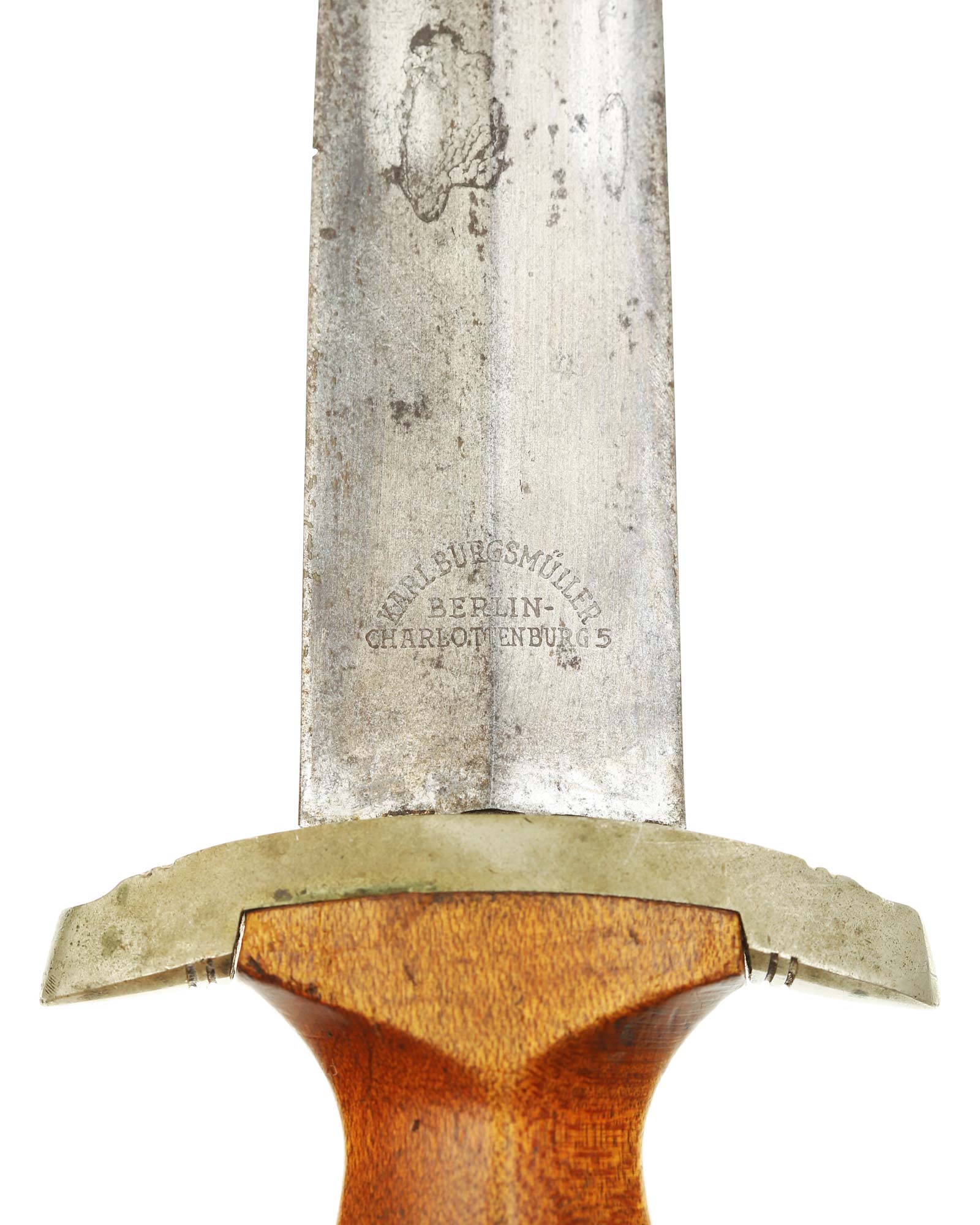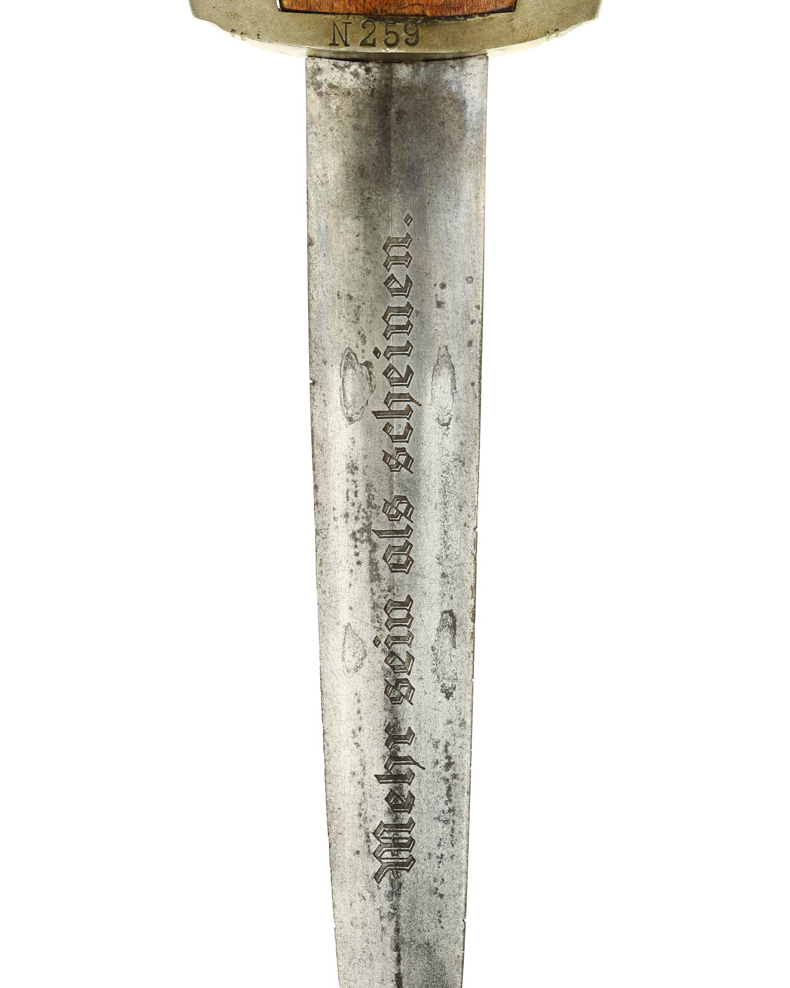 Клинок: Клинок стальной, прямой, двулезвийный, плоский, ромбический, плавно сужающийся к острию, полированный. На лицевой стороне надпись готическим шрифтом «Mehr Sein als Scheinen» — «Больше быть, чем казаться». Клинок маркирован клеймом производителя (дистрибьютор) - Karl Burgsmüller Berlin.