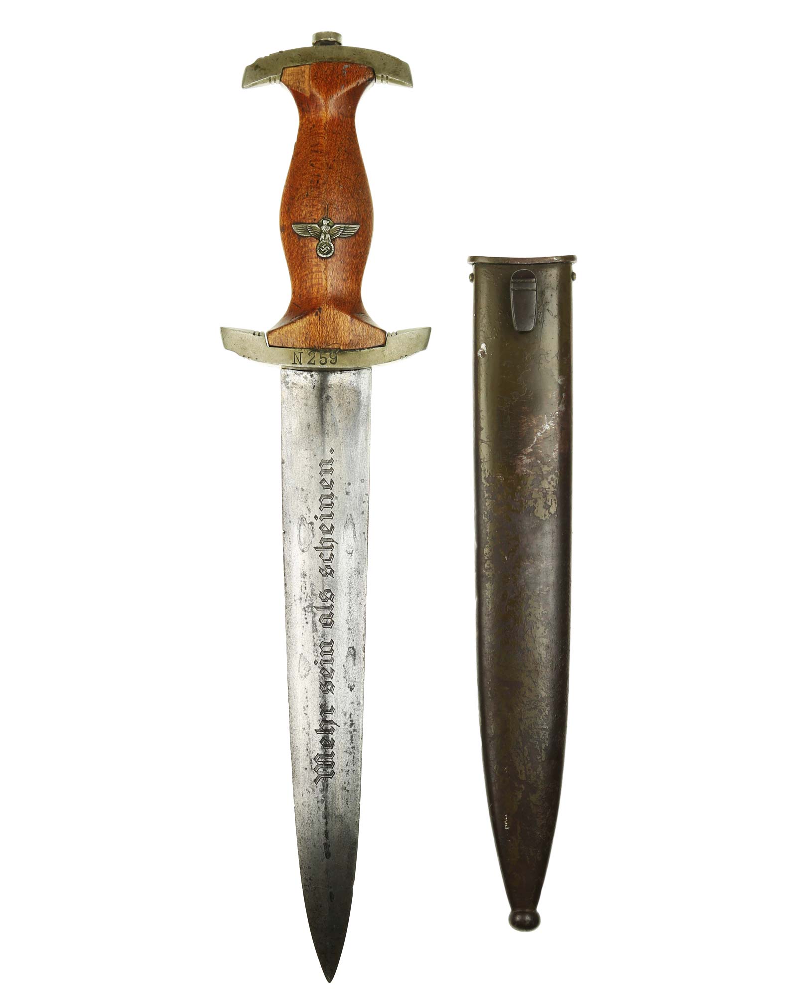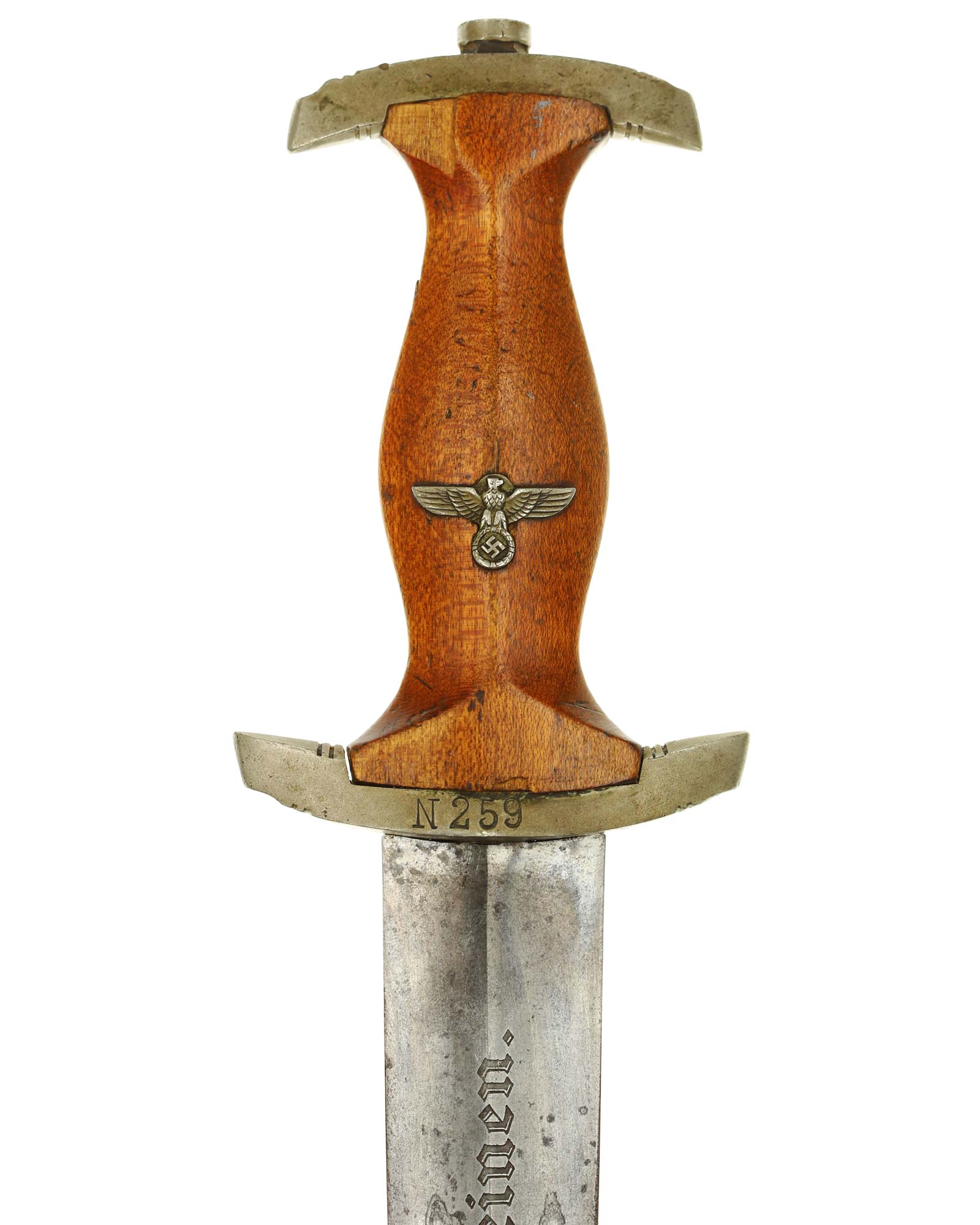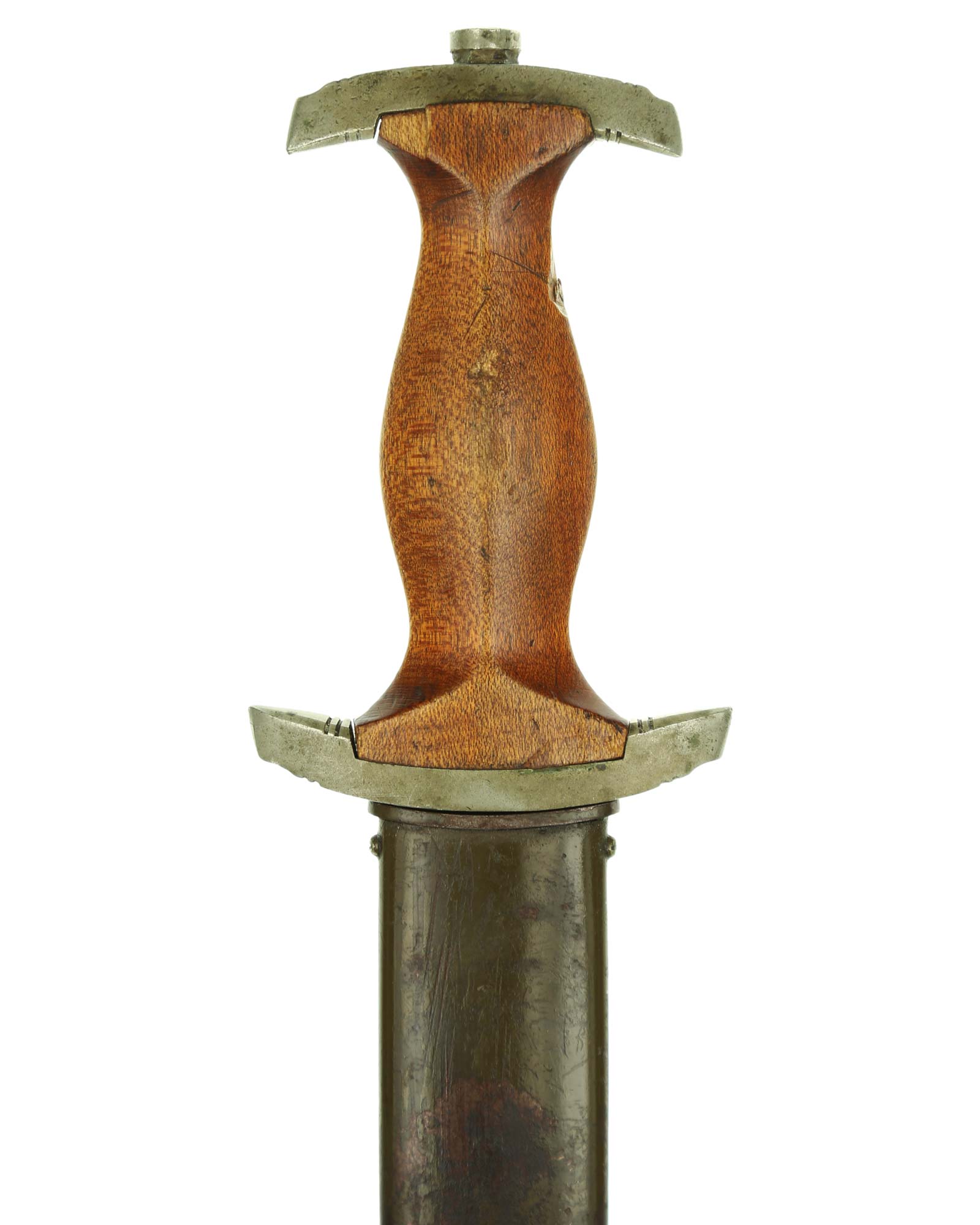 Клинок: Клинок стальной, прямой, двулезвийный, плоский, ромбический, плавно сужающийся к острию, полированный. На лицевой стороне надпись готическим шрифтом «Mehr Sein als Scheinen» — «Больше быть, чем казаться». Клинок маркирован клеймом производителя (дистрибьютор) - Karl Burgsmüller Berlin.