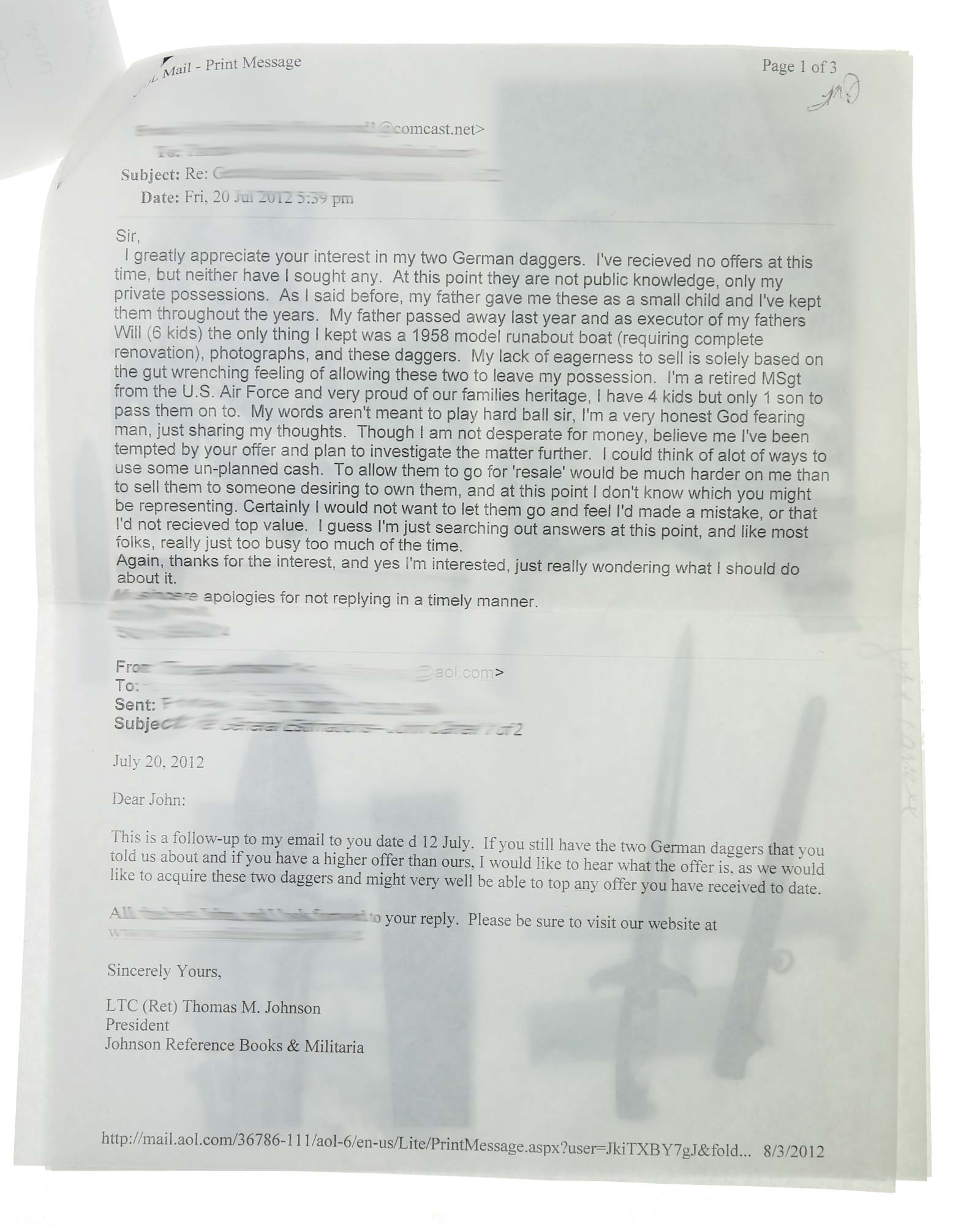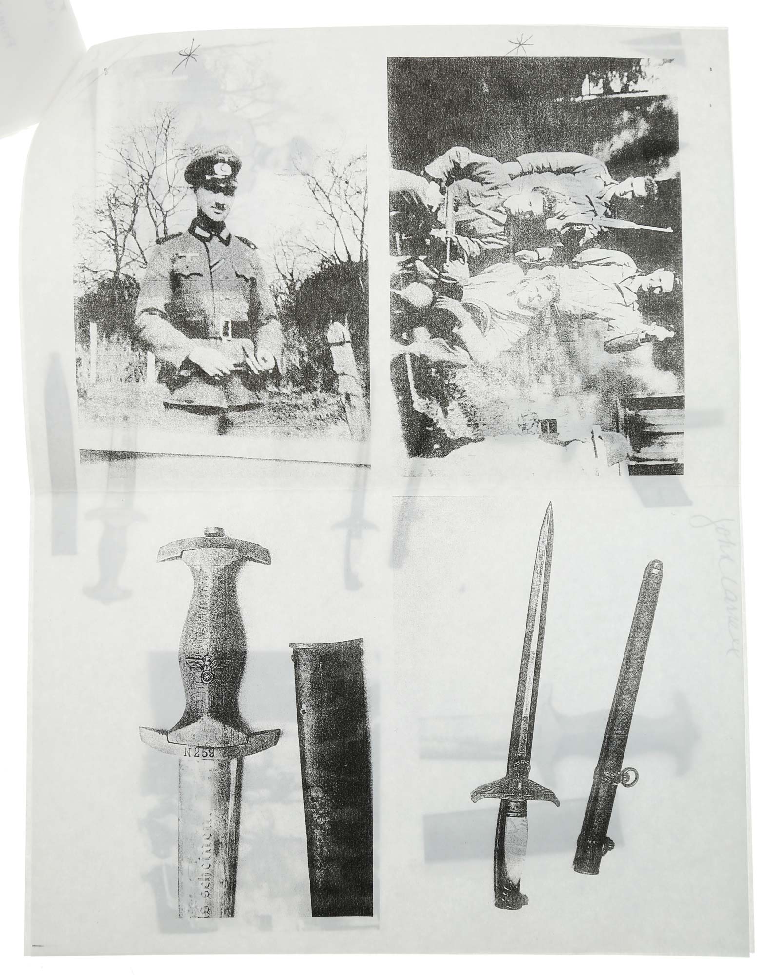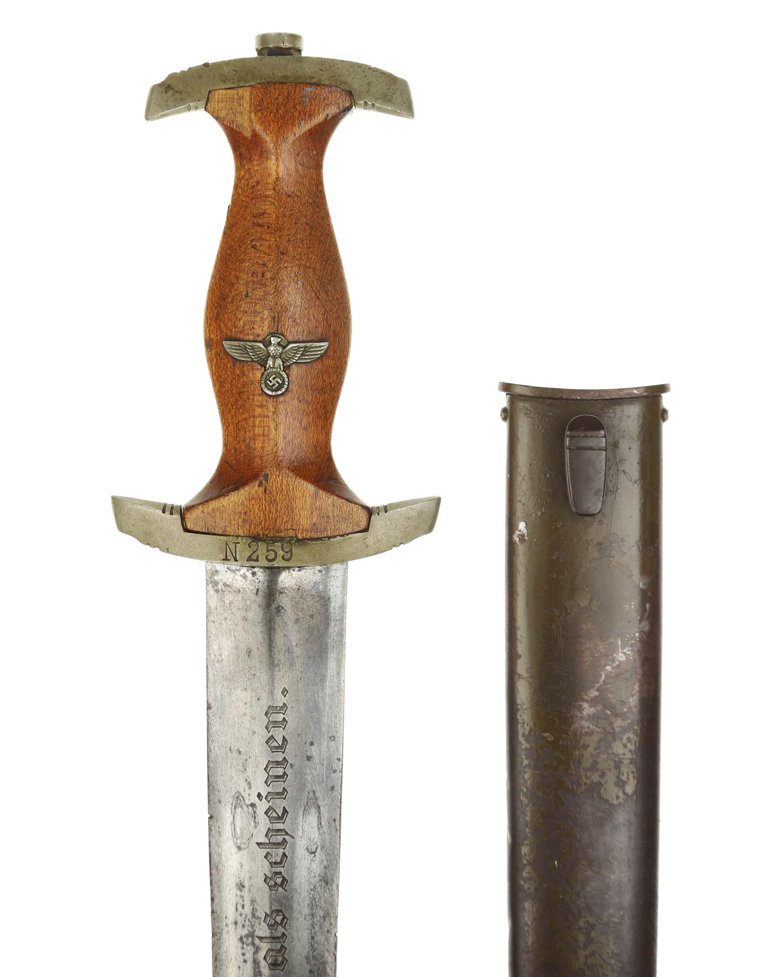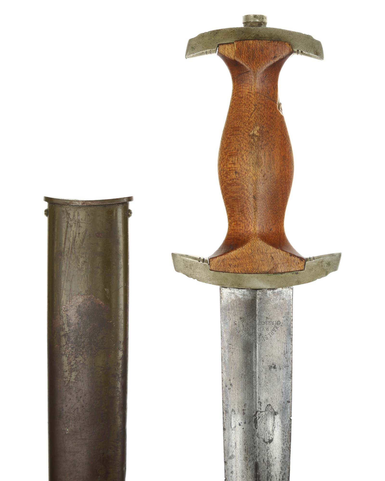 Клинок: Клинок стальной, прямой, двулезвийный, плоский, ромбический, плавно сужающийся к острию, полированный. На лицевой стороне надпись готическим шрифтом «Mehr Sein als Scheinen» — «Больше быть, чем казаться». Клинок маркирован клеймом производителя (дистрибьютор) - Karl Burgsmüller Berlin.
