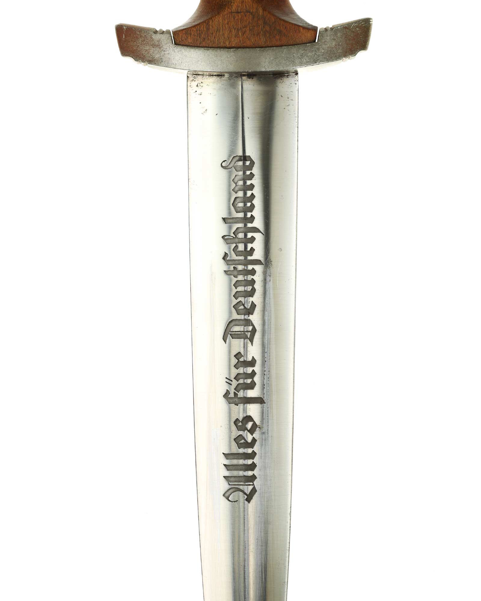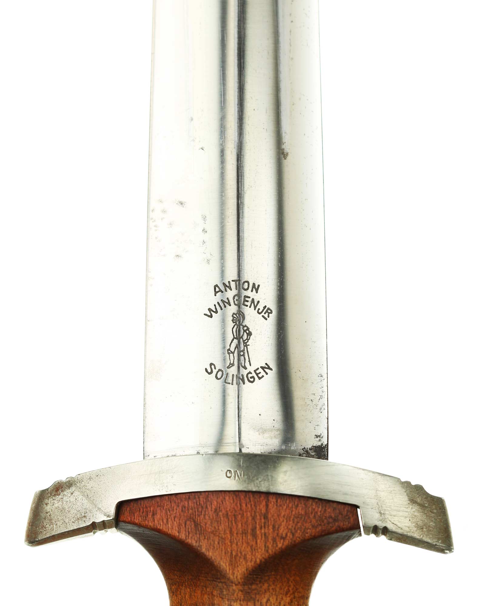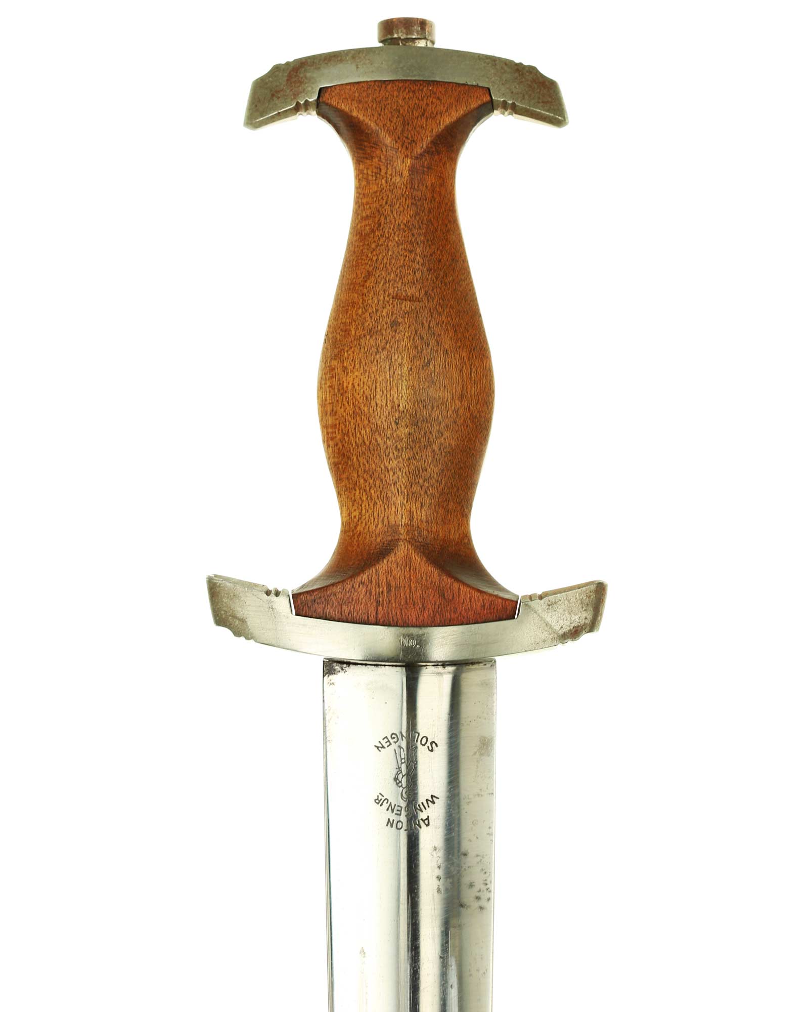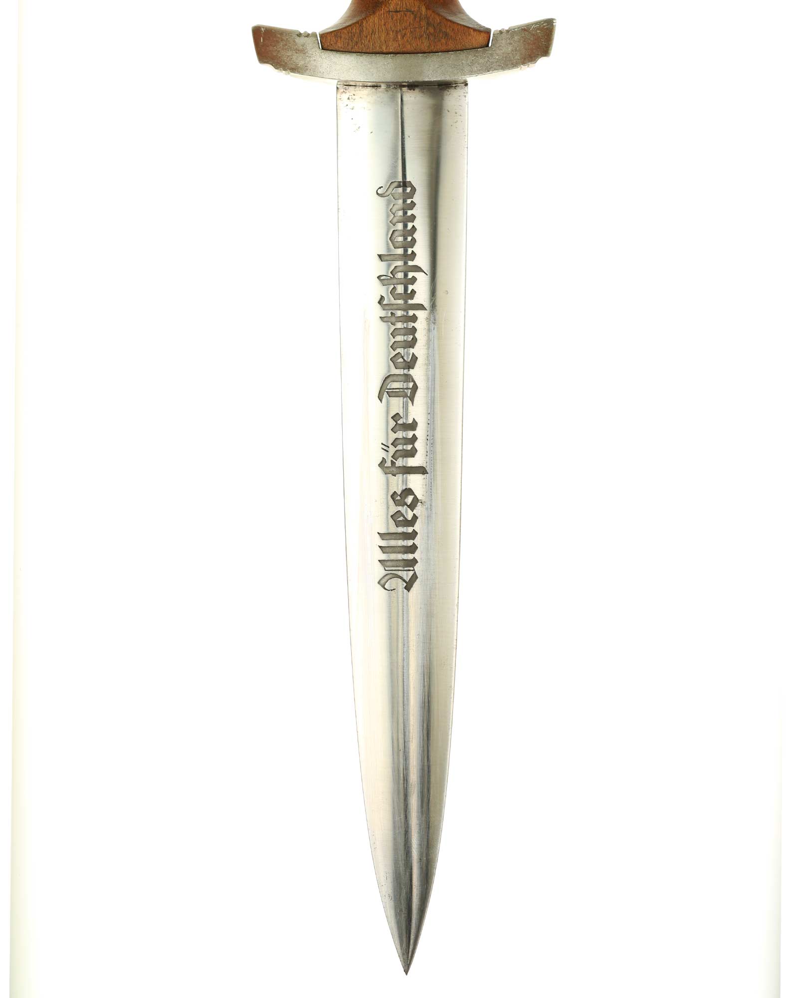 Клинок: Клинок кинжала прямой, стальной, двулезвийный, кинжального типа, с выраженным центральным ребром. На одной стороне клинка методом травления нанесен девиз СА «Всё для Германии» (Alles für Deutchland). Клинок на оборотной стороне у основания стоит клеймо производителя Антон Винген Золинген (Anton Wingen Jr. Solingen).