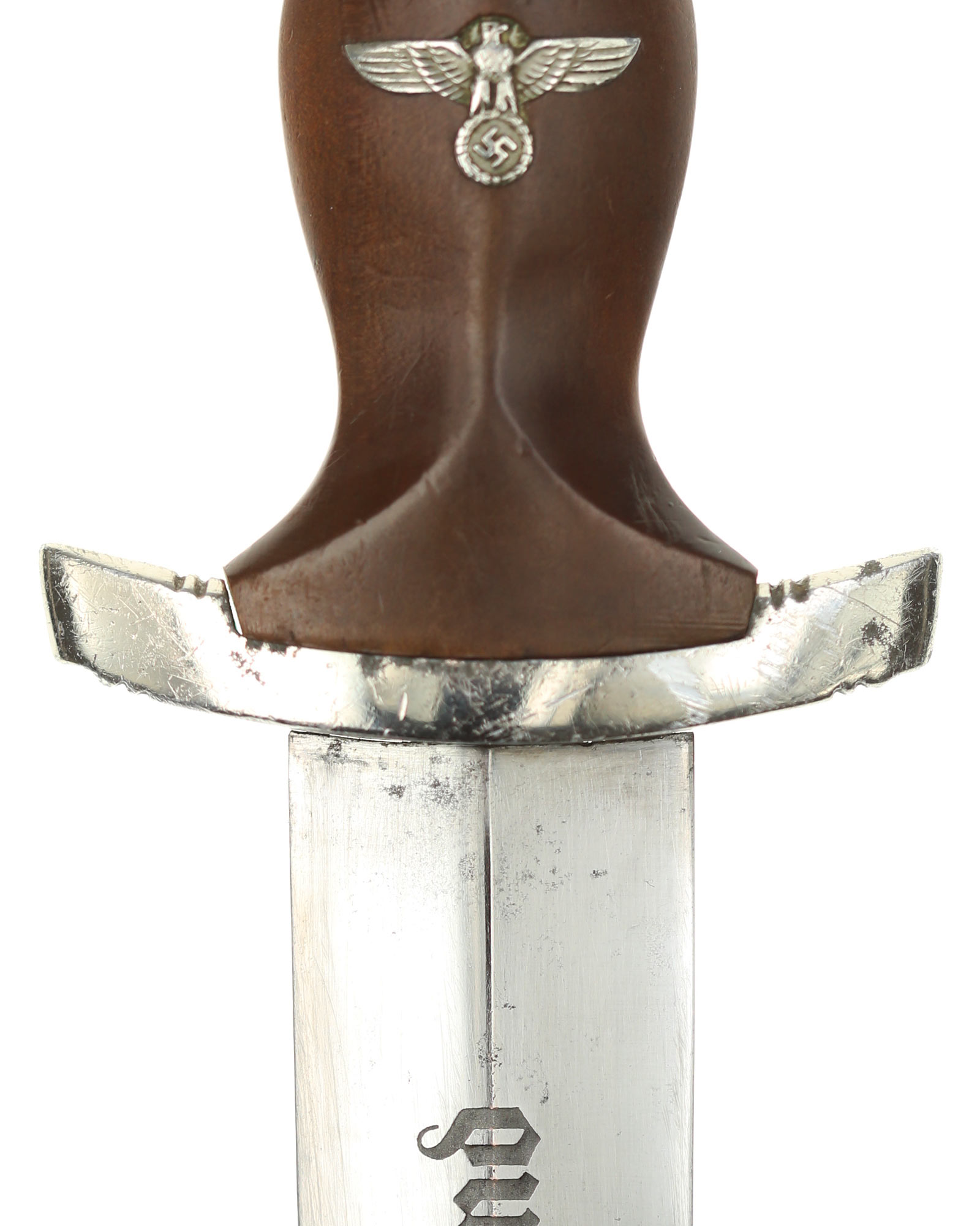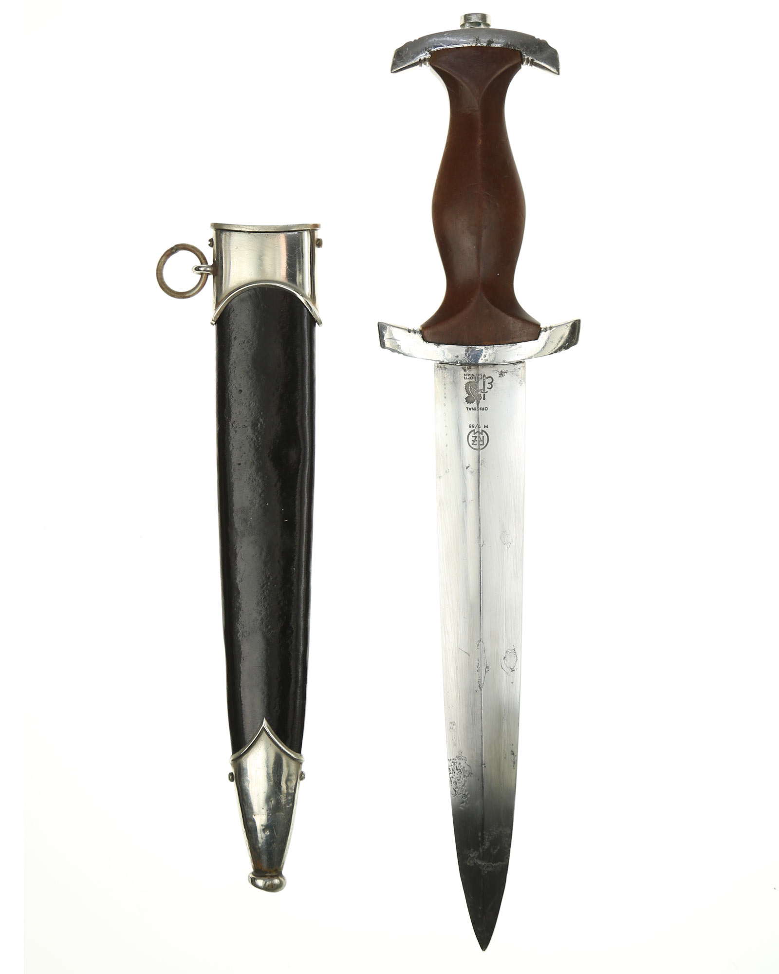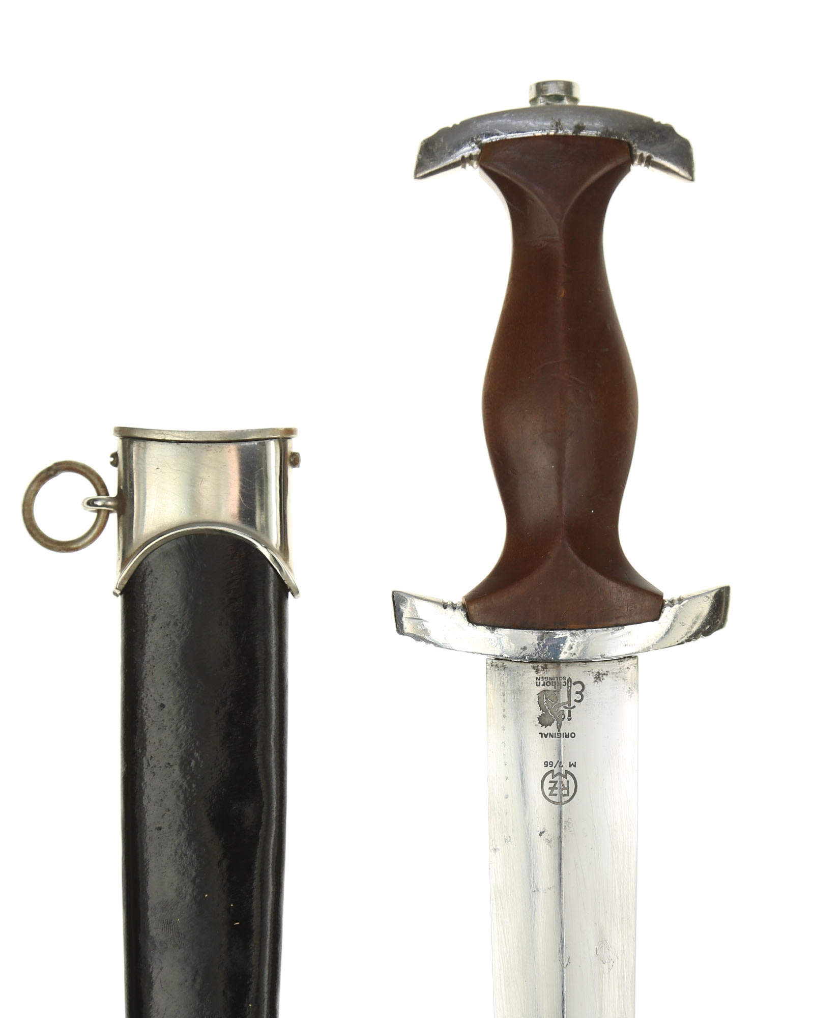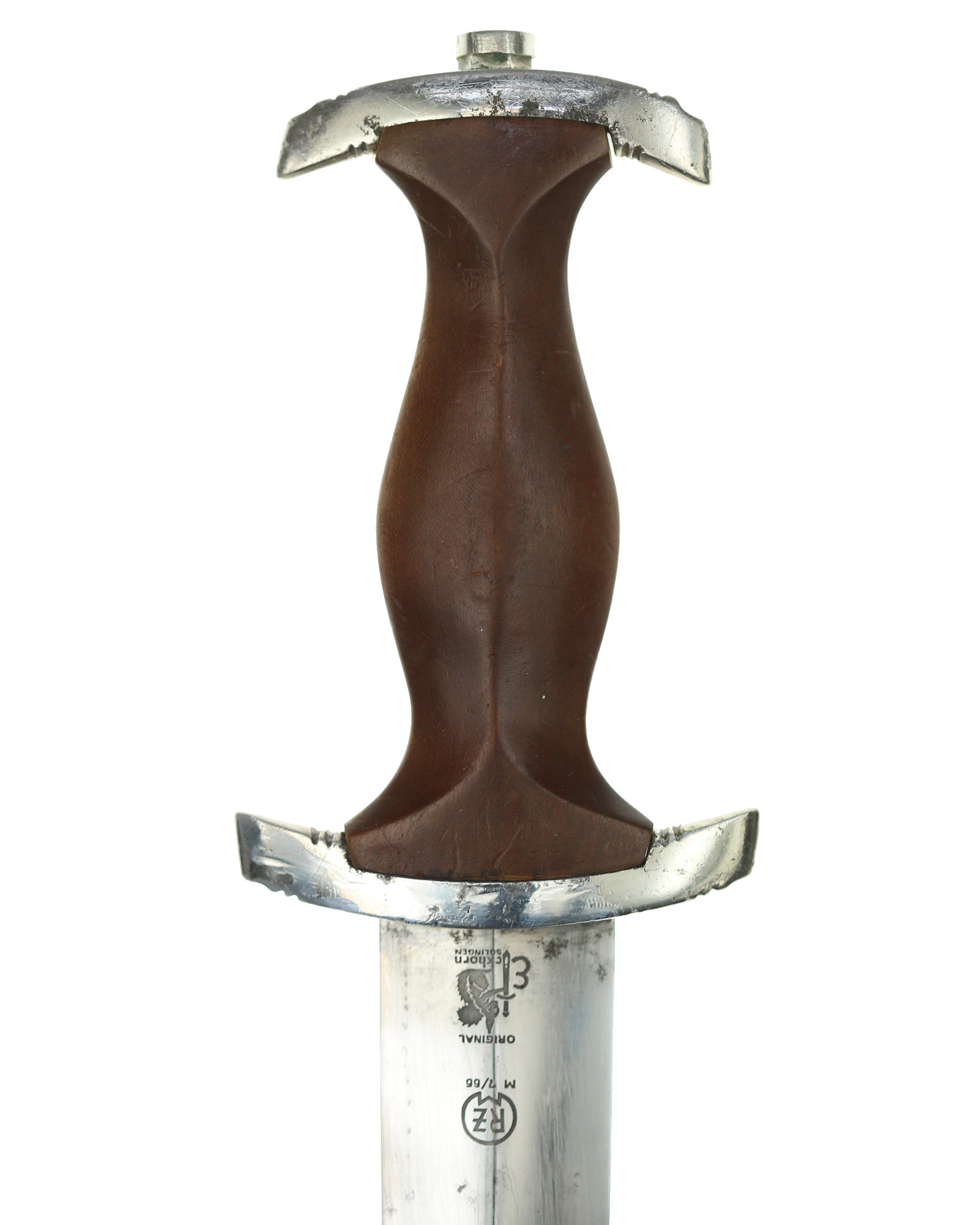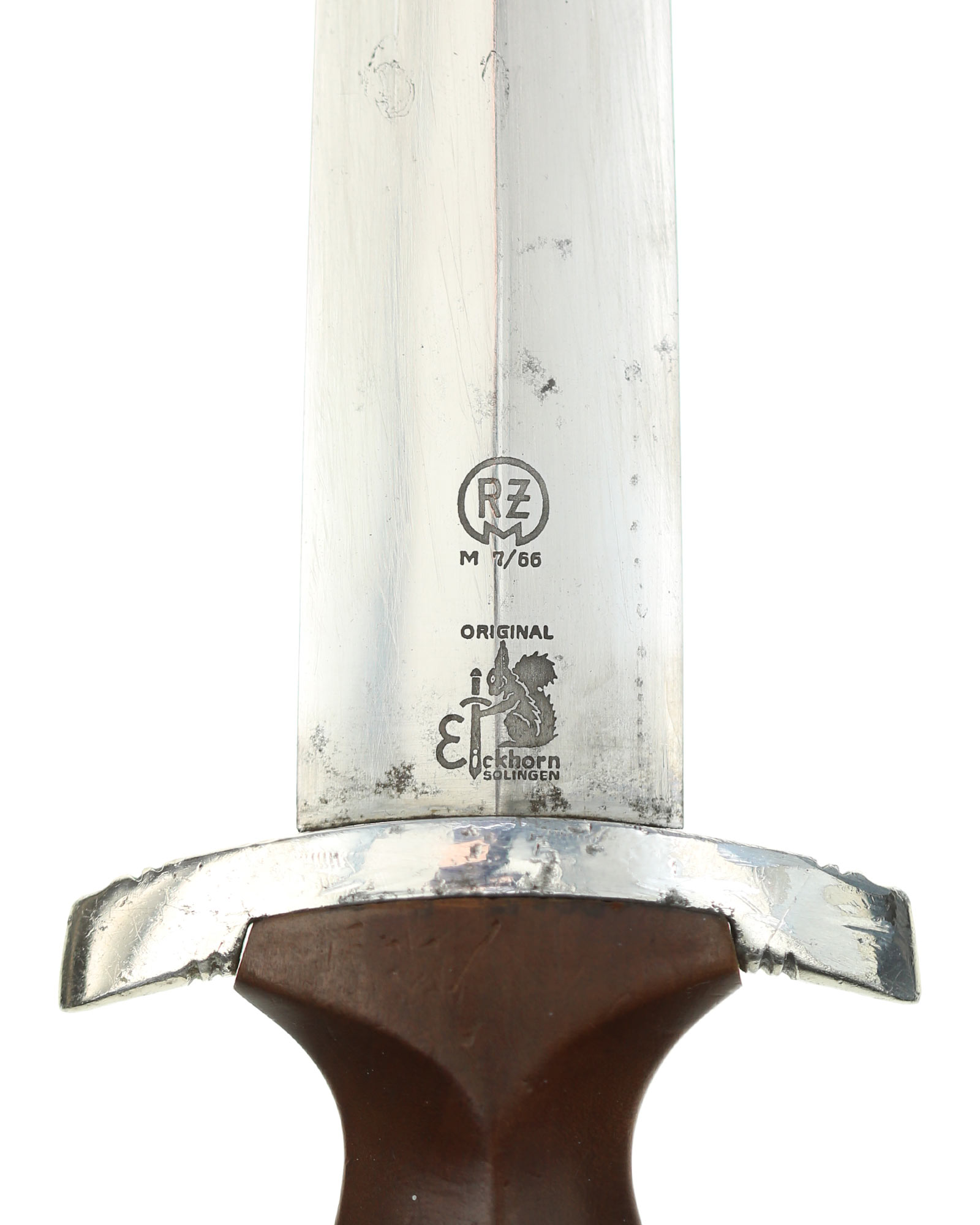 Клинок: Клинок классический кинжального типа, стальной, прямой, двулезвийный, с выраженным центральным ребром. На лицевой стороне нанесен травлением девиз SА «Alles für Deutschland» «Всё для Германии», на оборотной стороне у основания стоит совмещенное клеймо производителя Carl Eickhorn Solingen с кодом RZM M7/66.