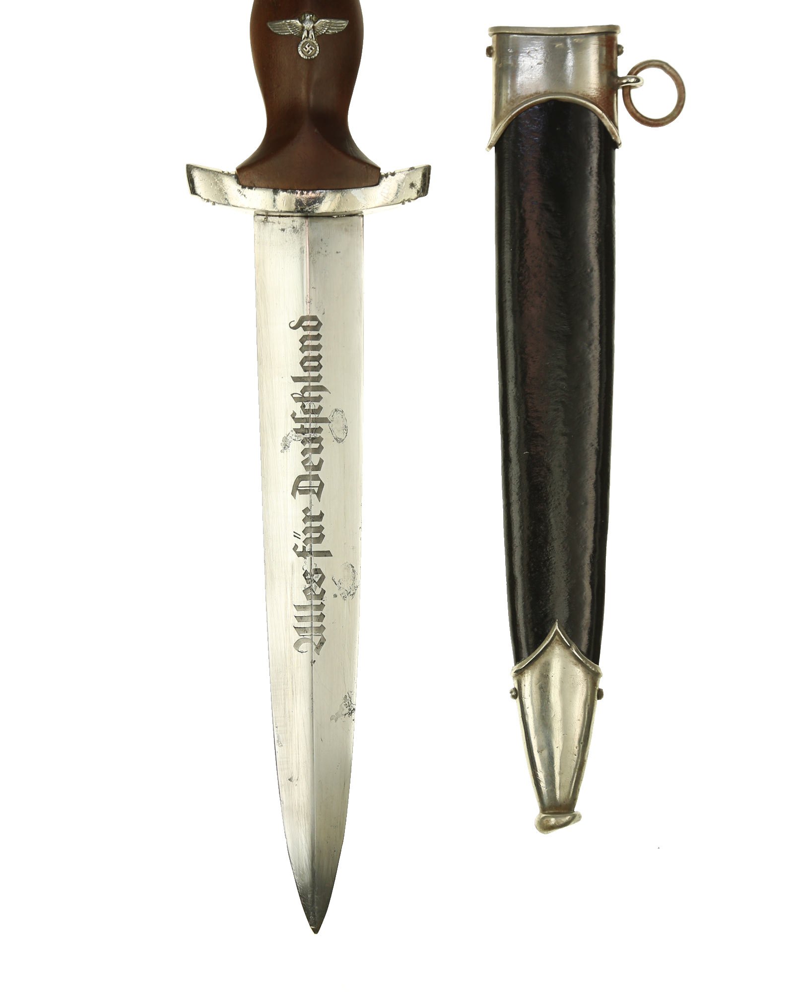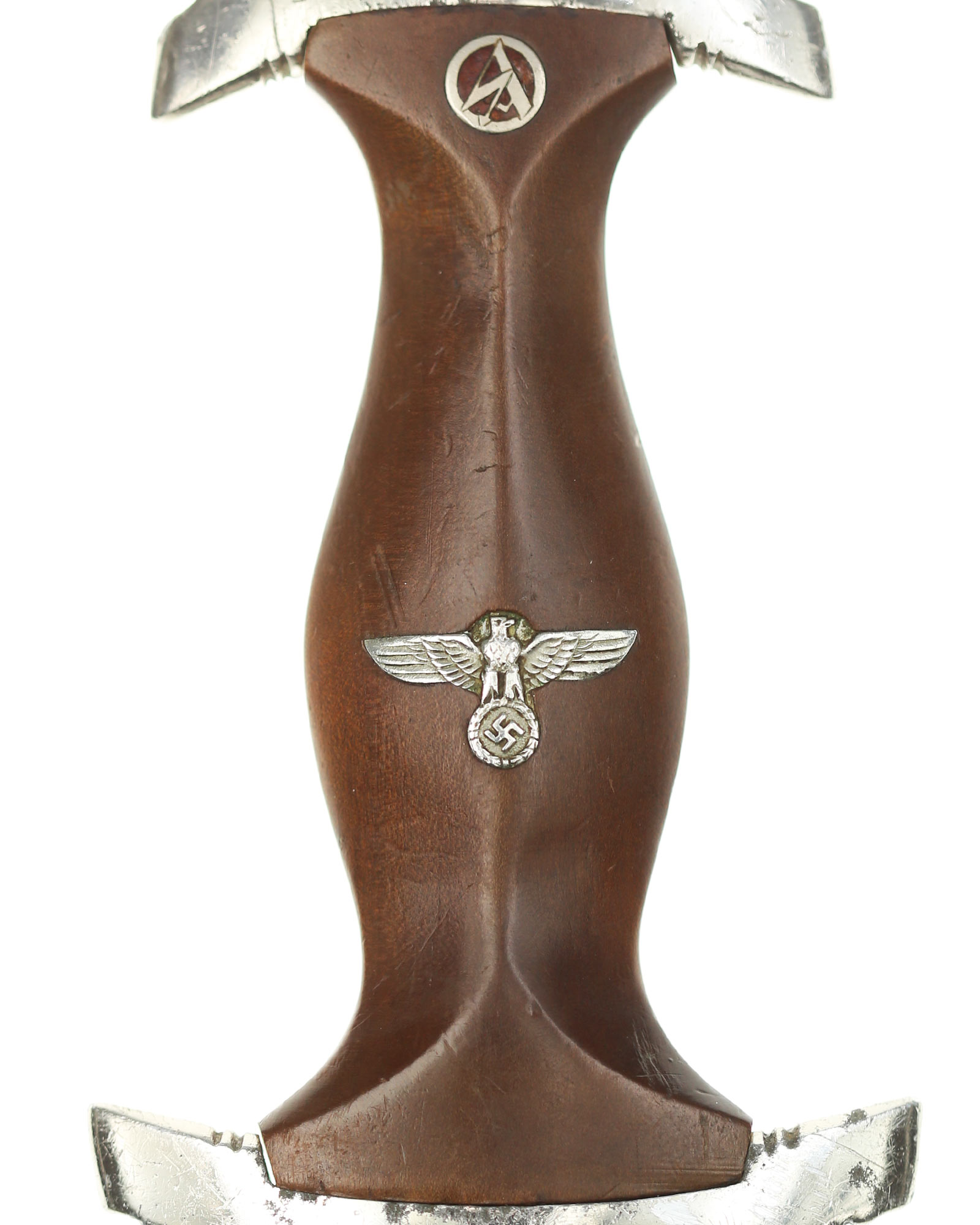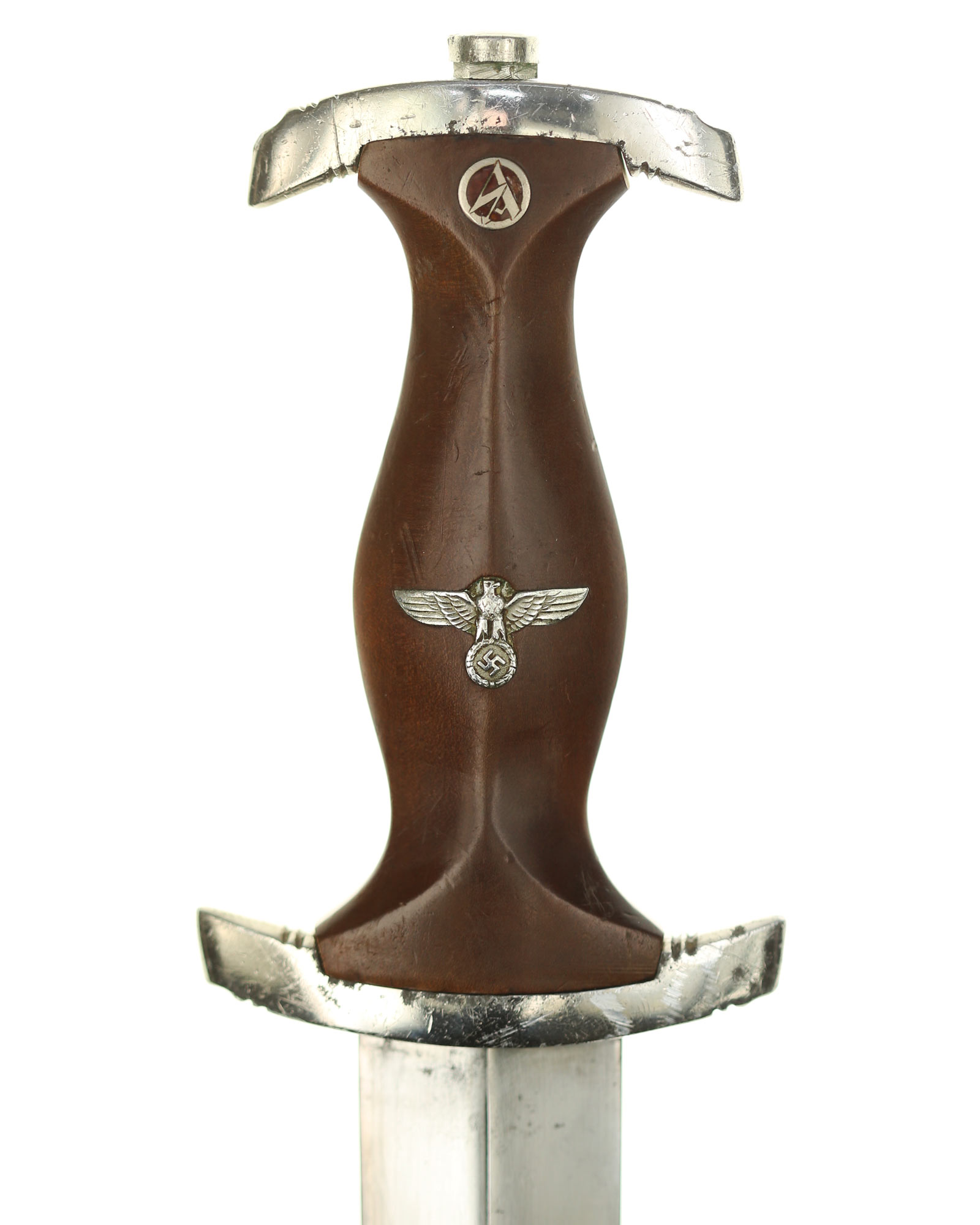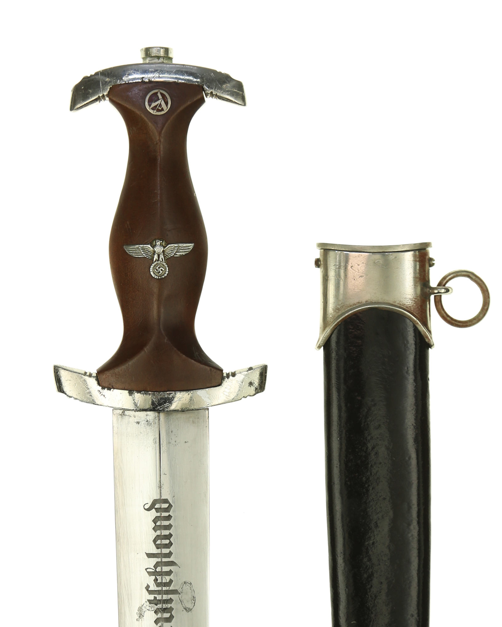 Клинок: Клинок классический кинжального типа, стальной, прямой, двулезвийный, с выраженным центральным ребром. На лицевой стороне нанесен травлением девиз SА «Alles für Deutschland» «Всё для Германии», на оборотной стороне у основания стоит совмещенное клеймо производителя Carl Eickhorn Solingen с кодом RZM M7/66.