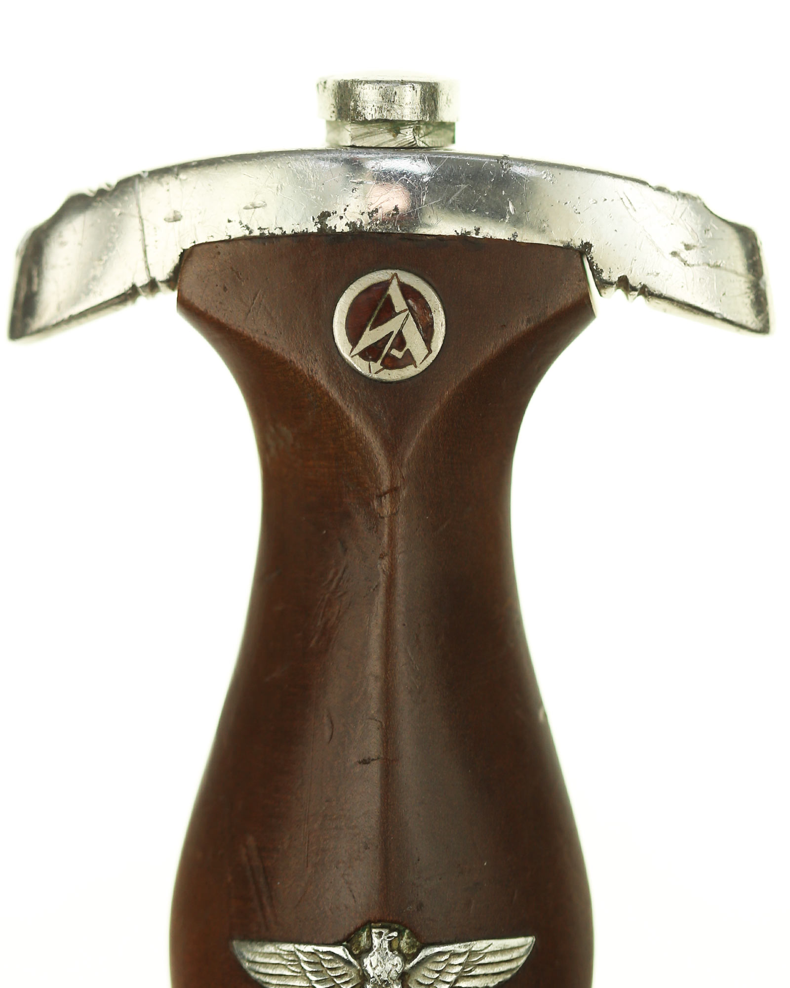 Рукоять: Рукоять из мореного в коричневый цвет дерева. Рукоять в верхней части имеет вставку в виде эмалевого глазка, в средней части – вставка в виде орла. Металлические элементы гарды изготовлены из мельхиора. Хвостовик клинка укреплен на верхней крестовине при помощи винта.