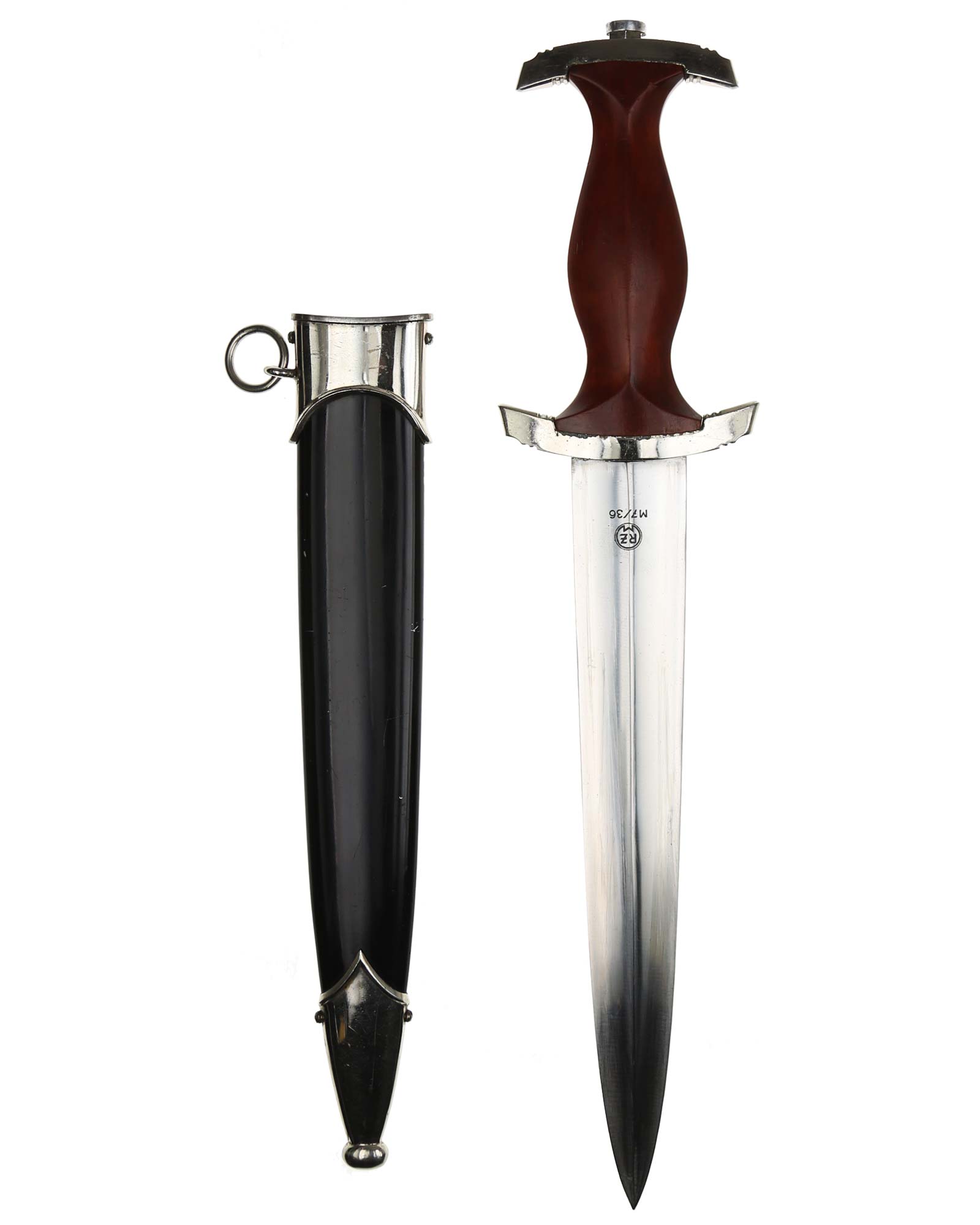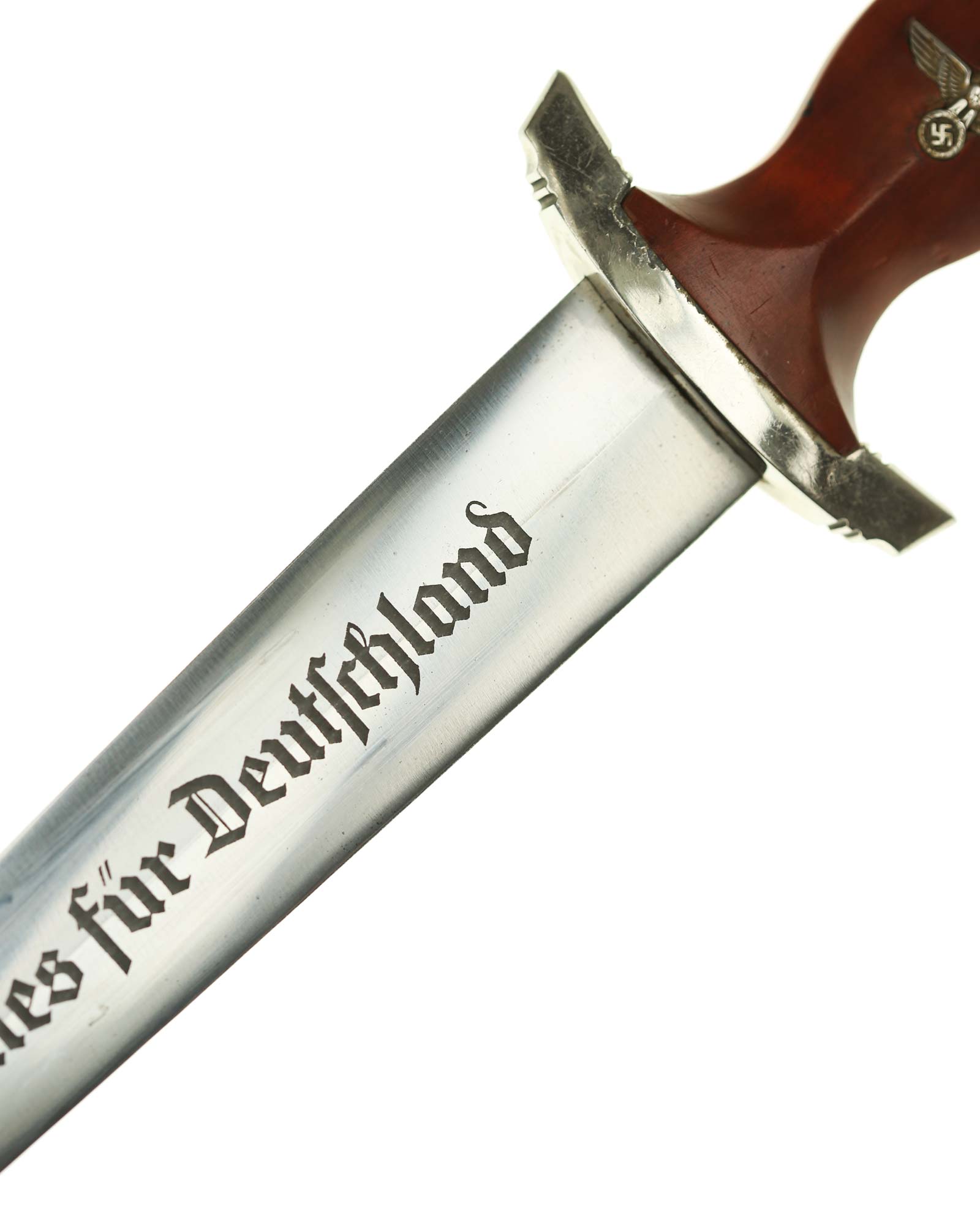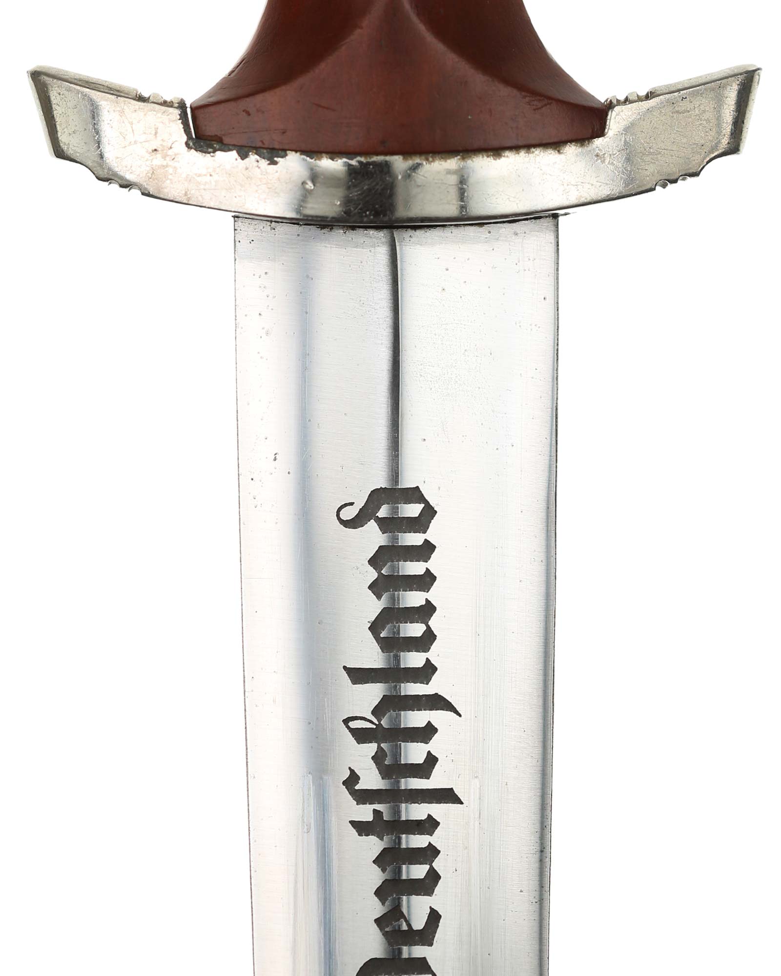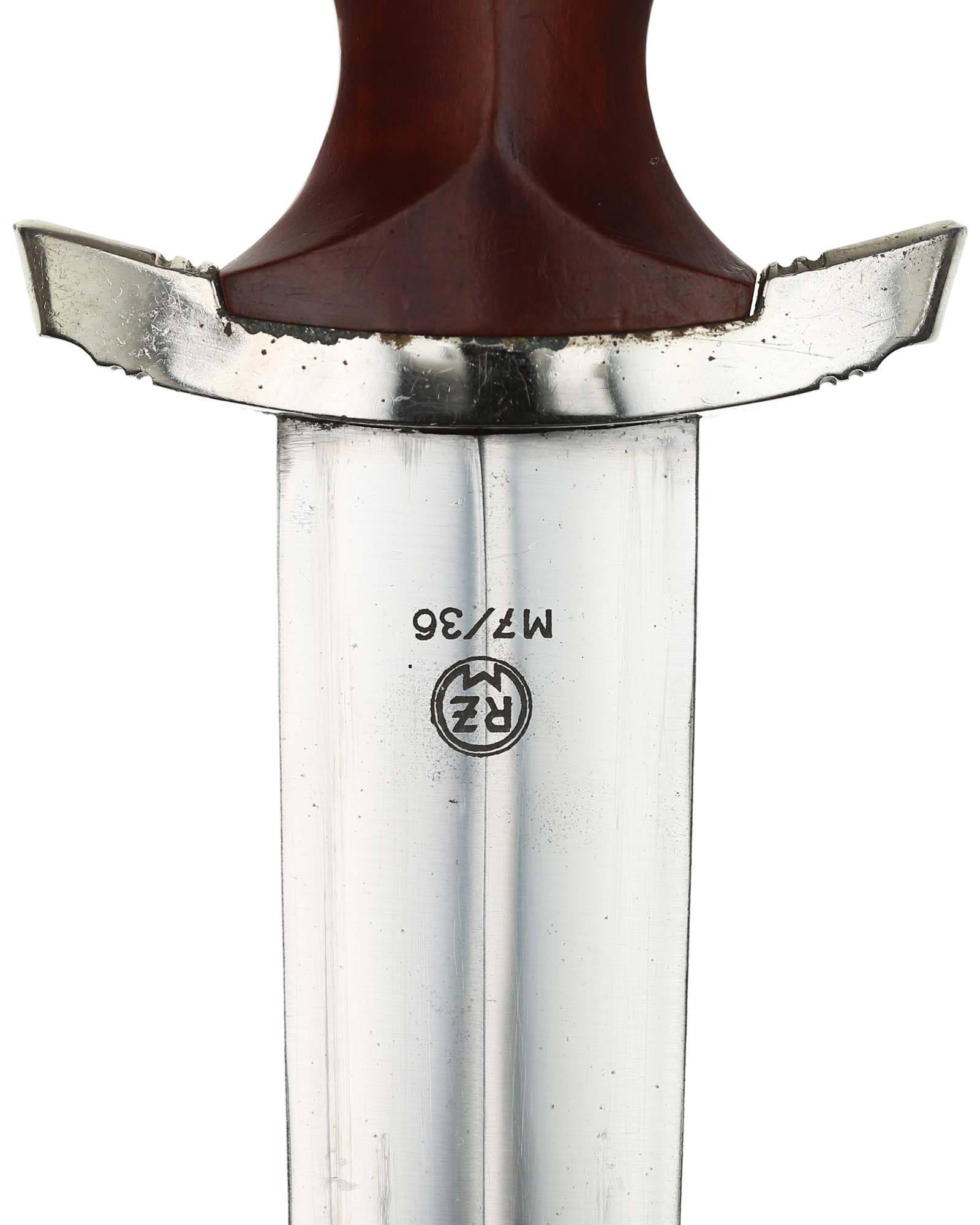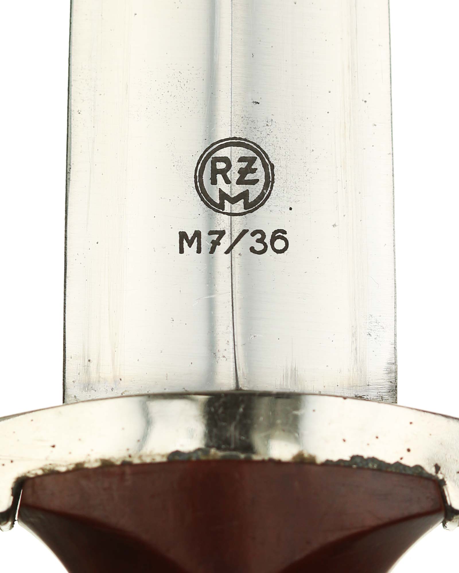 Клинок: Клинок классический кинжального типа, стальной, прямой, двулезвийный, с выраженным центральным ребром. На лицевой стороне нанесен травлением девиз SА «Alles für Deutschland» «Всё для Германии», на оборотной стороне у основания стоит совмещенное клеймо производителя Е.Ф. Хёрстер Золинген с кодом RZM M7/36 (E.&F. Hörster Solingen).