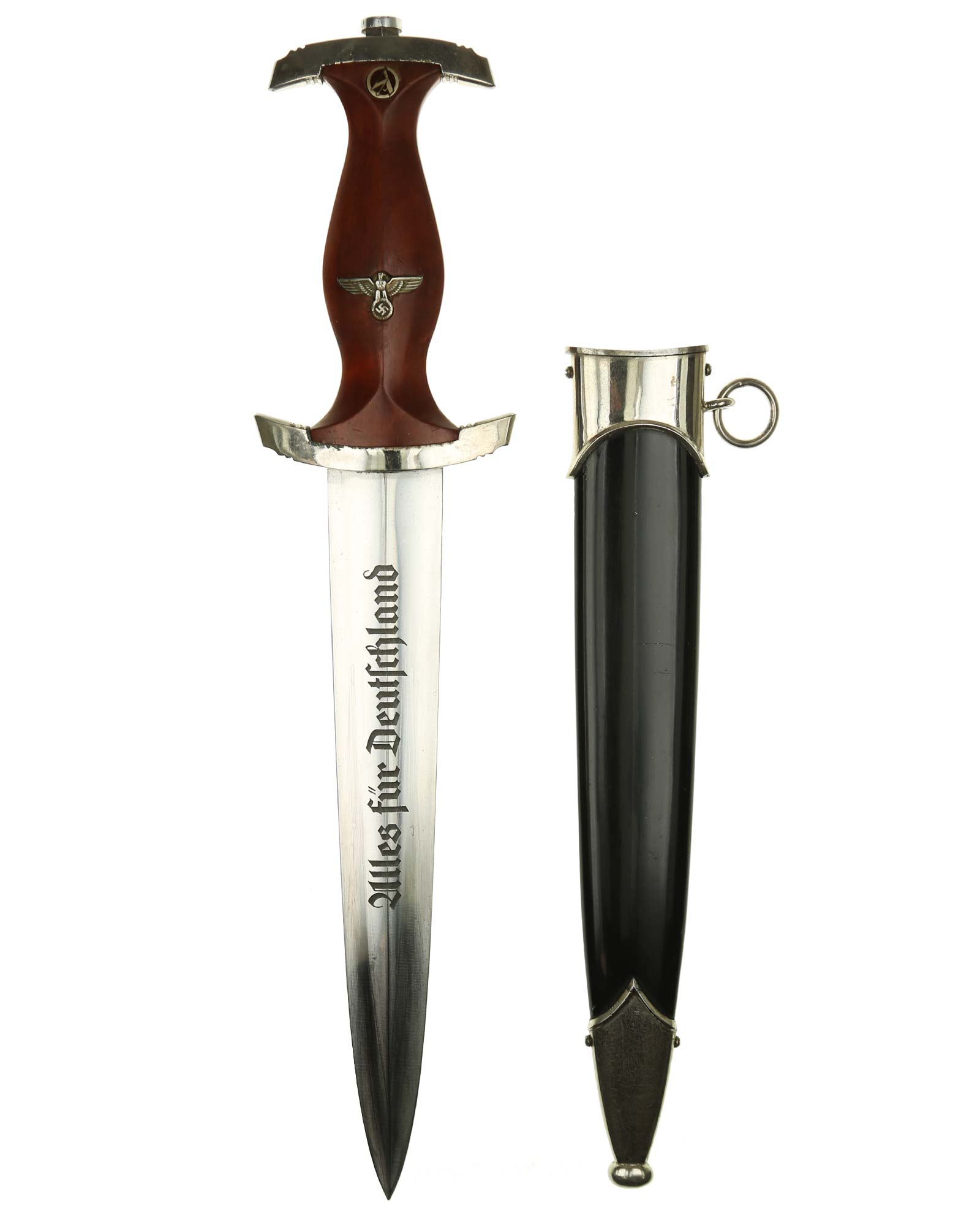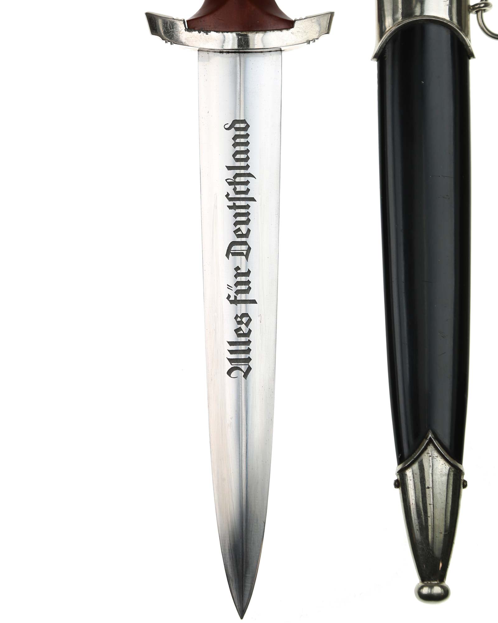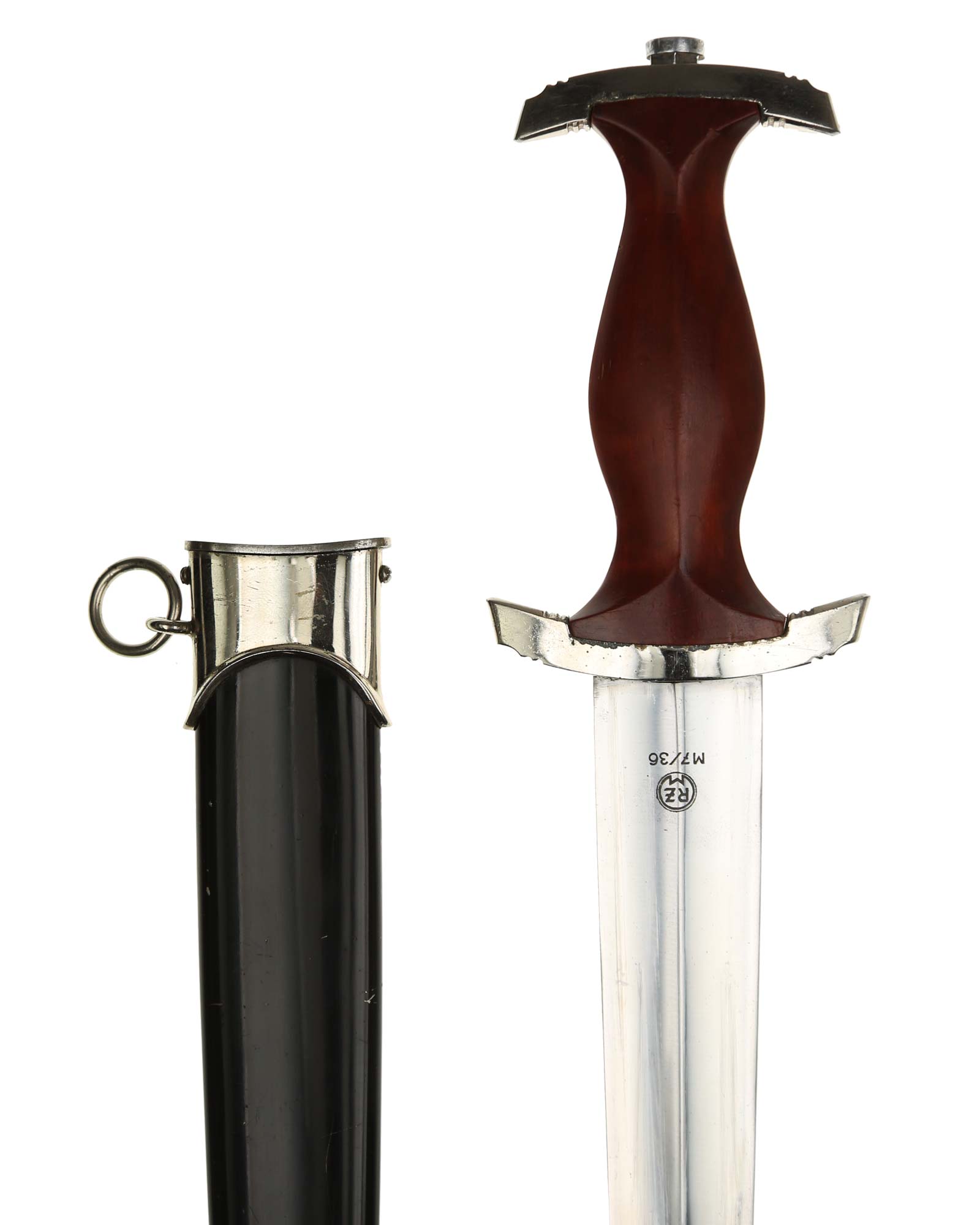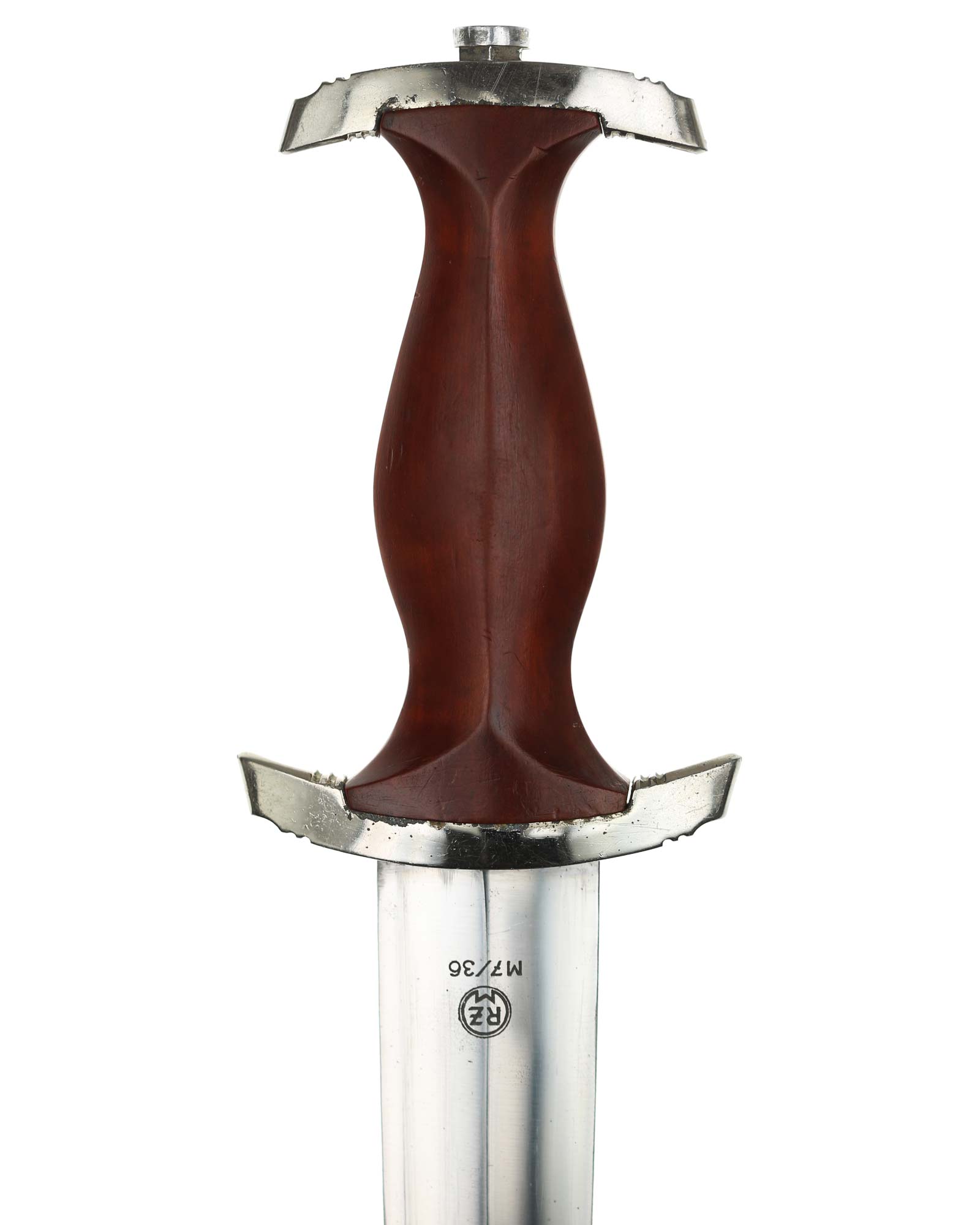 Клинок: Клинок классический кинжального типа, стальной, прямой, двулезвийный, с выраженным центральным ребром. На лицевой стороне нанесен травлением девиз SА «Alles für Deutschland» «Всё для Германии», на оборотной стороне у основания стоит совмещенное клеймо производителя Е.Ф. Хёрстер Золинген с кодом RZM M7/36 (E.&F. Hörster Solingen).
