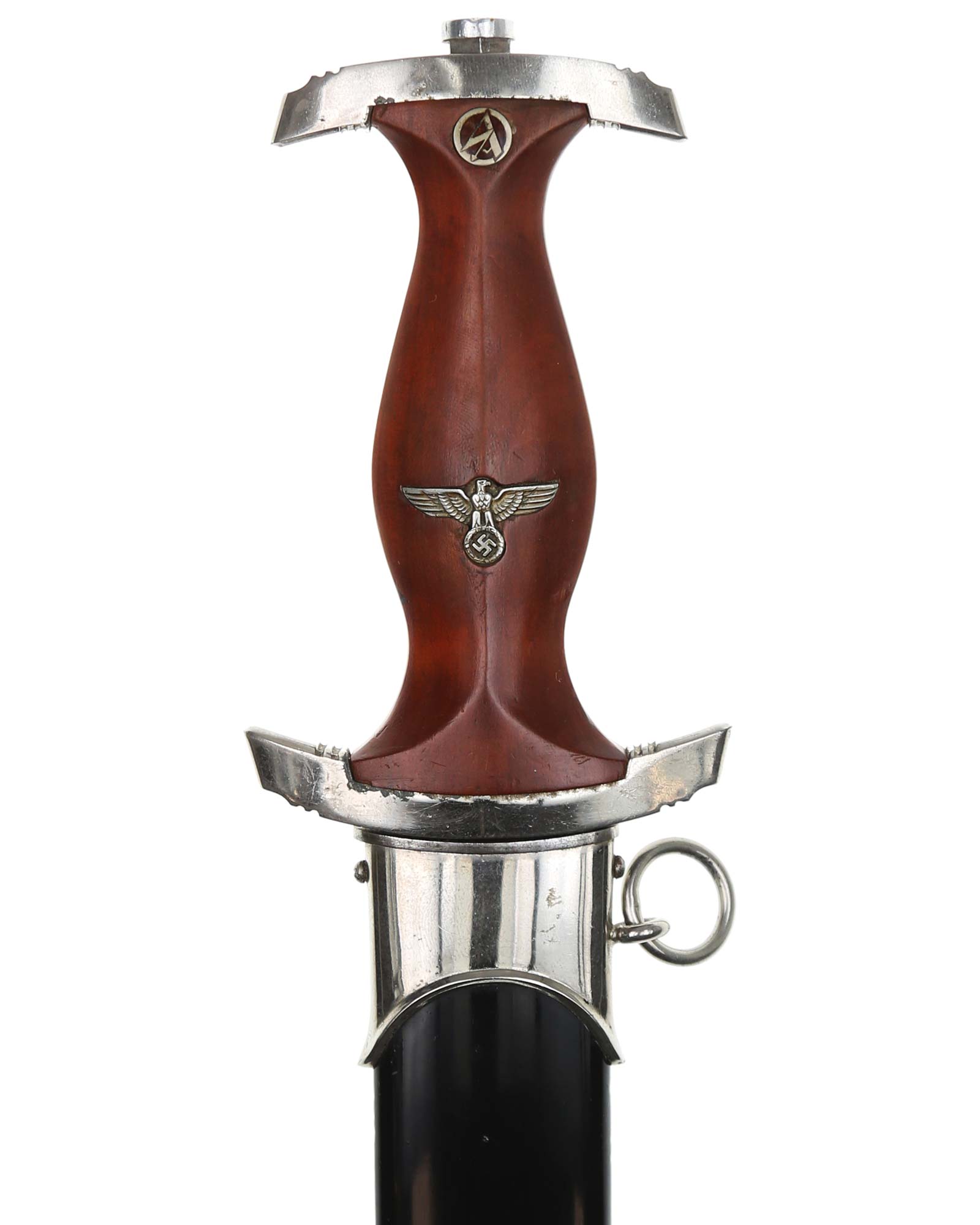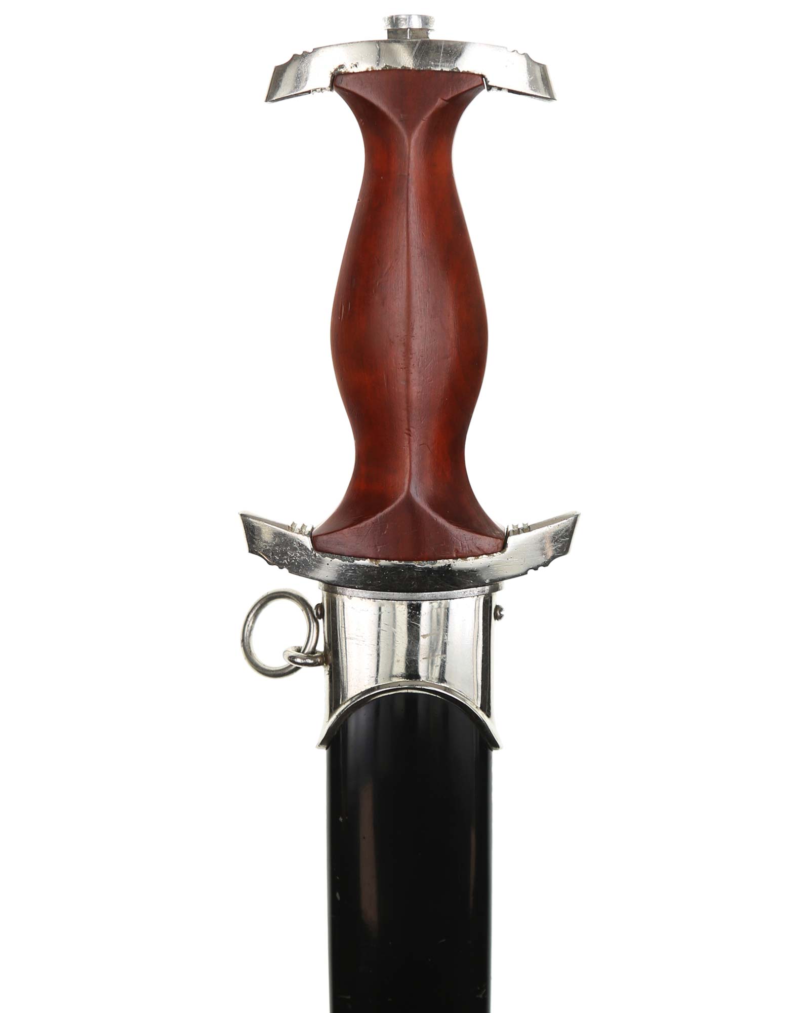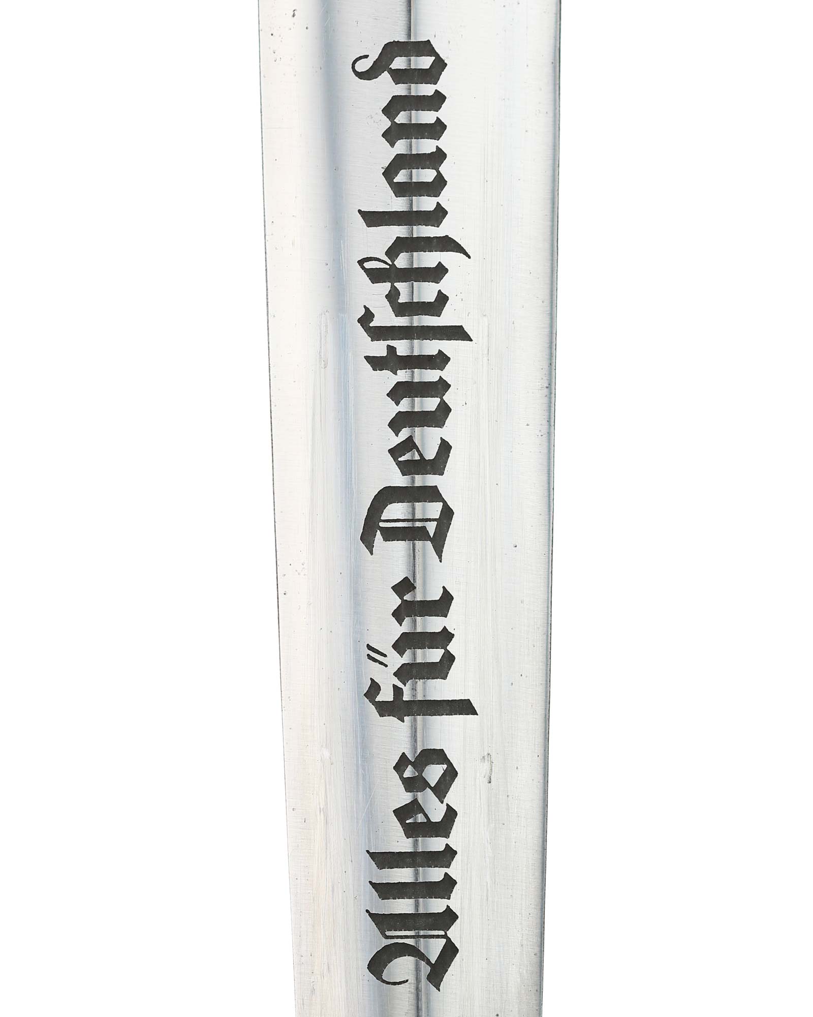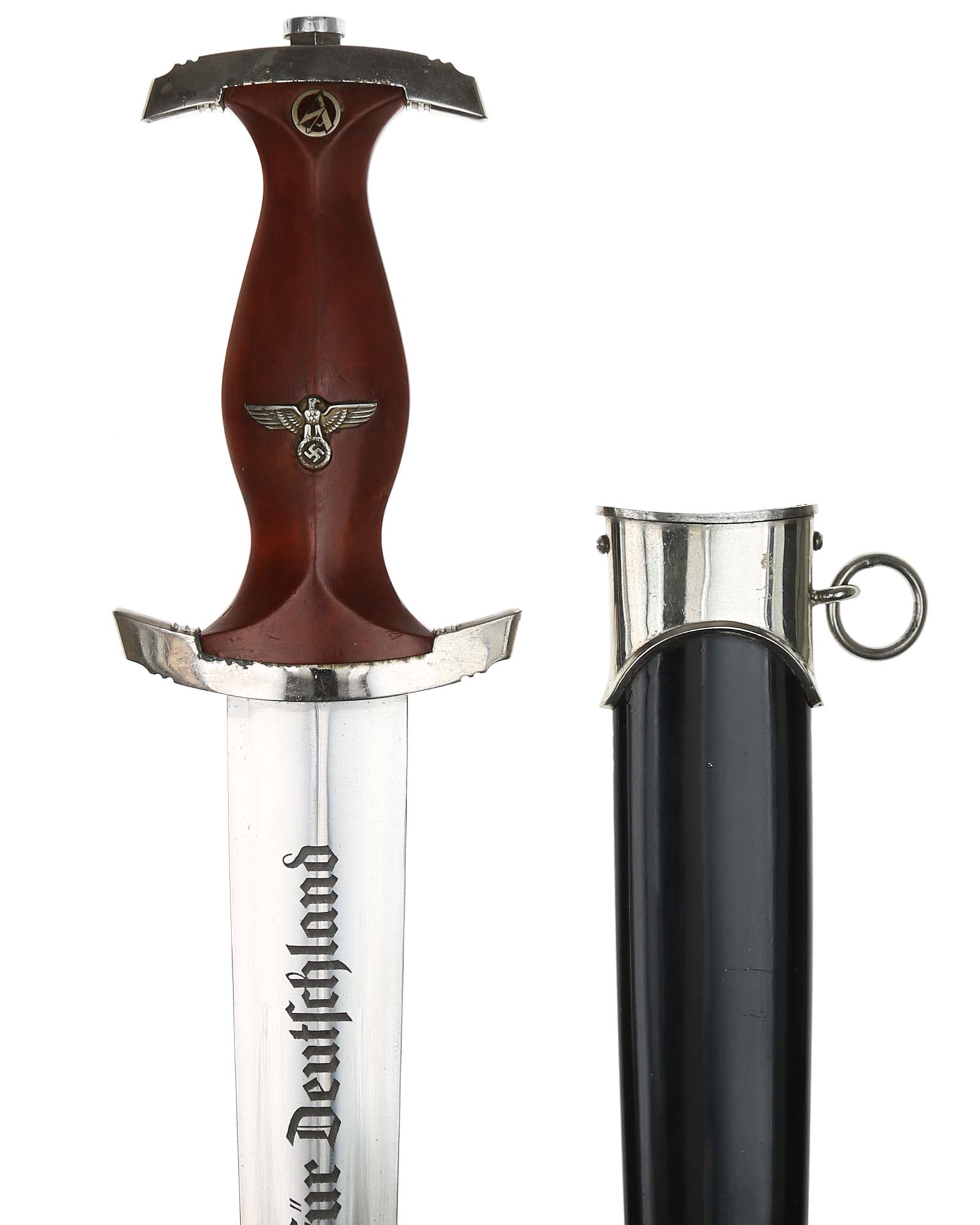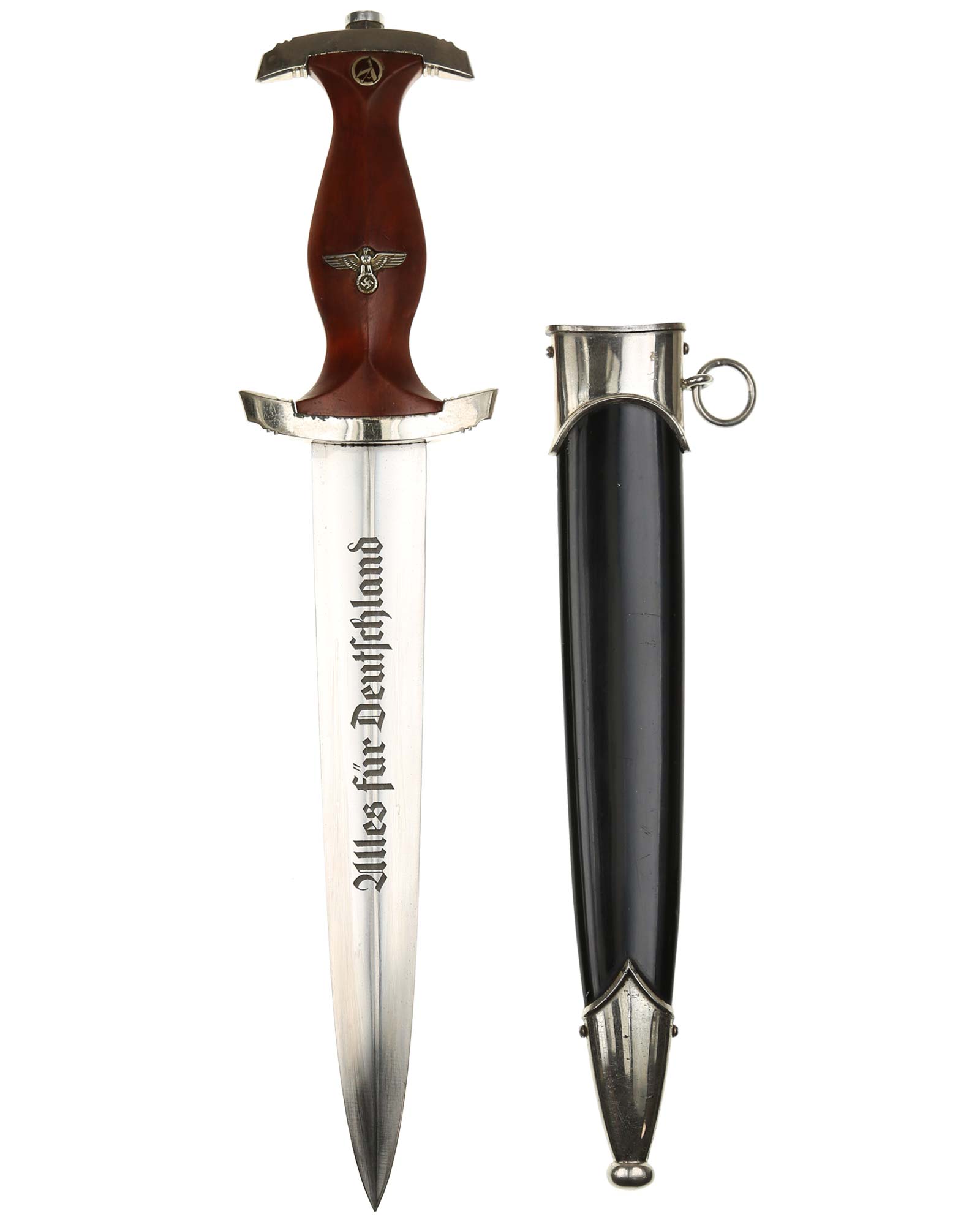 Клинок: Клинок классический кинжального типа, стальной, прямой, двулезвийный, с выраженным центральным ребром. На лицевой стороне нанесен травлением девиз SА «Alles für Deutschland» «Всё для Германии», на оборотной стороне у основания стоит совмещенное клеймо производителя Е.Ф. Хёрстер Золинген с кодом RZM M7/36 (E.&F. Hörster Solingen).