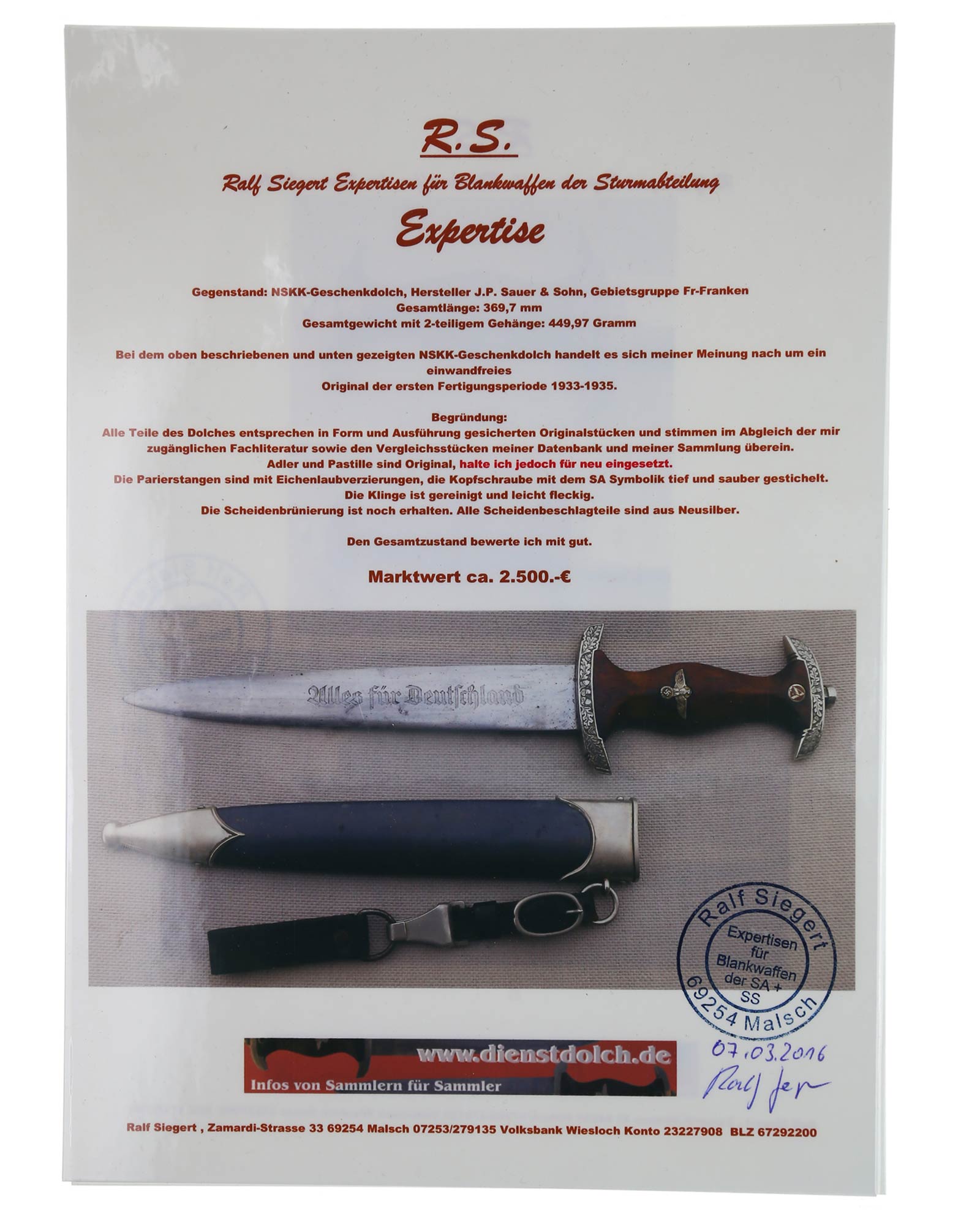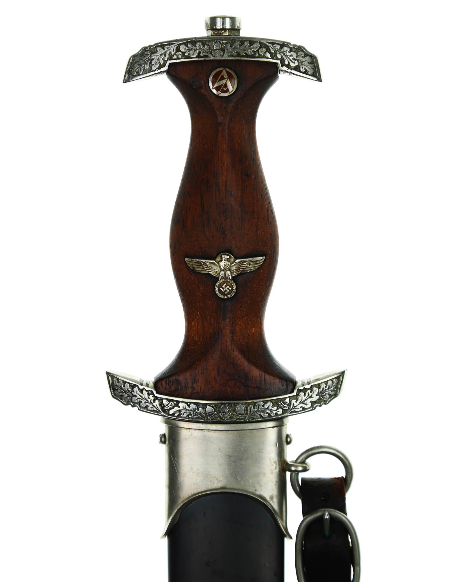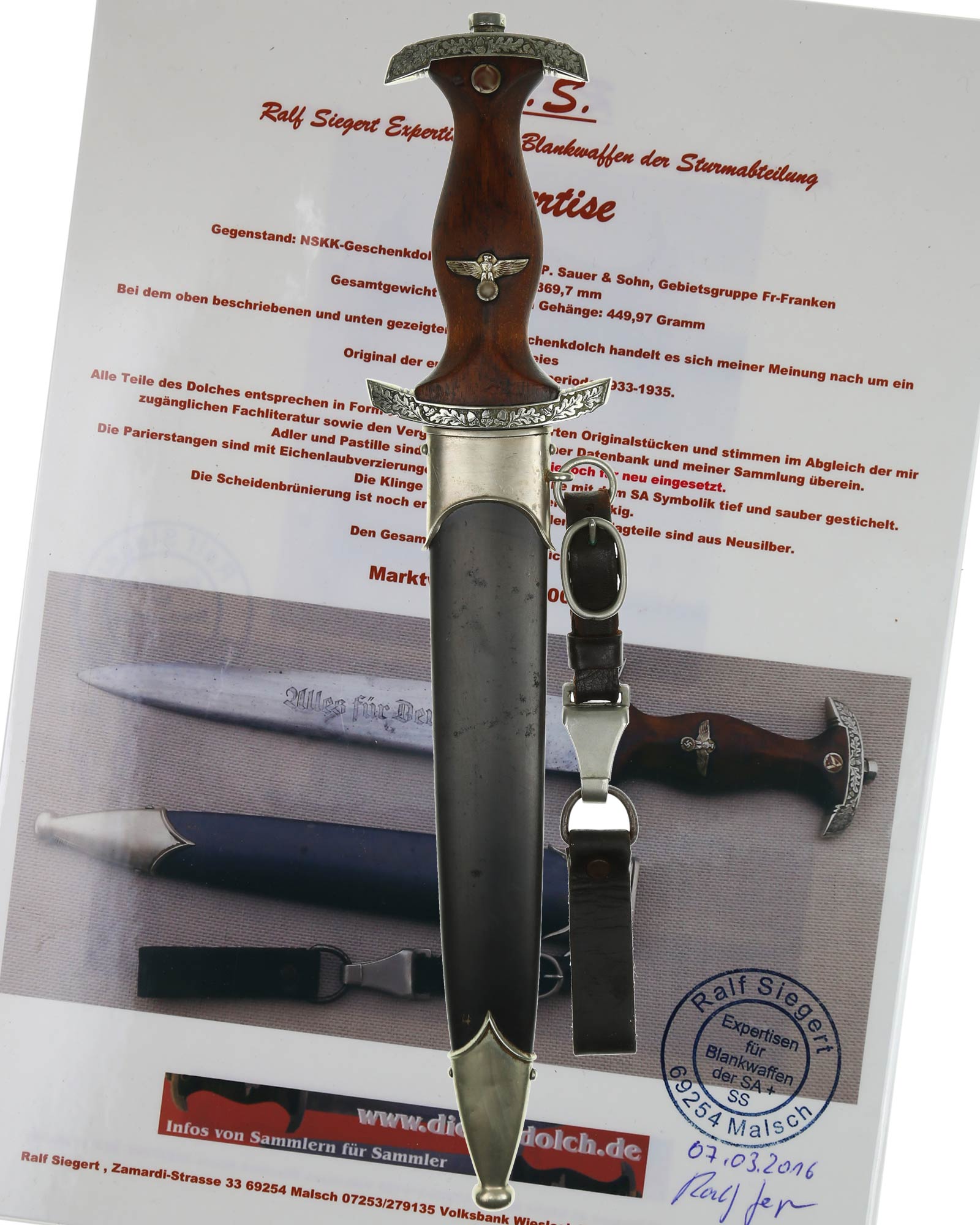 Наградной кинжал штурмовых отрядов НСКК [Национал-социалистический механизированный корпус] образца 1933 года. Ранний период производства, 1933-1935 годы. Производитель фирма J. P. Sauer & Sohn Suhl (Зауэр & сын Зуль). Длина в ножнах 37,0 см.