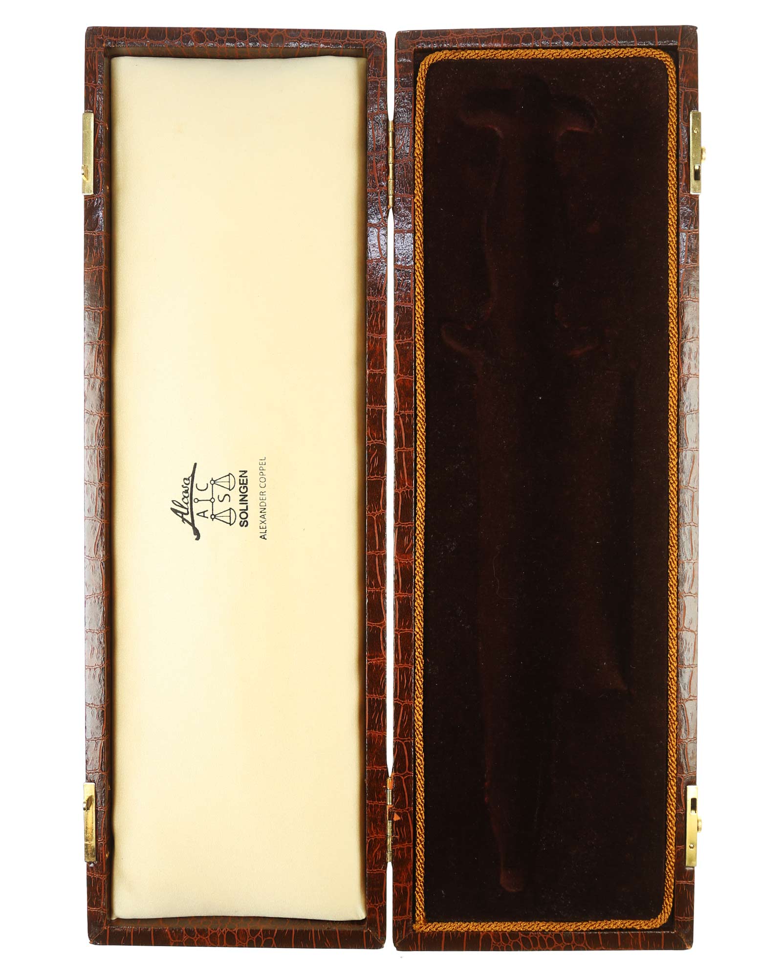 Презентационная коробка для кинжала СС и СA - Alcoso Solingen. Общий вес 863 г. Размеры: 436 x 144 x 48 мм. Хорошее состояние.