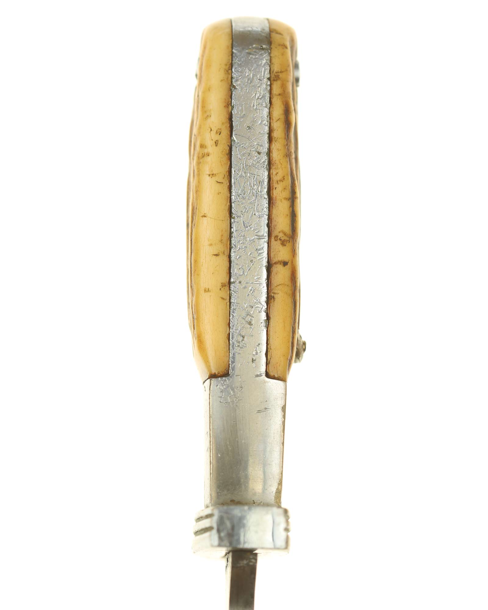 Клинок: Клинок стальной, плоский, однолезвийный, никелированный. Вдоль обуха на половину длины клинка идет узкий дол. На лицевой стороне имеется надпись готическим шрифтом — «Arbeit adelt» — «Труд облагораживает». На пяте клинка имеется клеймо известного производителя - Carl Eickhorn Solingen.