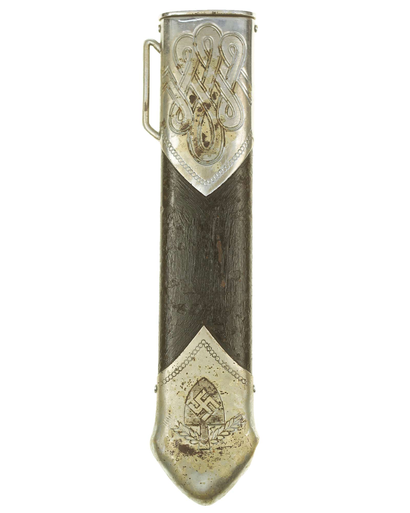 Ножны: Ножны прямые, металлические, крашеные в черный цвет. Прибор ножен состоит из длинного и широкого устья и наконечника в виде лопаты с заостренным концом. Верхняя часть ножен и наконечник с гладким фоном, украшены геометрическим орнаментом и изображением эмблемы Трудового фронта — свастика на фоне лопаты и колосьев. К устью припаяна длинная прямоугольная скоба для ремня портупеи.