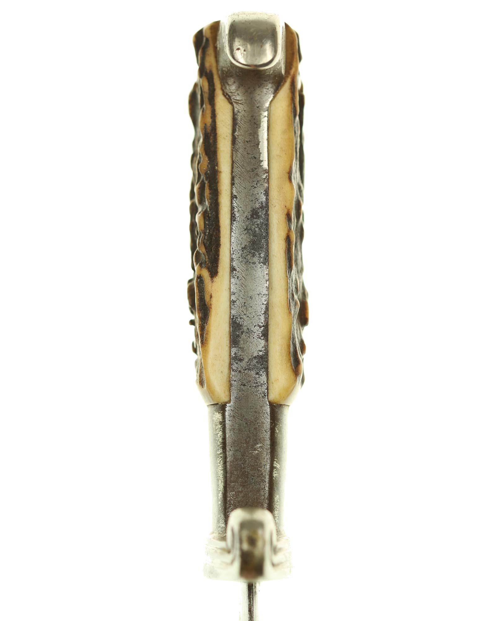 Клинок: Клинок стальной, плоский, однолезвийный, никелированный. Вдоль обуха на половину длины клинка идет узкий дол. На лицевой стороне имеется надпись готическим шрифтом — «Arbeit adelt» — «Труд облагораживает». На пяте клинка имеется клеймо известного производителя - Carl Jul. Krebs Solingen, клеймо немецкой фирмы «Карл Юлиус Кребс» Золинген.