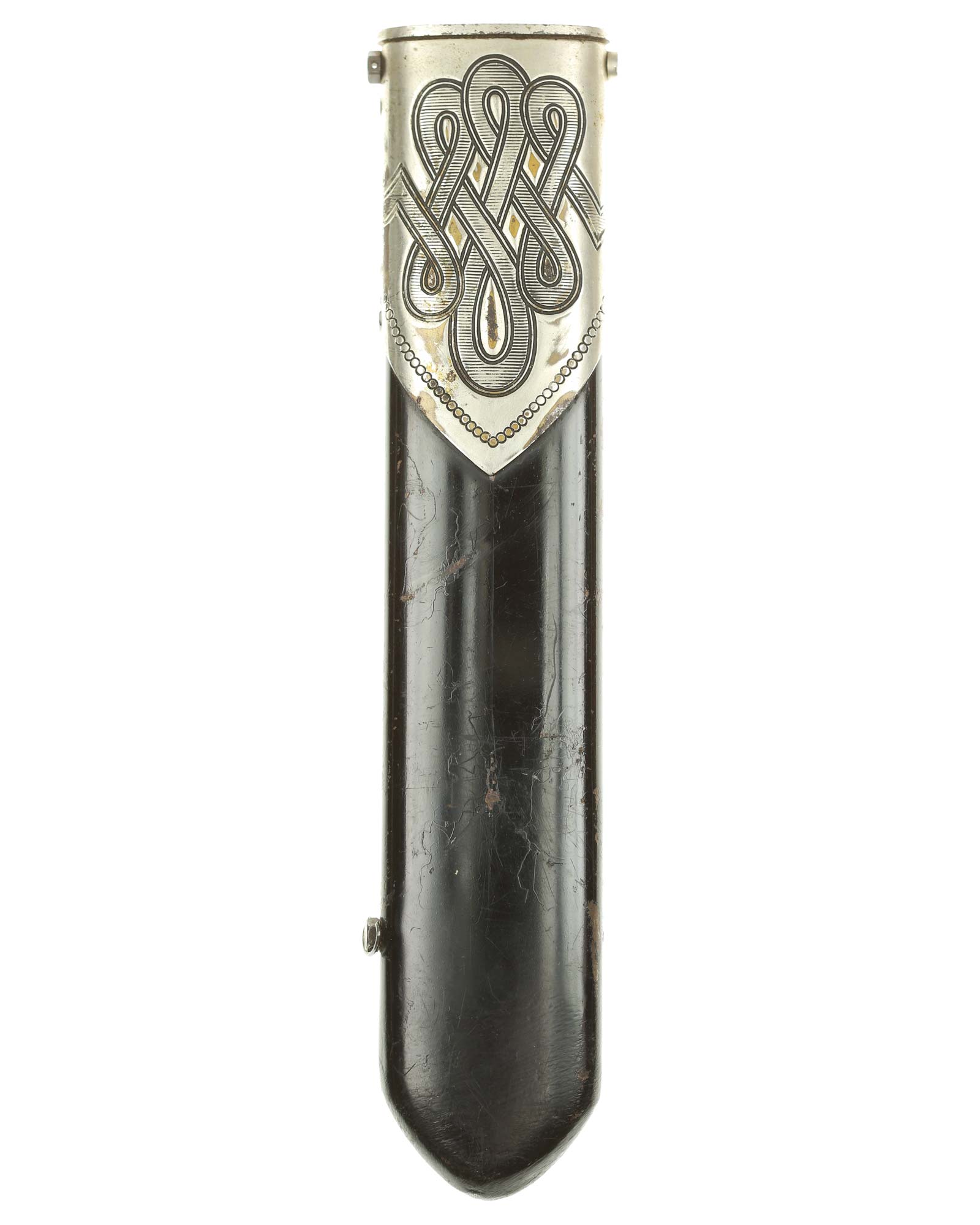 Ножны: Ножны прямые, металлические, крашеные в черный цвет. Верхняя часть ножен с гладким фоном, украшены геометрическим орнаментом.