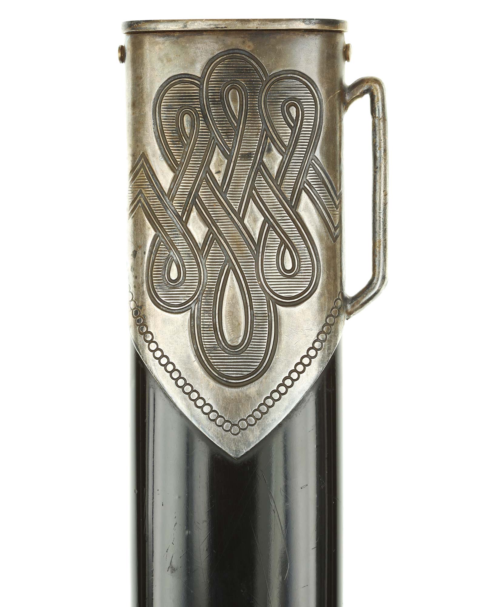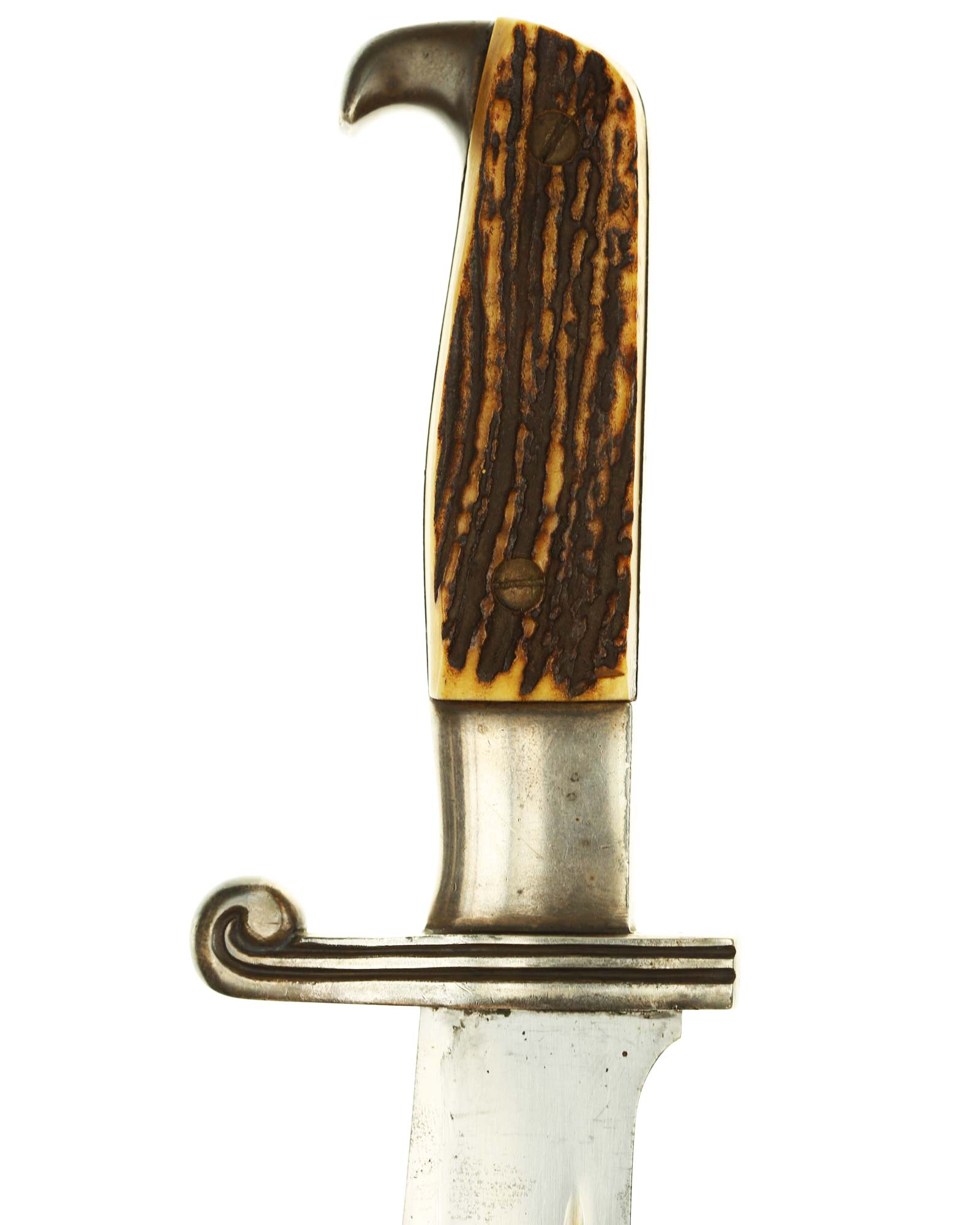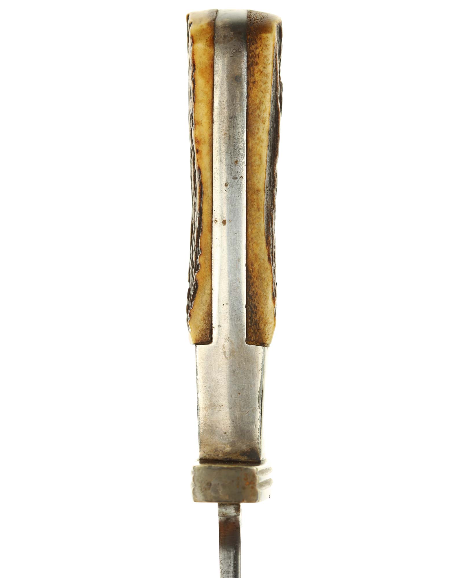 Рукоять: Рукоять металлическая, с двумя роговыми накладками, крепится на хвостовике проходящими через накладки двумя винтами с потайными гайками. Головка рукояти литая, металлическая, в виде клюва орла, клювом повернута в сторону лезвия. Крестовина прямая, плоская, с двумя продольными бороздками, несимметричная, с одним скругленным, загнутым кверху со стороны лезвия окончанием. Все детали эфеса отлиты из белого металлы как единое целое и отполированы.