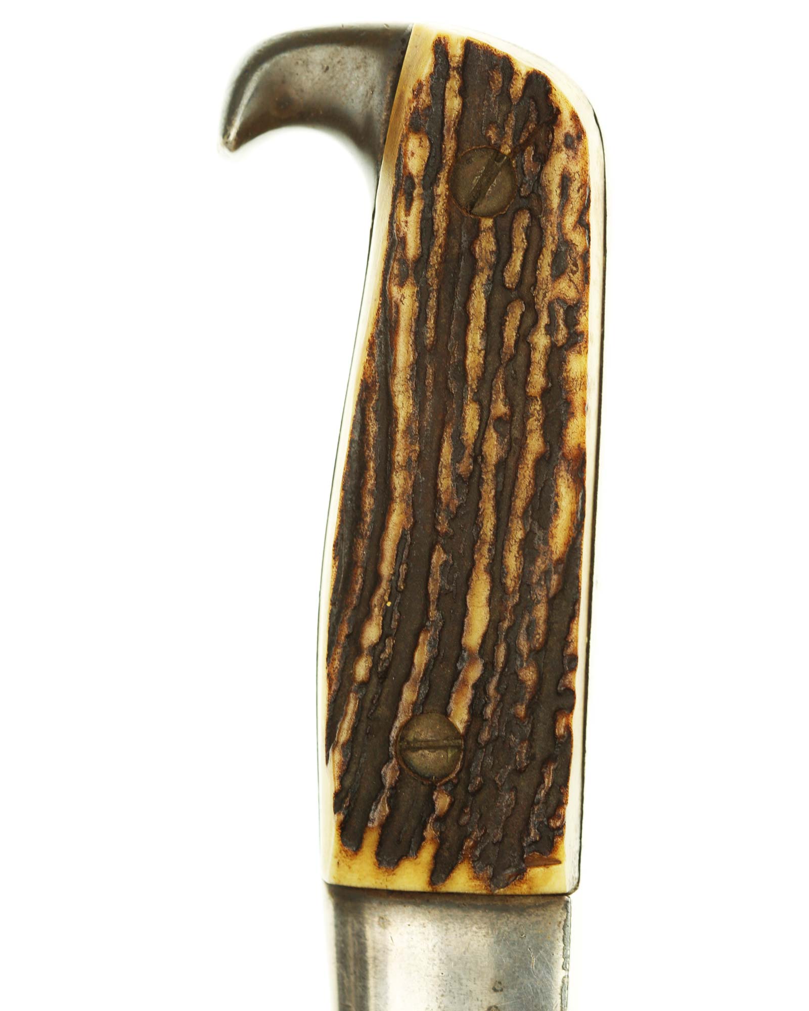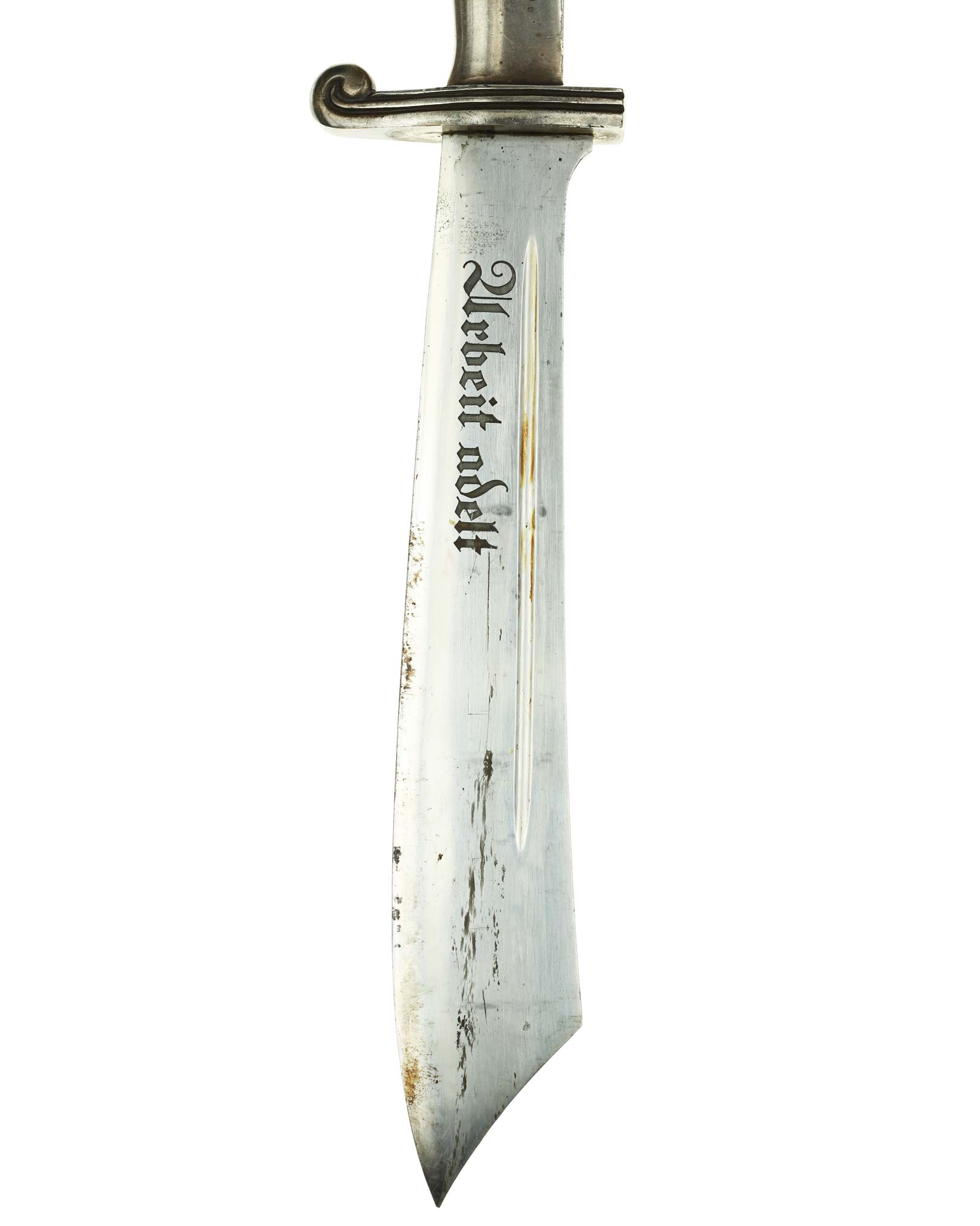 Клинок: Клинок стальной, плоский, однолезвийный, чуть искривленный, значительно расширяющийся к нижней части, полированный. Вдоль обуха идет узкий дол. На лицевой стороне имеется надпись готическим шрифтом — «Arbeit adelt» — «Труд облагораживает». На пяте клинка имеется клеймо известного производителя - Carl Eickhorn Solingen, клеймо немецкой фирмы «Карл Айкхорн» Золинген.