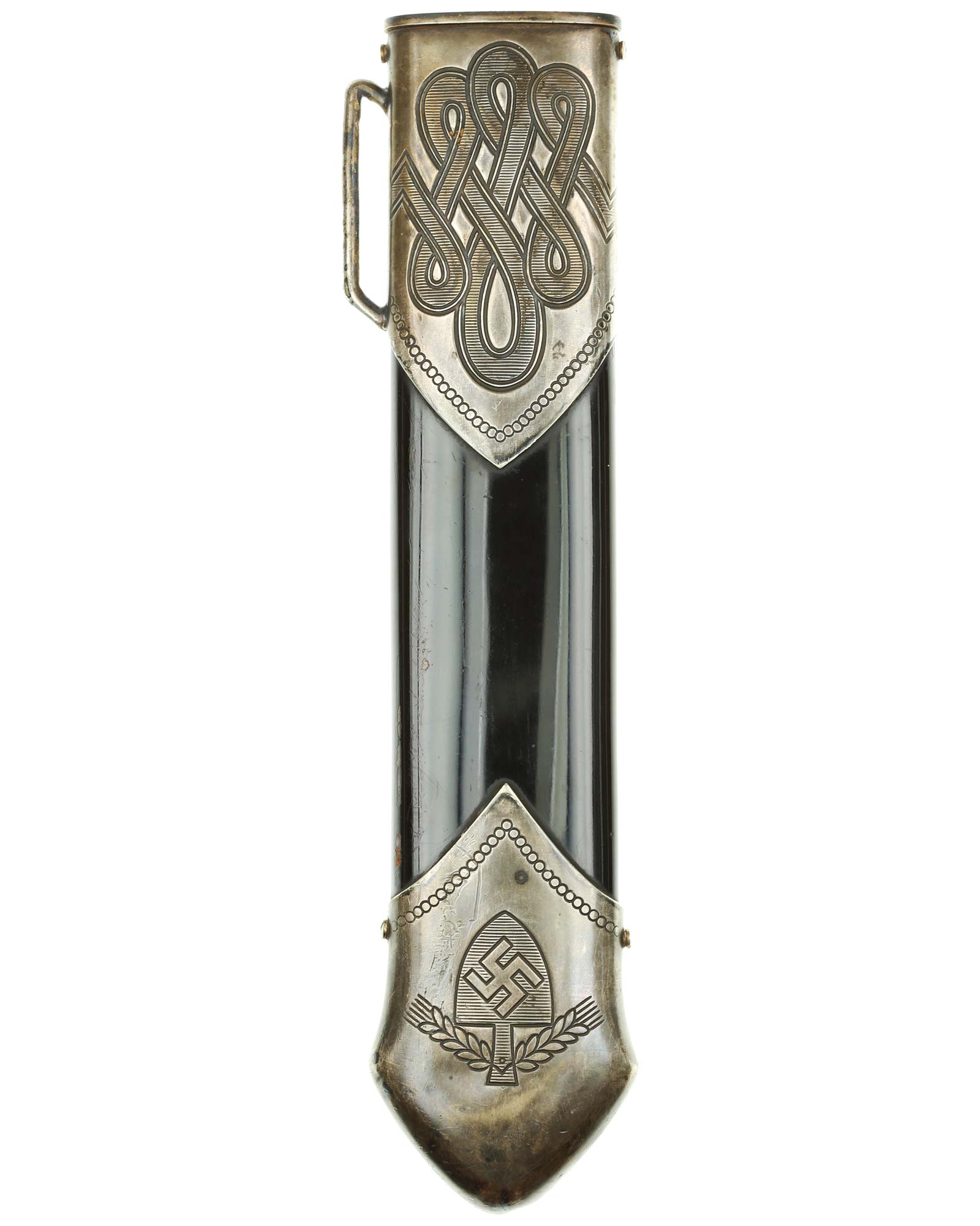 Ножны: Ножны прямые, металлические, крашеные в черный цвет. Прибор ножен состоит из длинного и широкого устья и наконечника в виде лопаты с заостренным концом. Верхняя часть ножен и наконечник с гладким фоном, украшены геометрическим орнаментом и изображением эмблемы Трудового фронта. К устью припаяна длинная прямоугольная скоба для ремня портупеи.