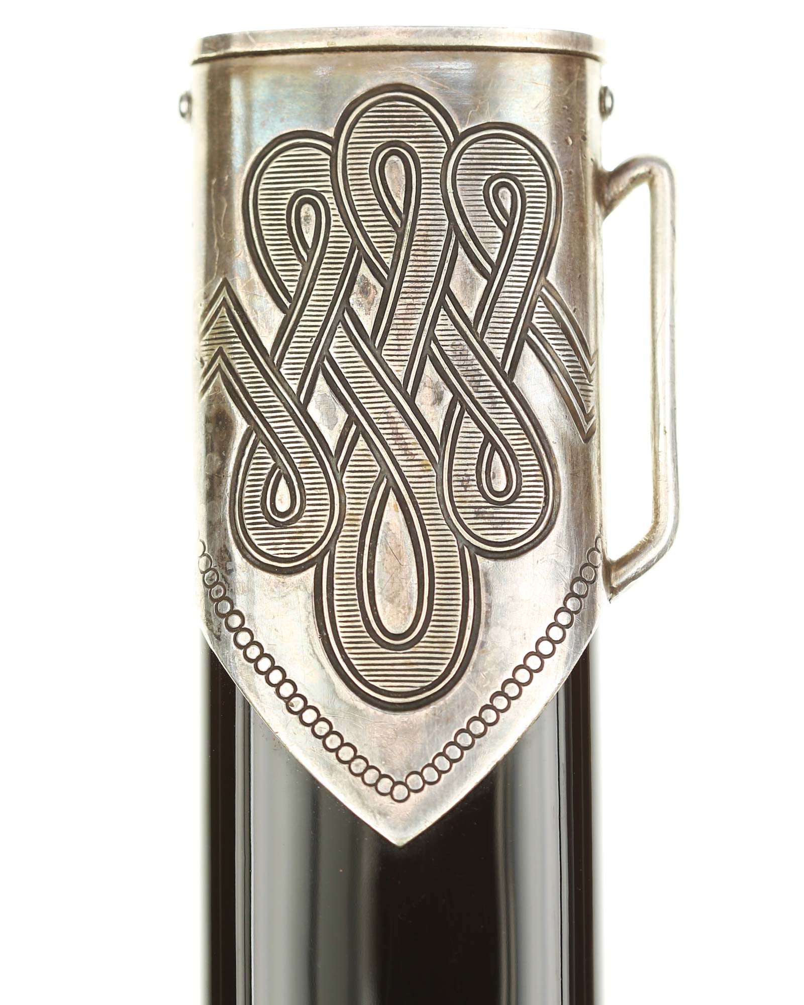 Рукоять: Рукоять металлическая, с двумя роговыми накладками, крепится на хвостовике проходящими через накладки двумя винтами с потайными гайками. Головка рукояти литая, металлическая, в виде клюва орла, клювом повернута в сторону лезвия. Крестовина прямая, плоская, с двумя продольными бороздками, несимметричная, с одним скругленным, загнутым кверху со стороны лезвия окончанием. Все детали эфеса отлиты из белого металлы как единое целое и отполированы.