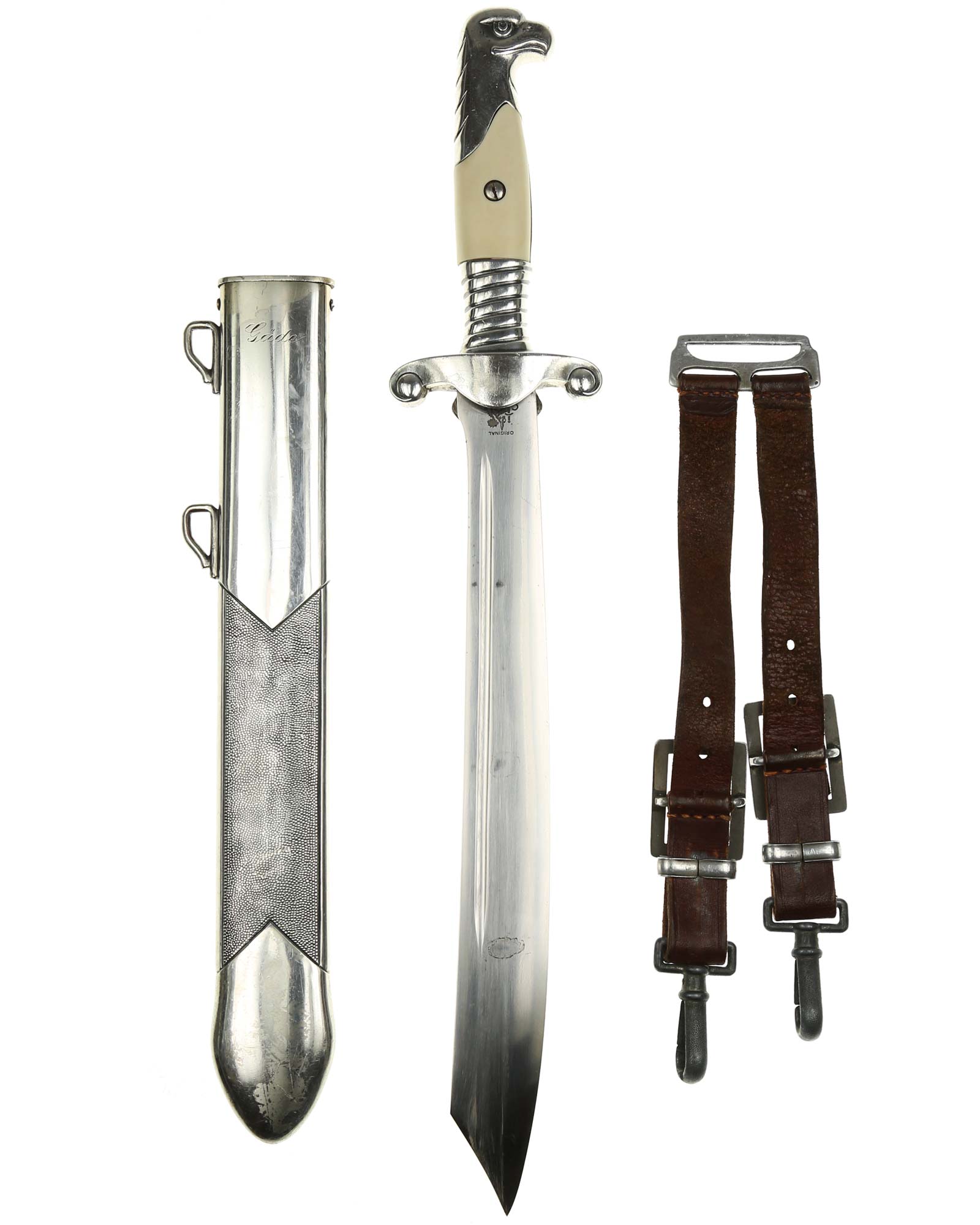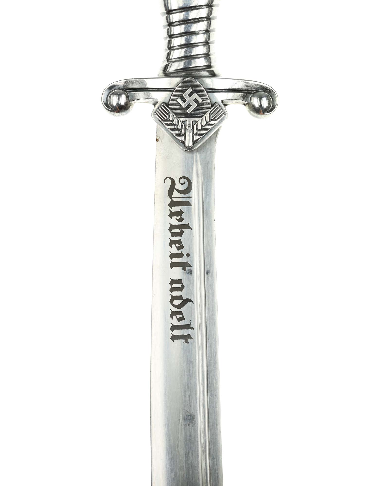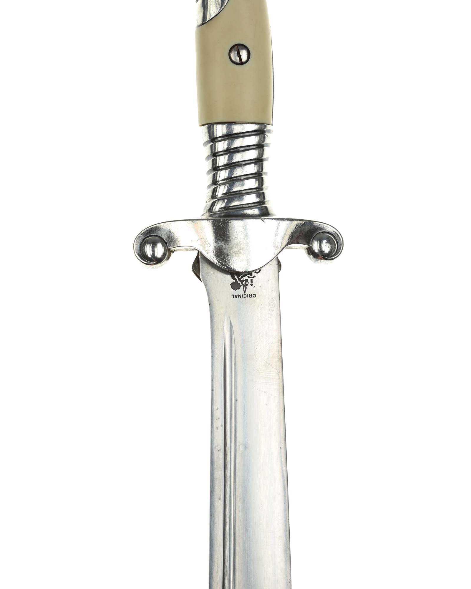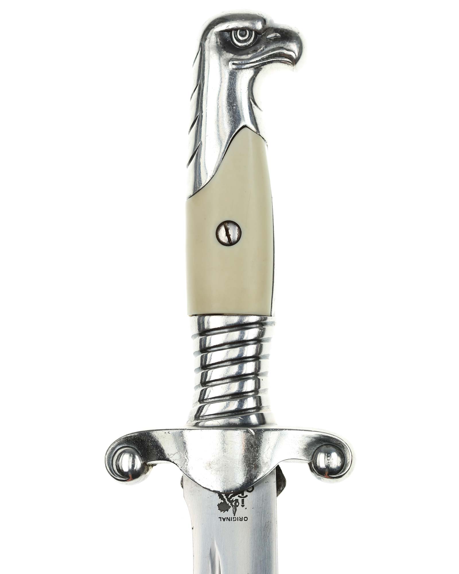 Клинок: Клинок стальной, плоский, однолезвийный, никелированный. Вдоль обуха на половину длины клинка идет узкий дол. На лицевой стороне имеется надпись готическим шрифтом — «Arbeit adelt» — «Труд облагораживает». На пяте клинка имеется клеймо известного производителя - Сarl Eickhorn, Solingen, изображение белки с мечом и надпись Original Eickhorn, клеймо немецкой фирмы «Карл Айкхорн», Золинген.