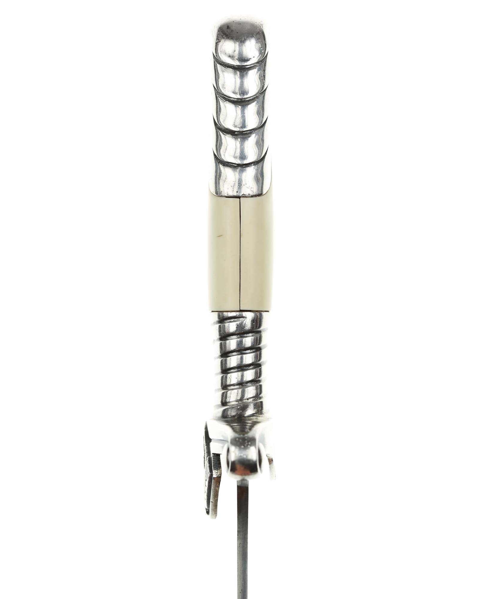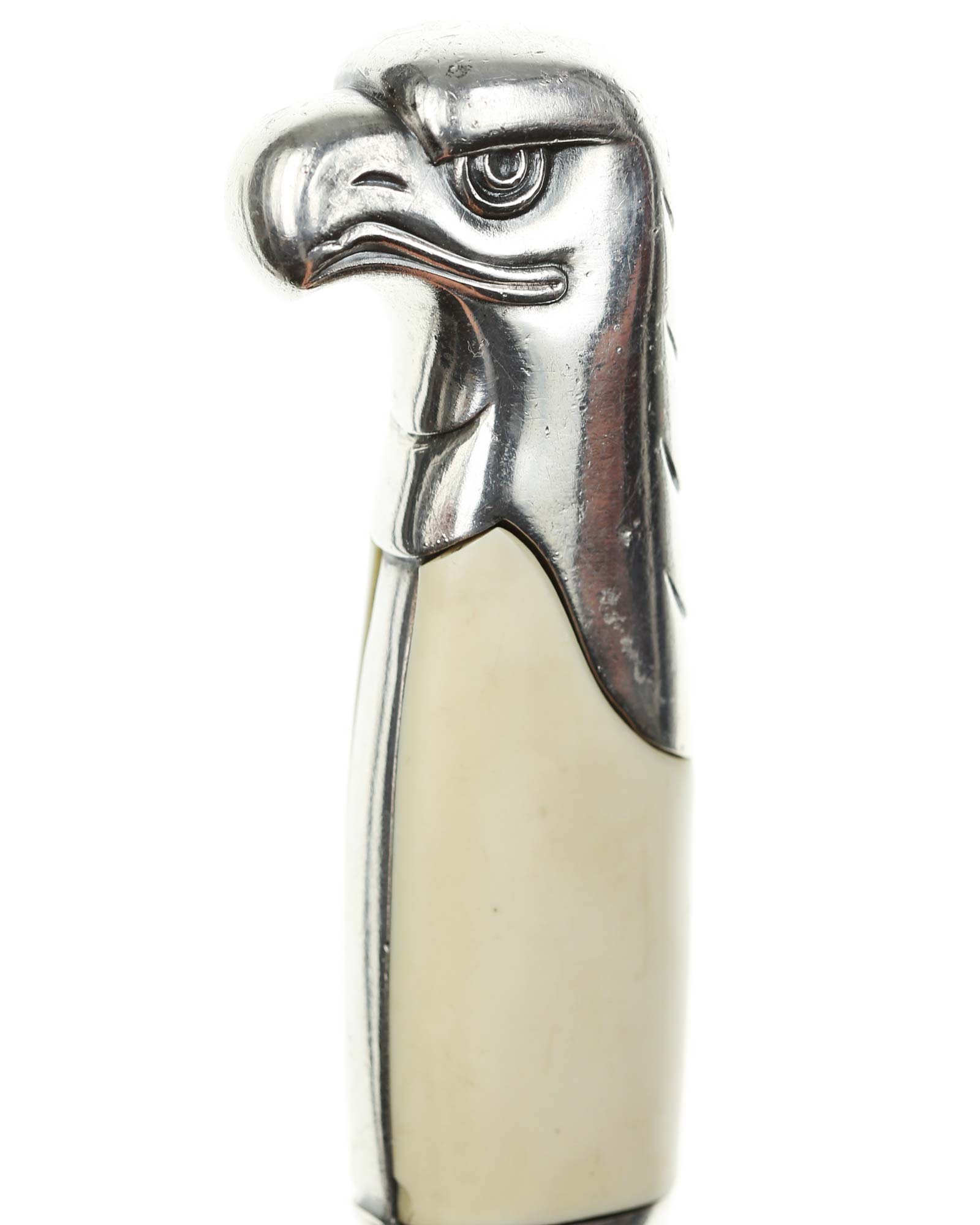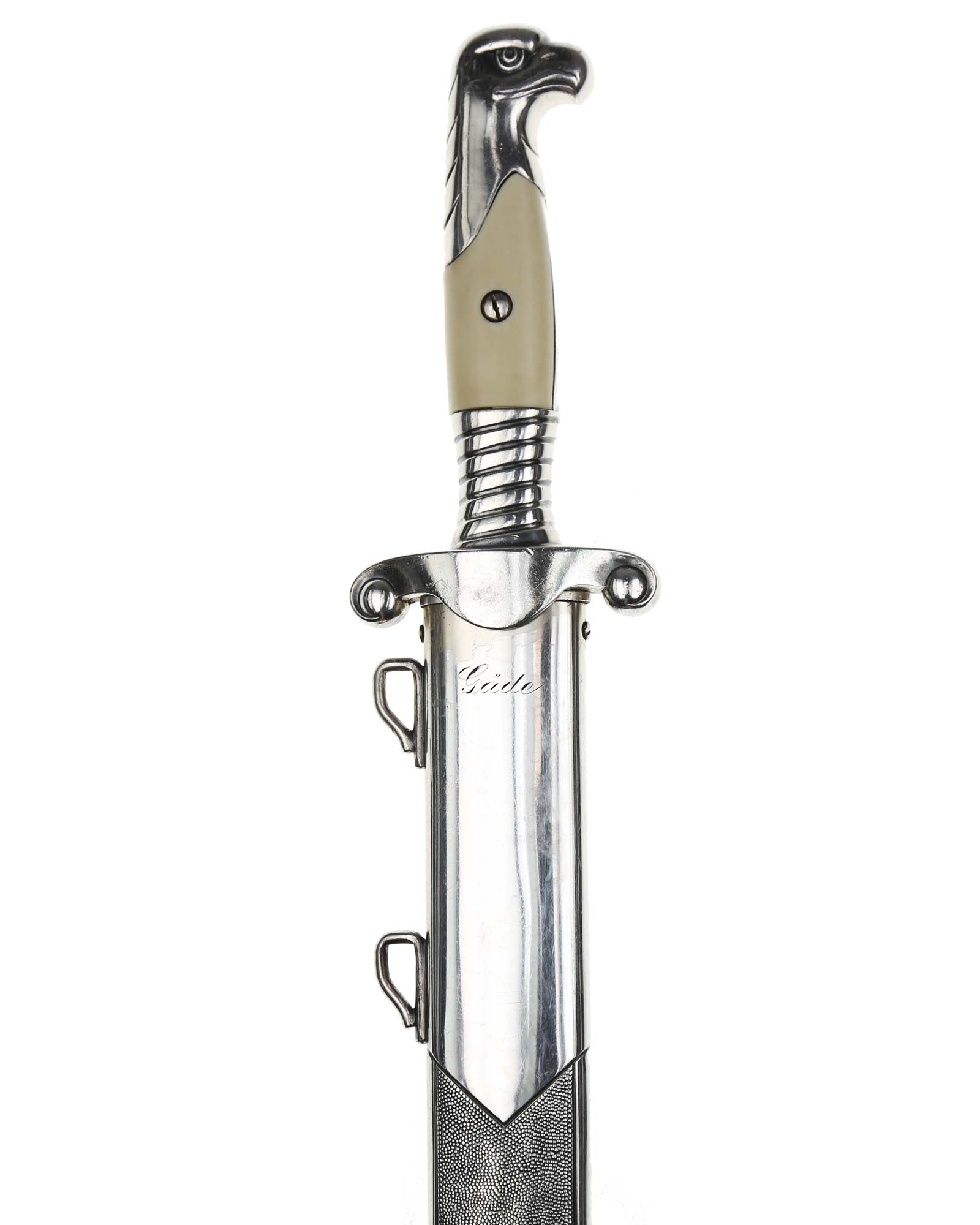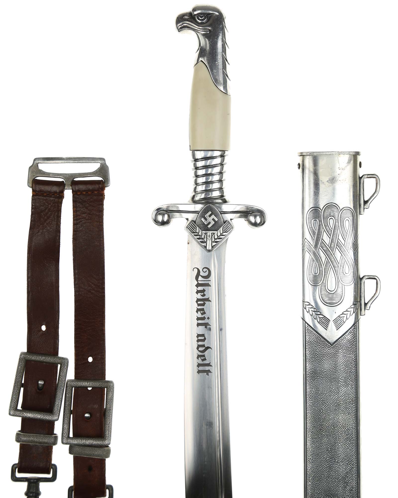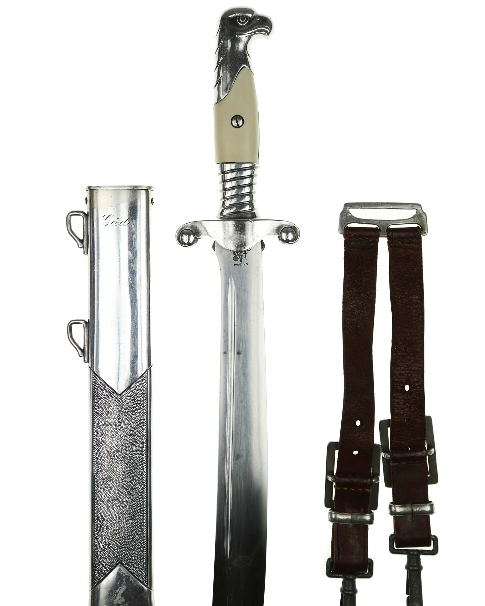 Клинок: Клинок стальной, плоский, однолезвийный, никелированный. Вдоль обуха на половину длины клинка идет узкий дол. На лицевой стороне имеется надпись готическим шрифтом — «Arbeit adelt» — «Труд облагораживает». На пяте клинка имеется клеймо известного производителя - Сarl Eickhorn, Solingen, изображение белки с мечом и надпись Original Eickhorn, клеймо немецкой фирмы «Карл Айкхорн», Золинген.