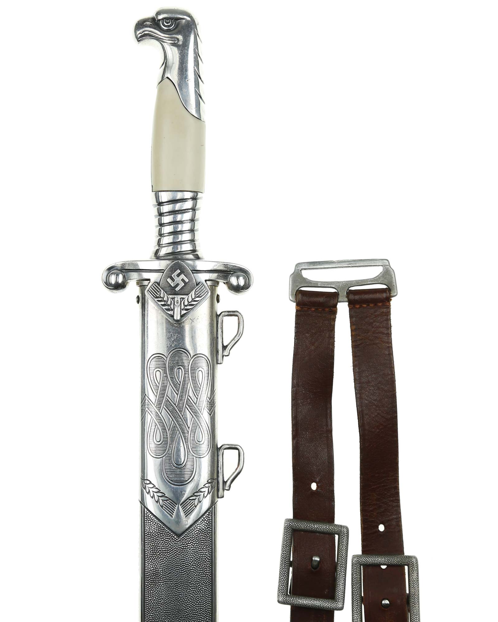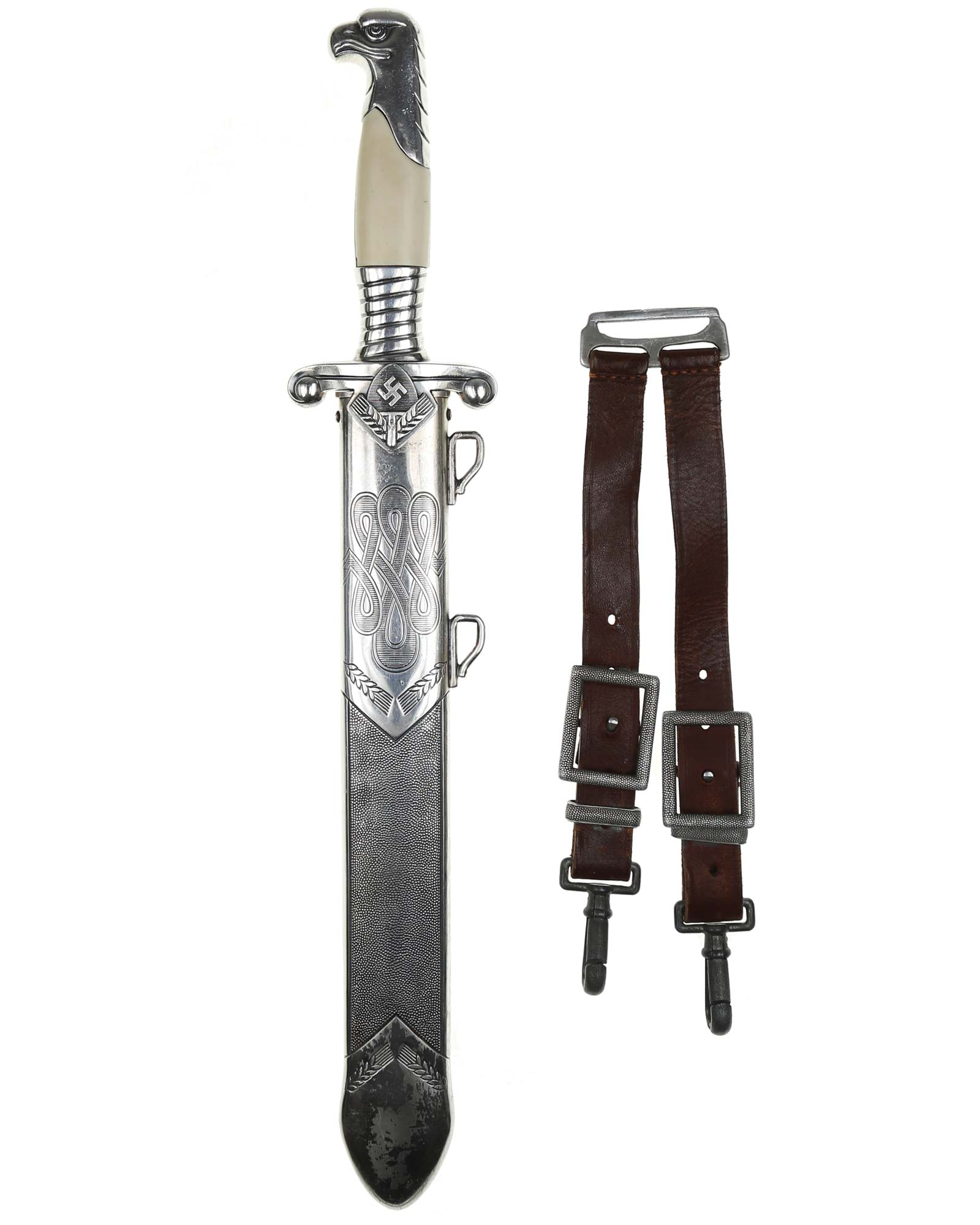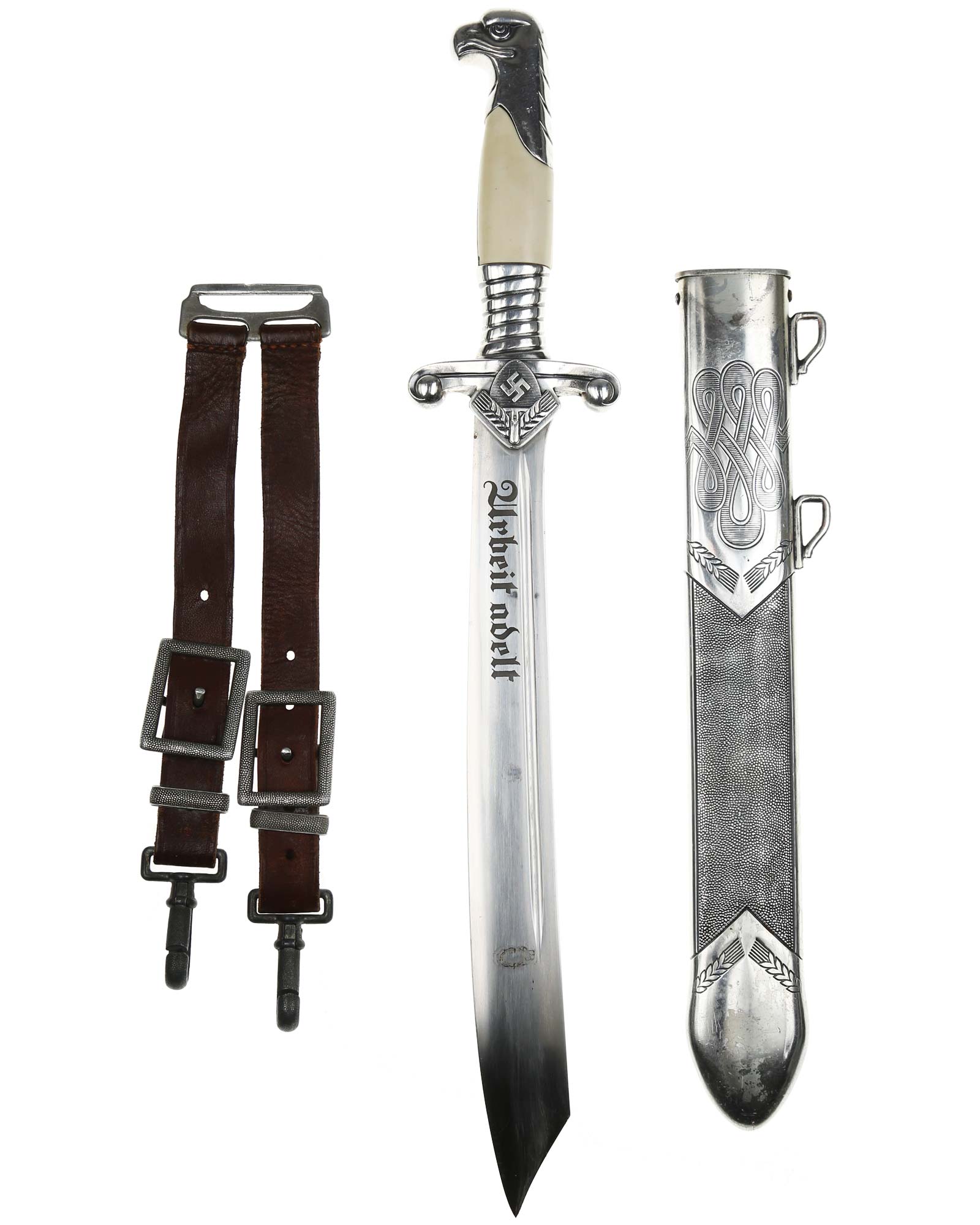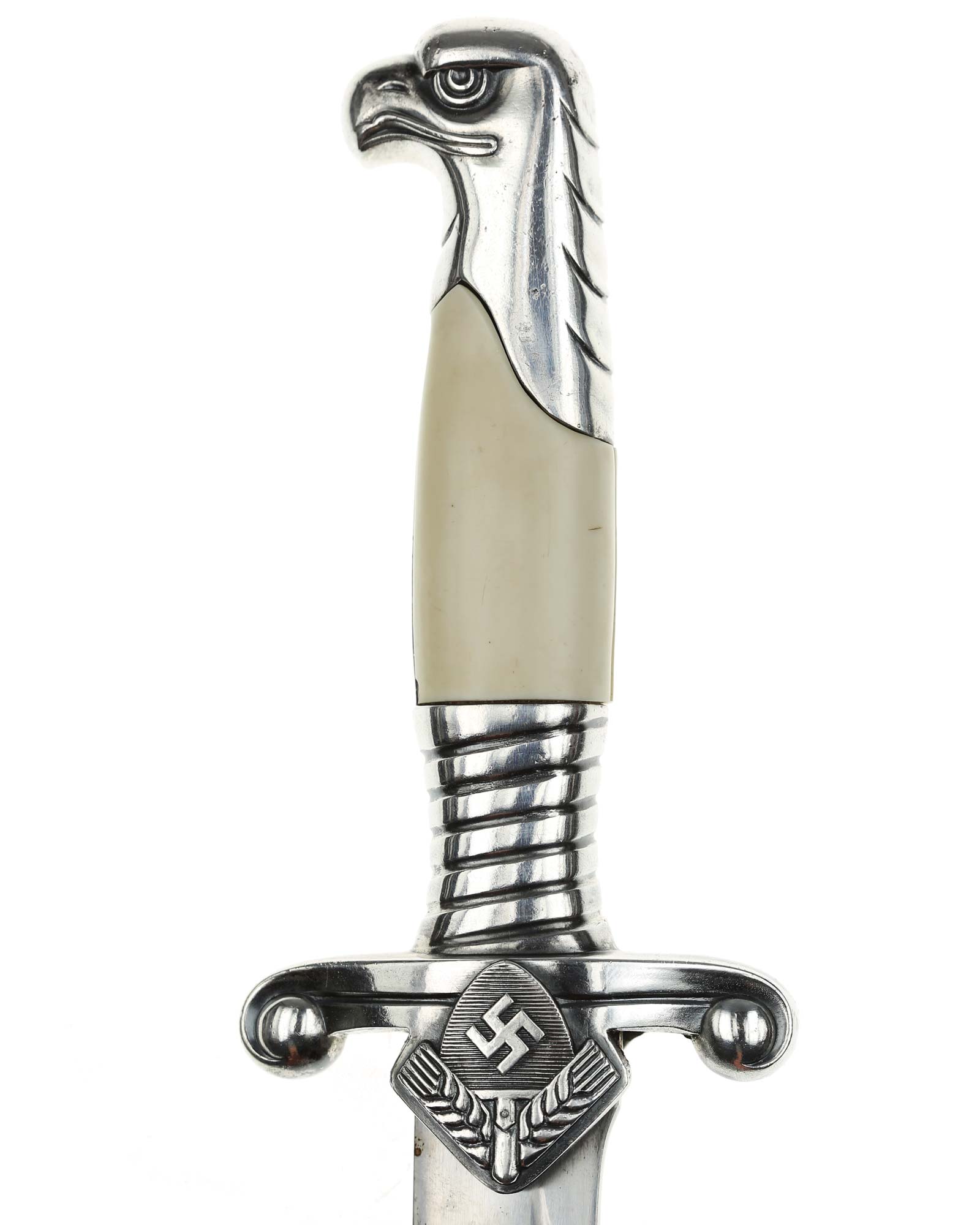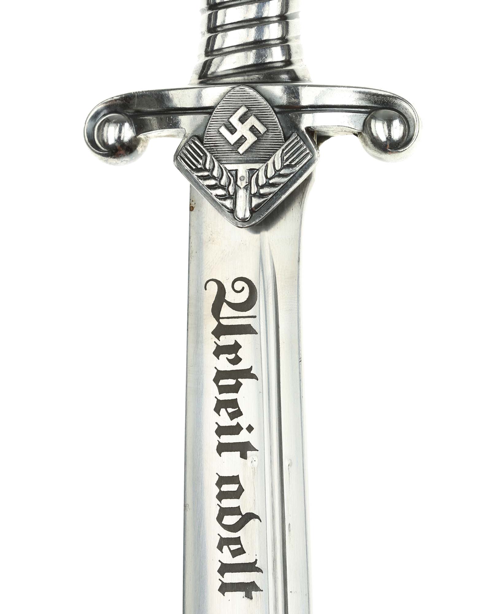 Рукоять: Эфес состоит из рукояти и крестовины. Рукоять металлическая, с двумя белыми пластмассовыми накладками, крепится на хвостовике проходящим через накладку винтом. Головка рукояти литая, металлическая, в виде головы орла, клювом повернута в сторону лезвия. Нижняя гайка массивная, украшена спиральным желобком. Крестовина прямая, плоская, с продольной бороздкой, со скругленными, загнутыми книзу окончаниями. На перекрестье с лицевой стороны расположен ромбический щиток с эмблемой Трудового фронта — свастика на фоне лопаты и колосьев.