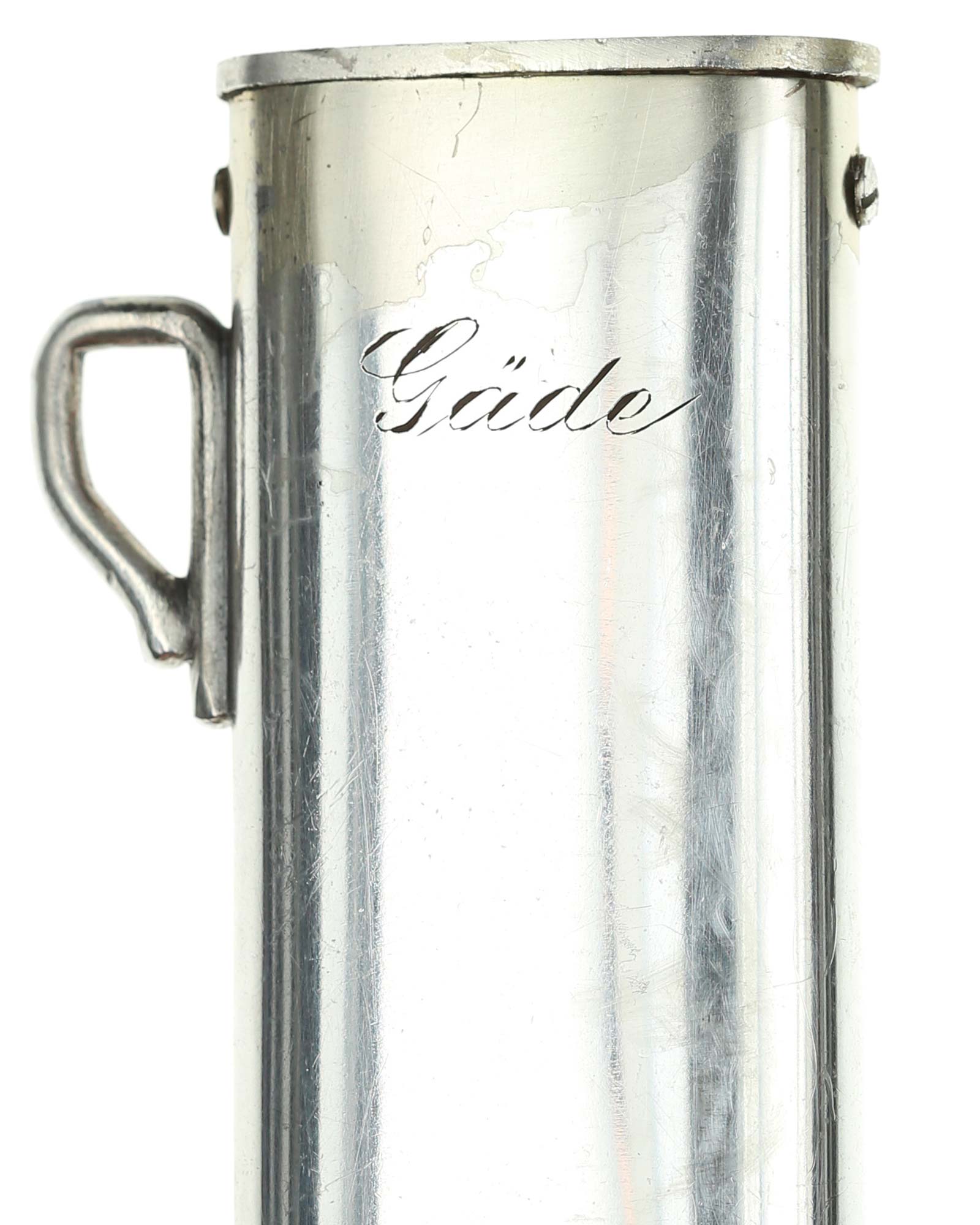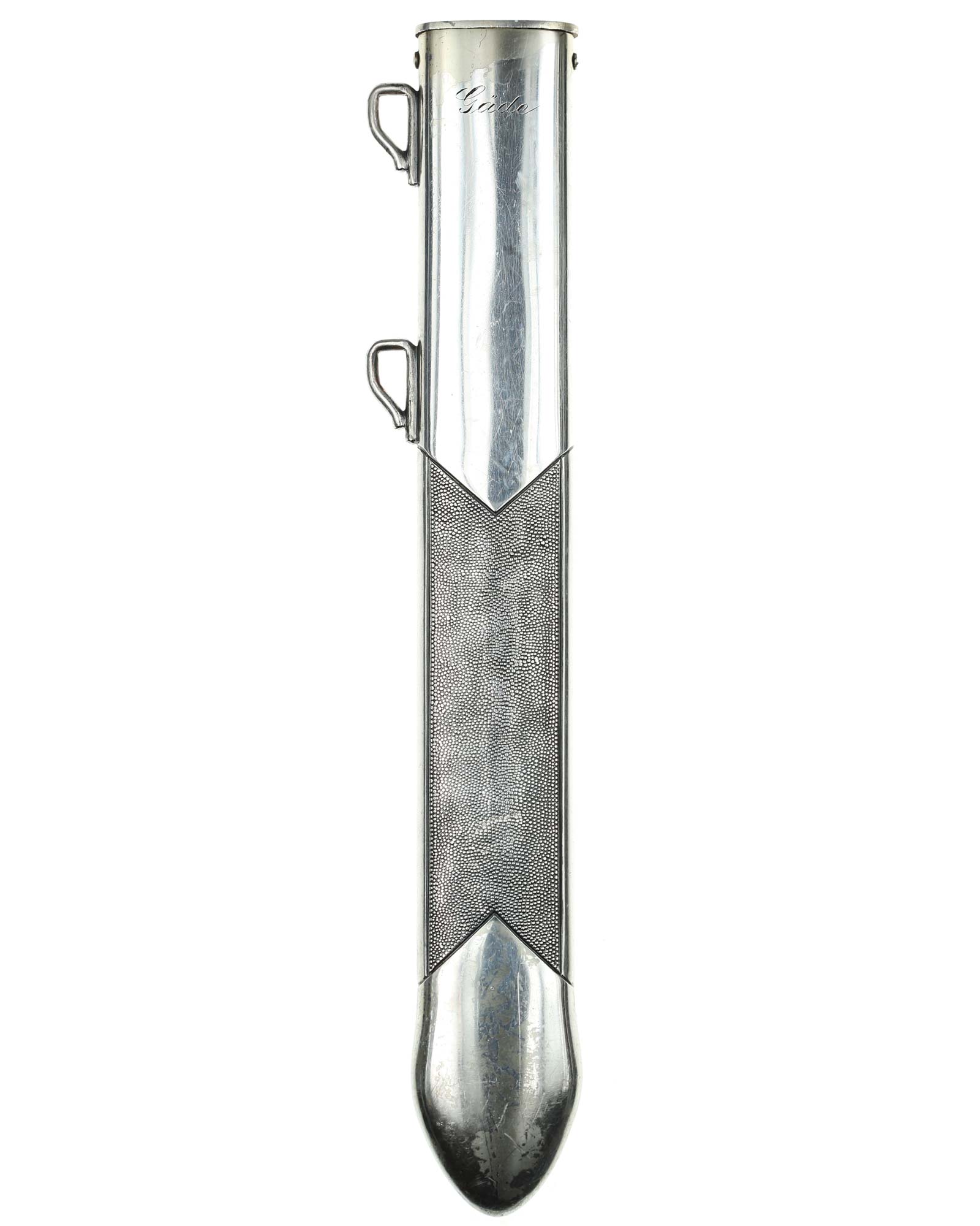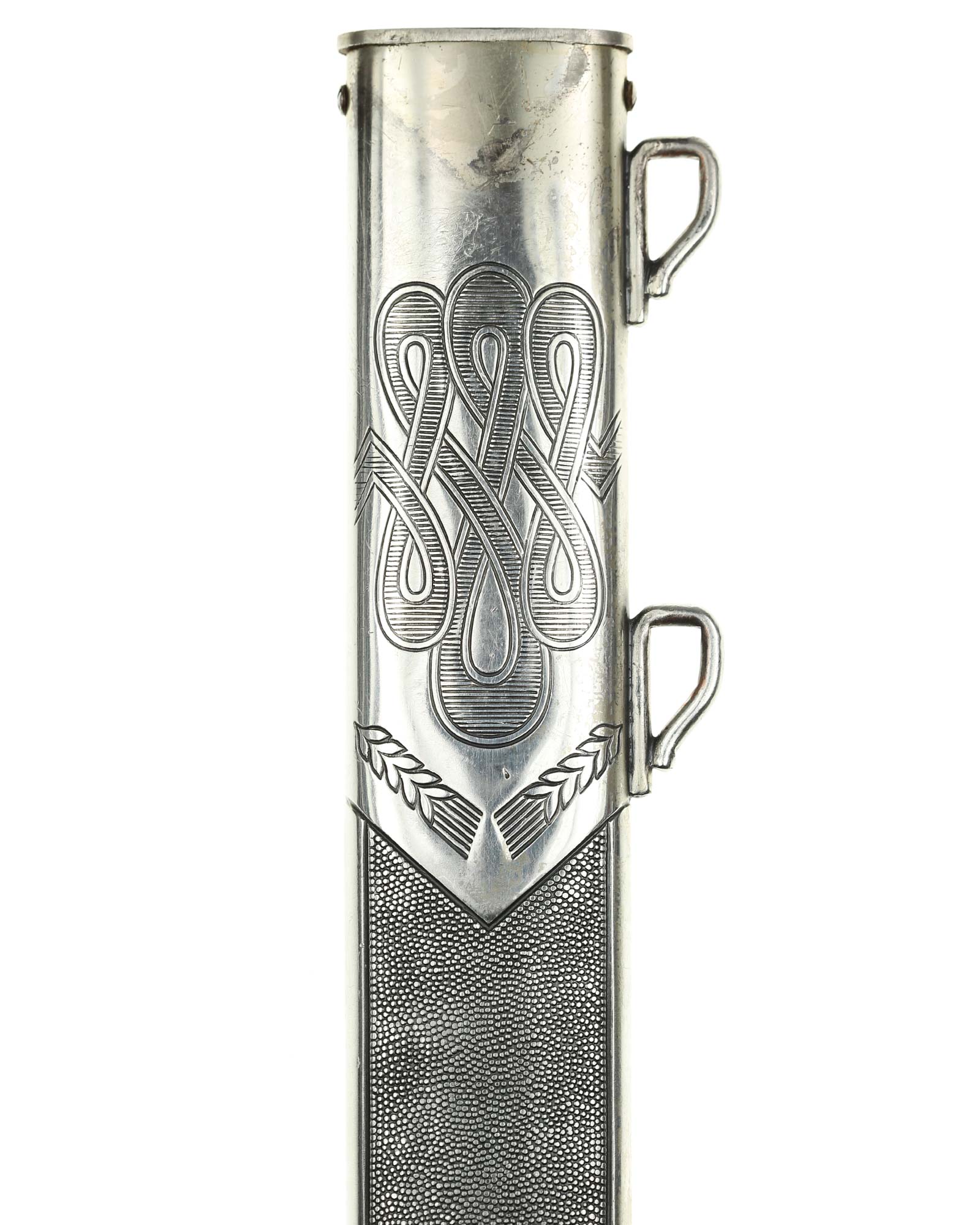 Ножны: Ножны прямые, алюминиевые, с точечным фоном. Прибор ножен со стоит из тонкого устья и двух крючков для крепления ремней портупеи, припаянных сбоку. Верхняя часть ножен и наконечник с гладким фоном украшены геометрическим орнаментом и изображениями колосьев.